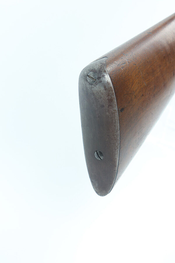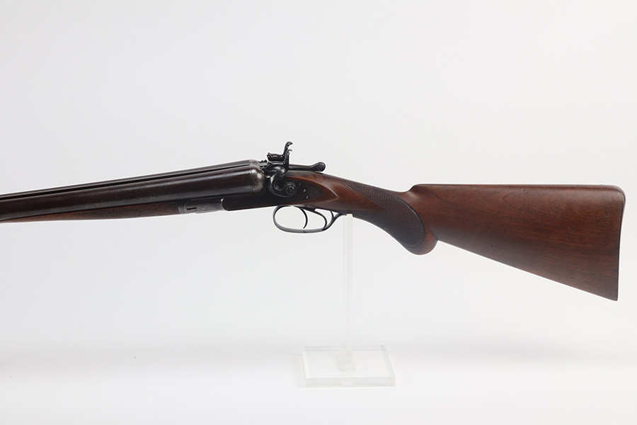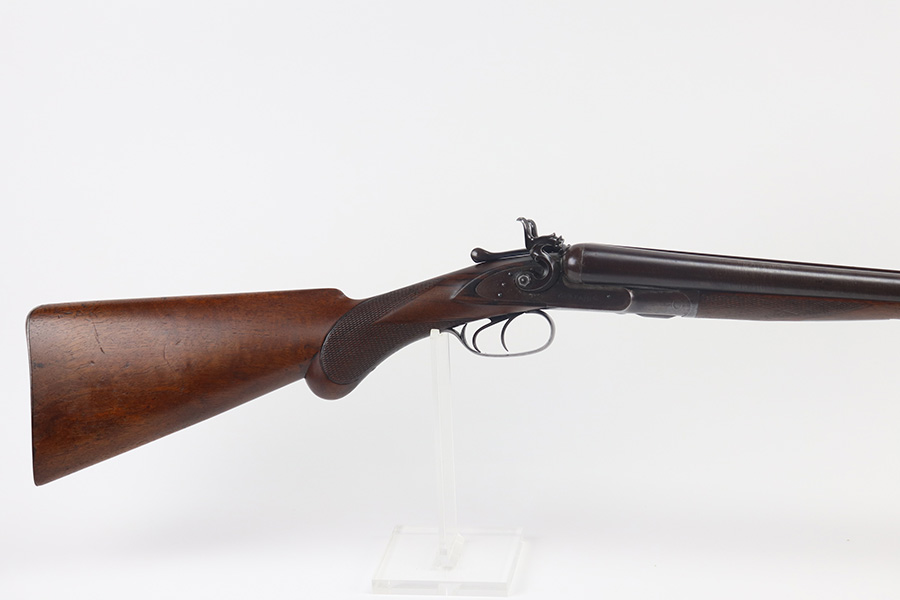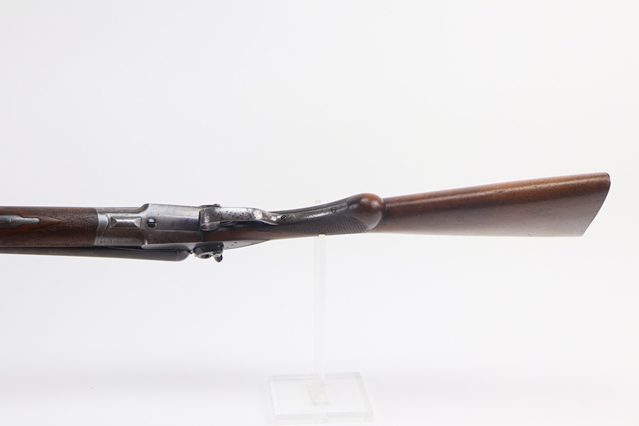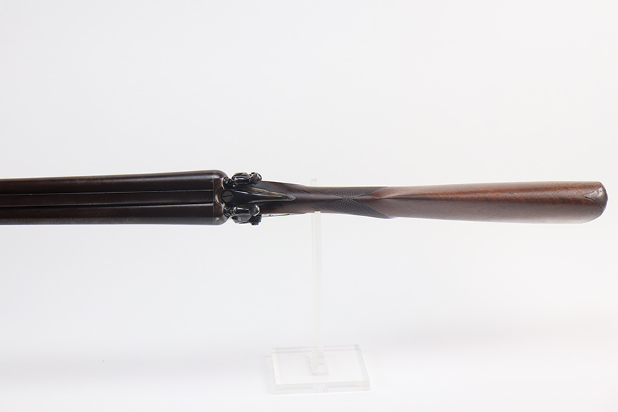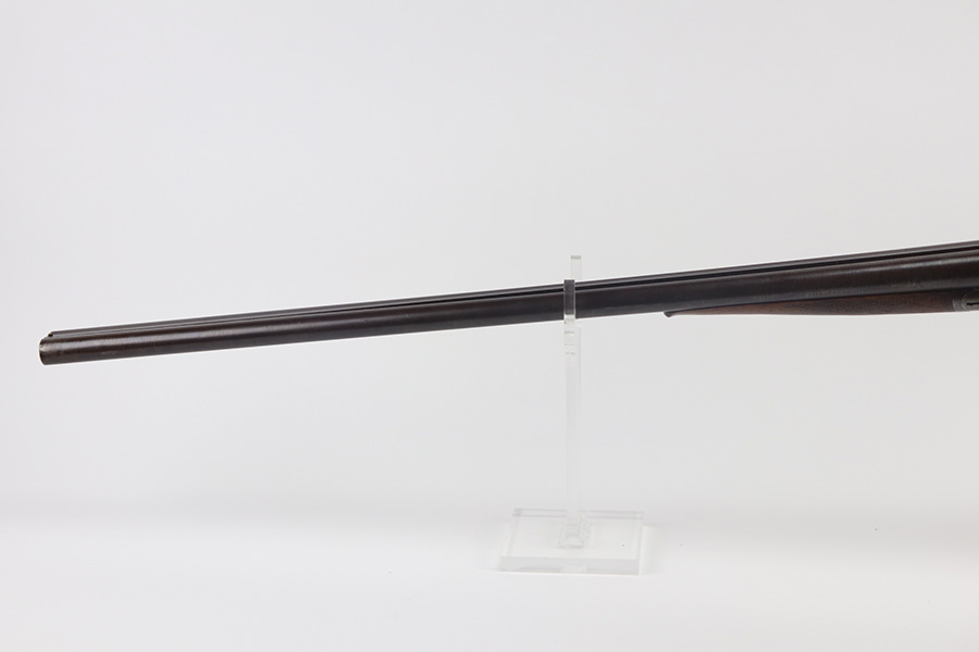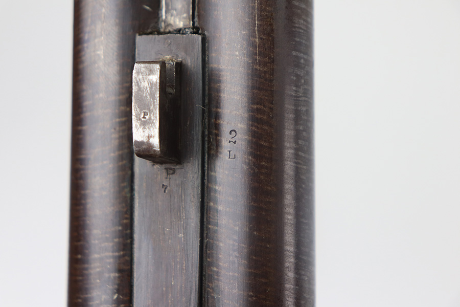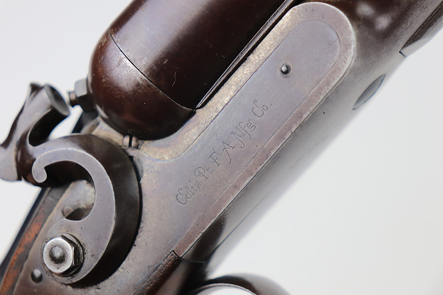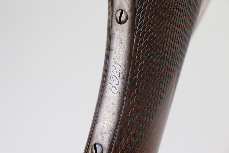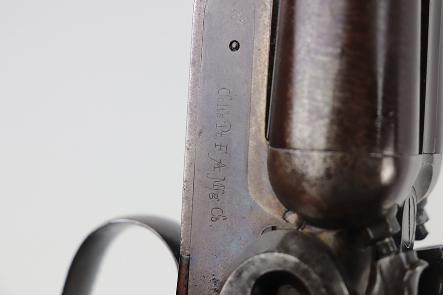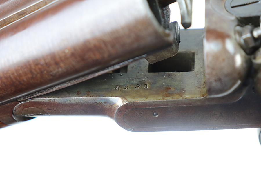 5/21/21 – This is a nice example of a Colt Model 1878 Hammer shotgun made in 1881. The gun is all matching and fully functional. Overall, the gun is in nice condition. It has retained much of its original case hardening on the inside of the foregrip and receiver. The case hardening is worn on the outside of the receiver. Much of the damascus pattern on the barrels is still in tact but slightly worn. There is dark brown patina throughout and small areas of minor pitting here and there. Excellent hand-checkered stock with minor dings here and there. Excellent, shiny bores. 30″ barrels. Full choke. 14.25″ LOP.