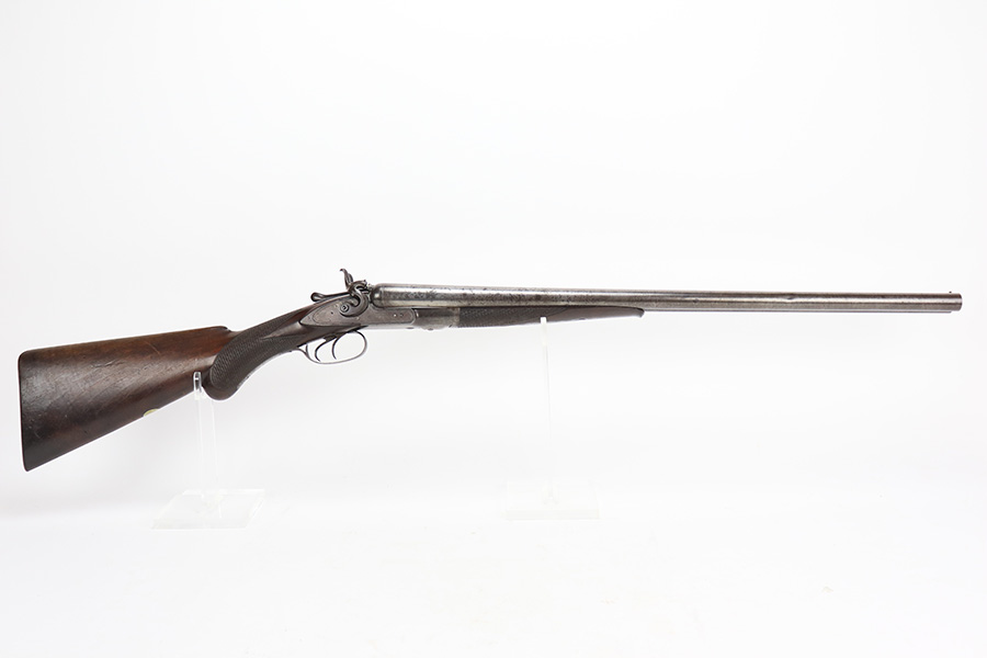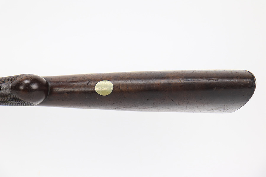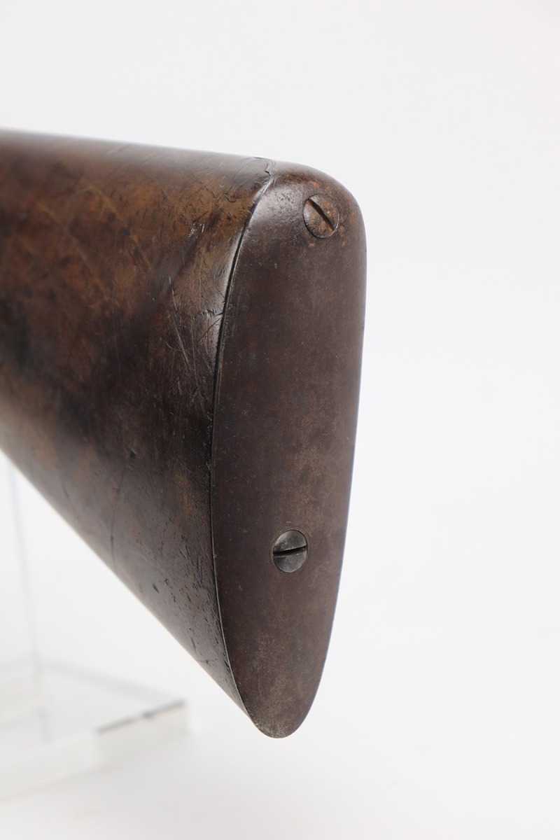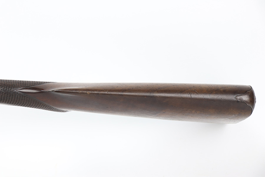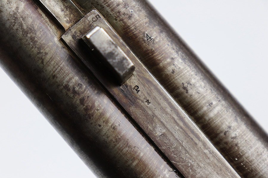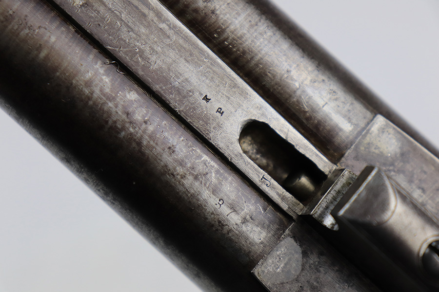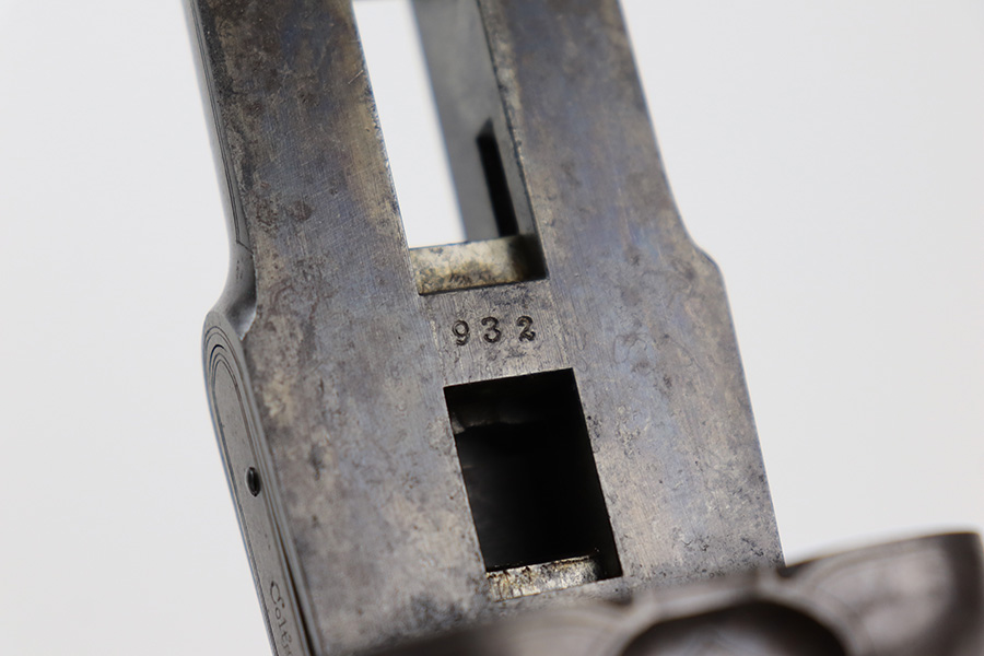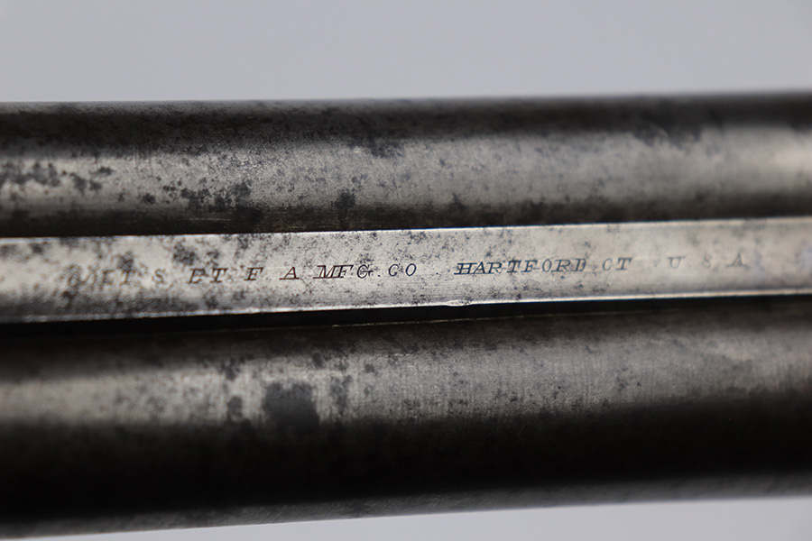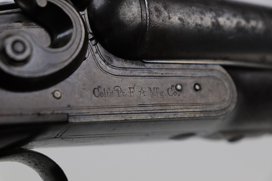 6/7/23 – This is a nice example of a Colt Model 1878 Hammer shotgun made in 1878. The gun is all matching and fully functional. Overall, the gun is in nice condition, almost all of the original finish is worn with brown “attic patina” and spotty oxidation throughout. The original damascus pattern on the barrels is barely visible in some places but mostly worn. The case-hardening on the receiver and small parts is almost entirely worn but still partially visible on the inside of the foregrip. No major damage to the original wood furniture, but there is minor scratching throughout. Heavy brown patina on the butt plate. The bores have minor pitting throughout. Everything seems to function as it should.