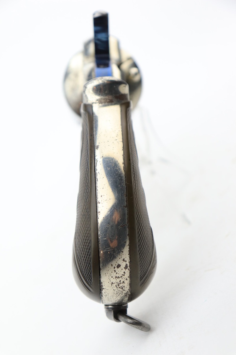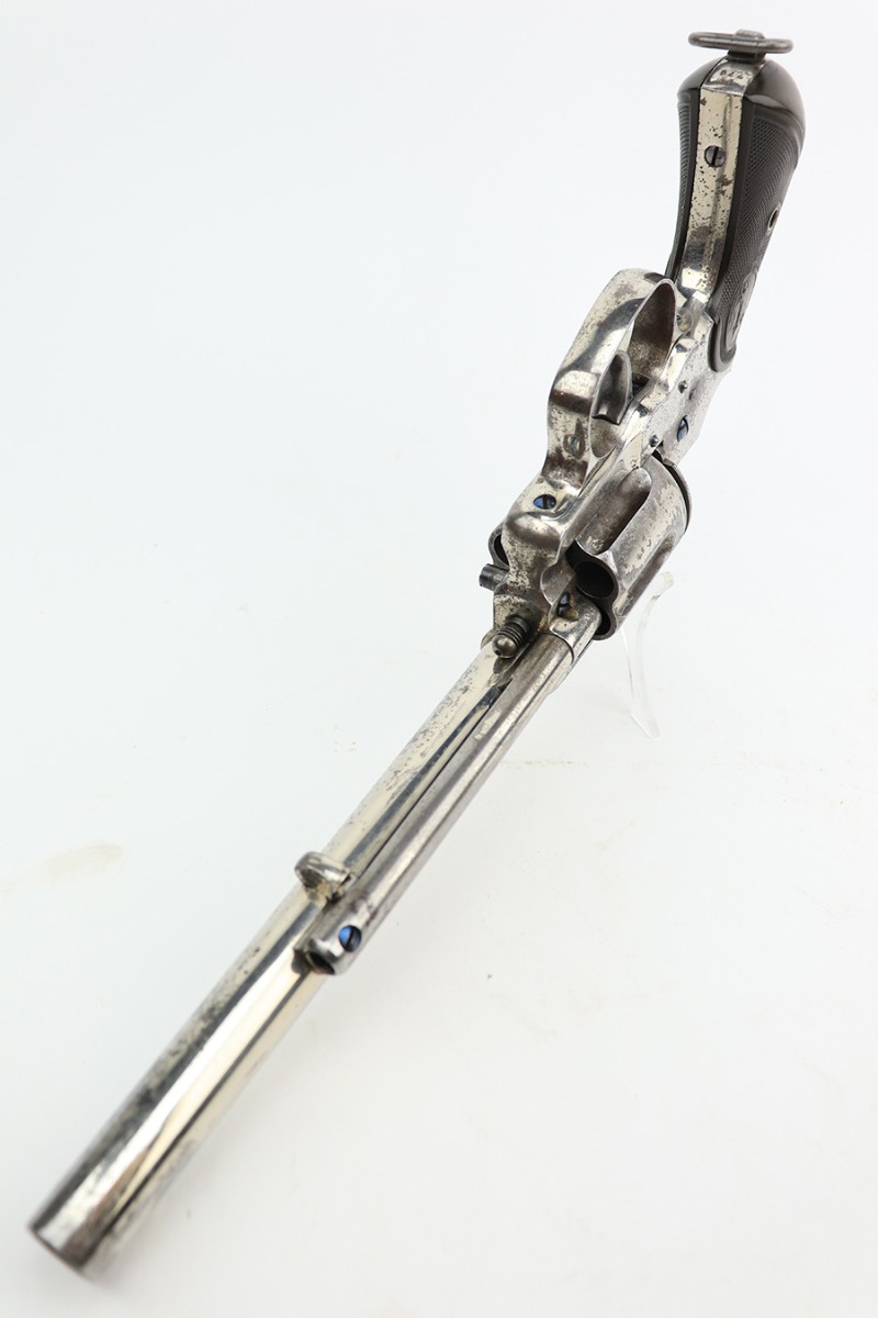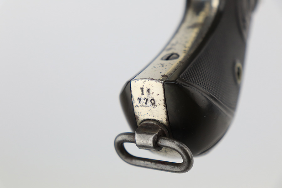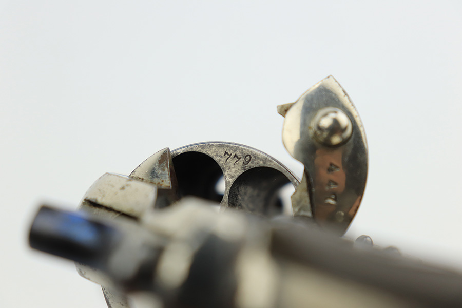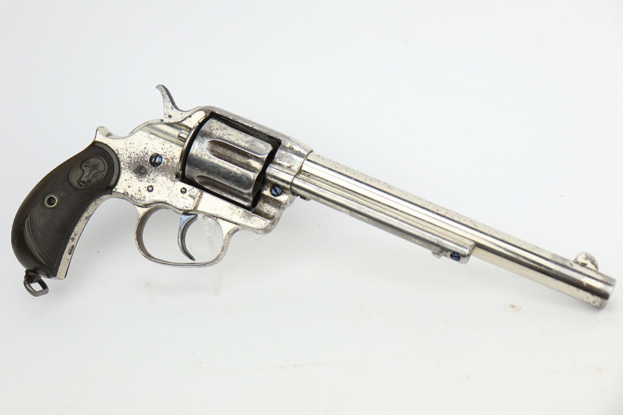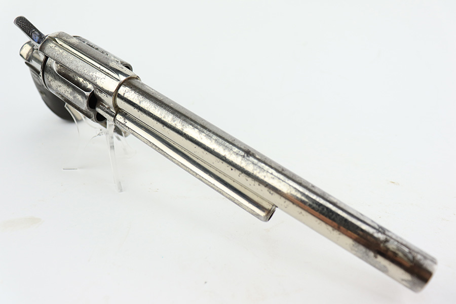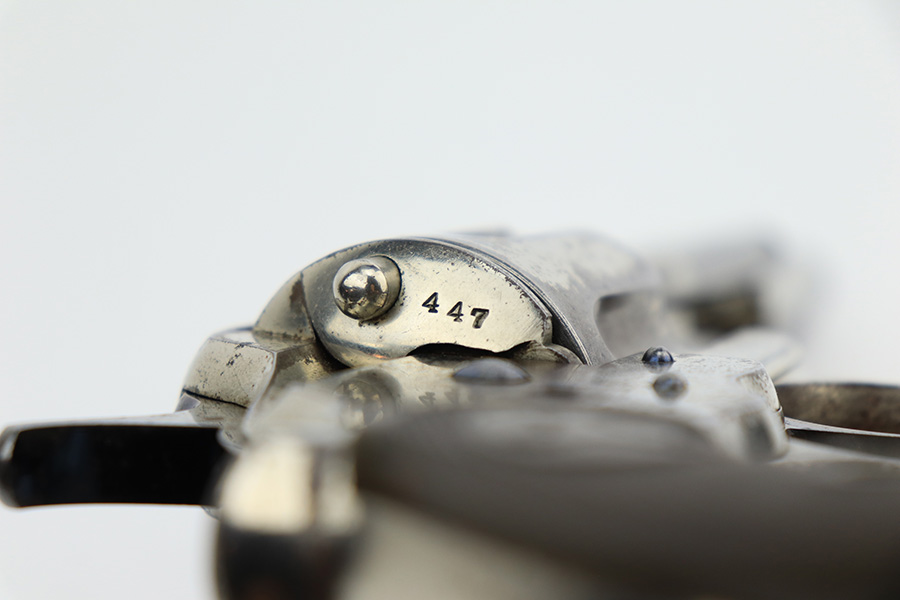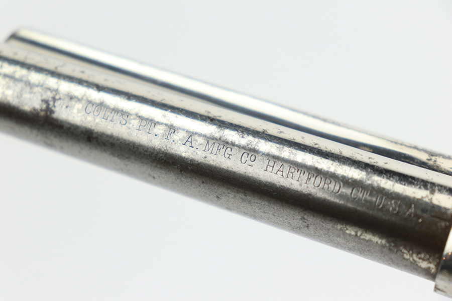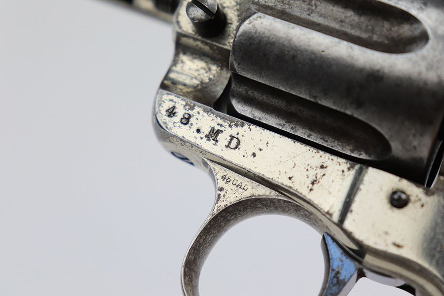 5/18/23 – This is a nice example of a Colt Model 1878 revolver, chambered in .45 Colt. From the included factory letter, this gun has a factory-nickeled finish and was delivered to Hartley & Graham in New York on April 14, 1885. All matching. This one has a “48.MD” marking on the left side of the frame, which we assume to be some sort of unit marking. The gun itself has retained roughly half of its original nickeled finish with obvious spotty wear and spotty oxidation throughout. Some really nice fire bluing still visible on the small parts. Fitted with excellent hard rubber grips. The bore has pretty good rifling with very minor pin-pricking throughout. The cylinder is tight, and the action is smooth.