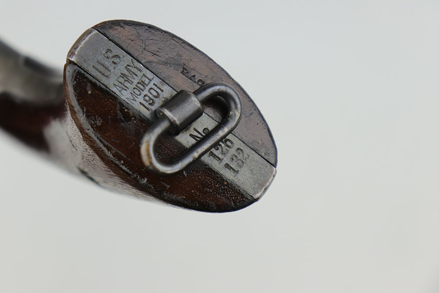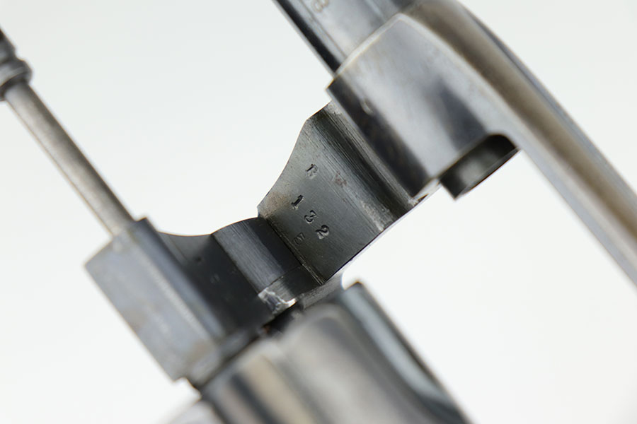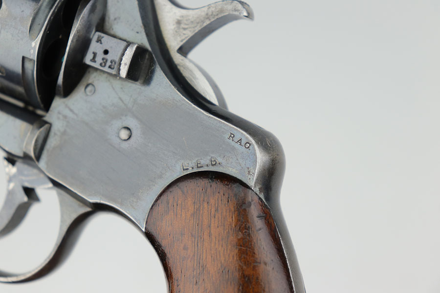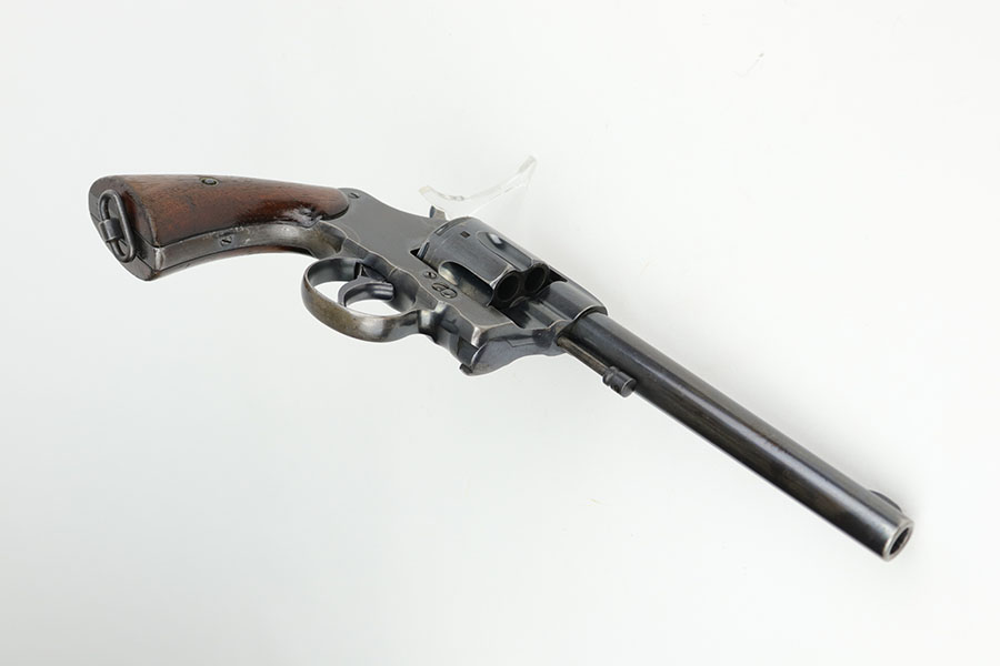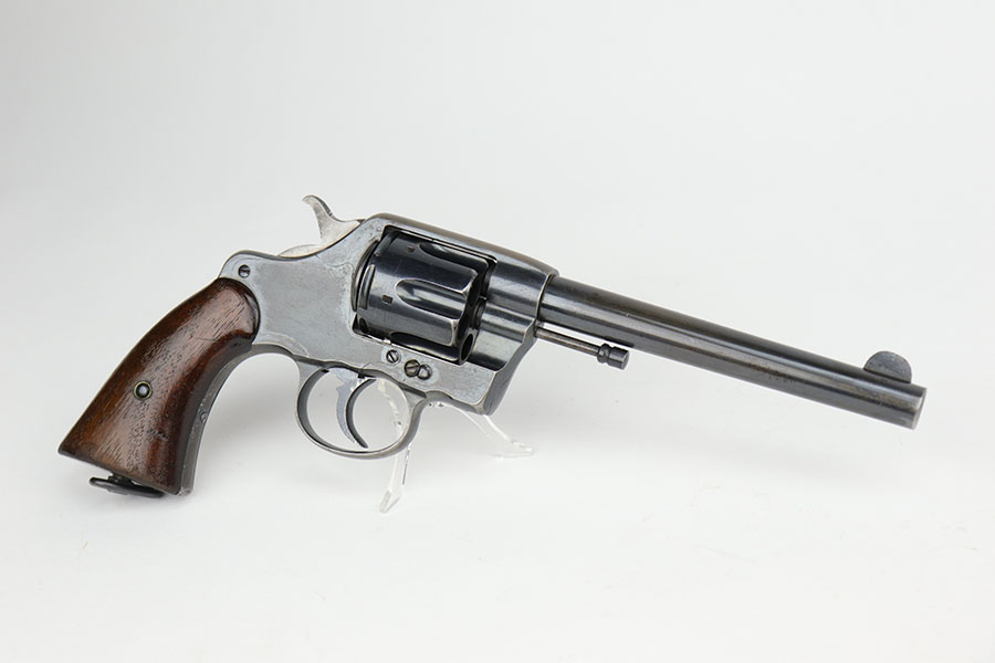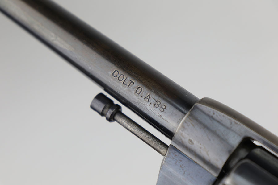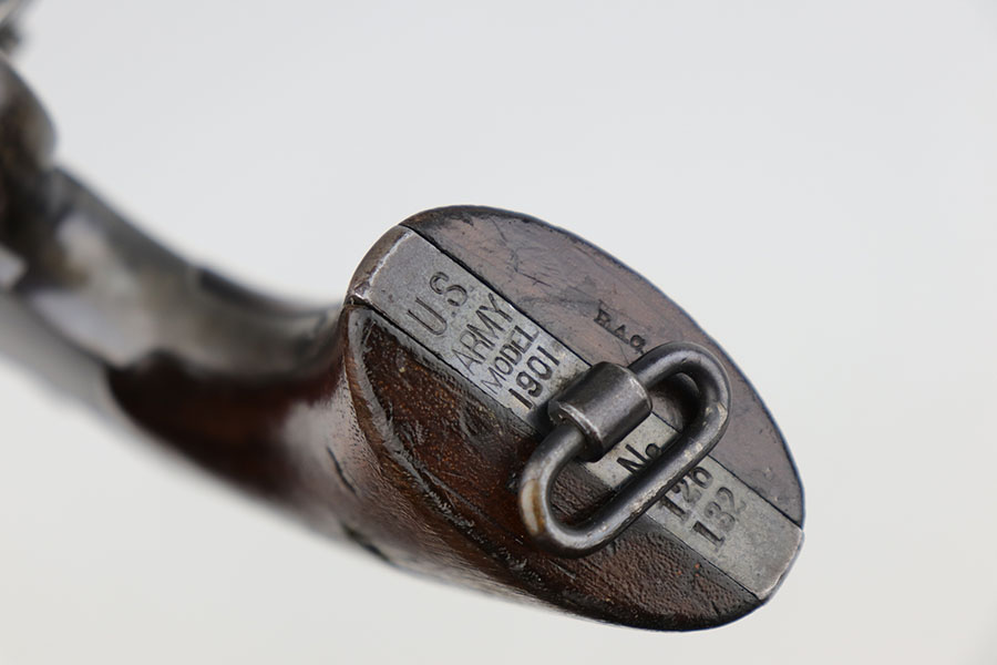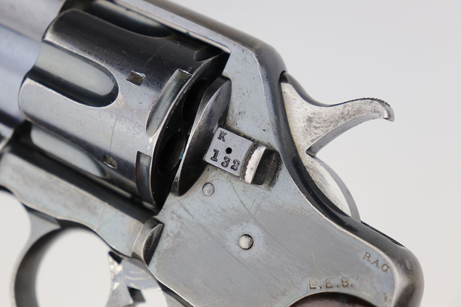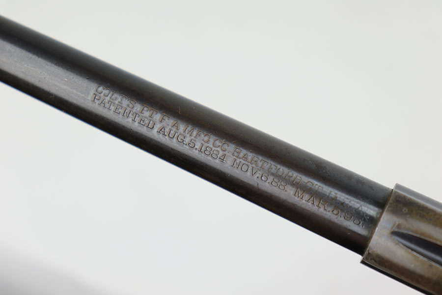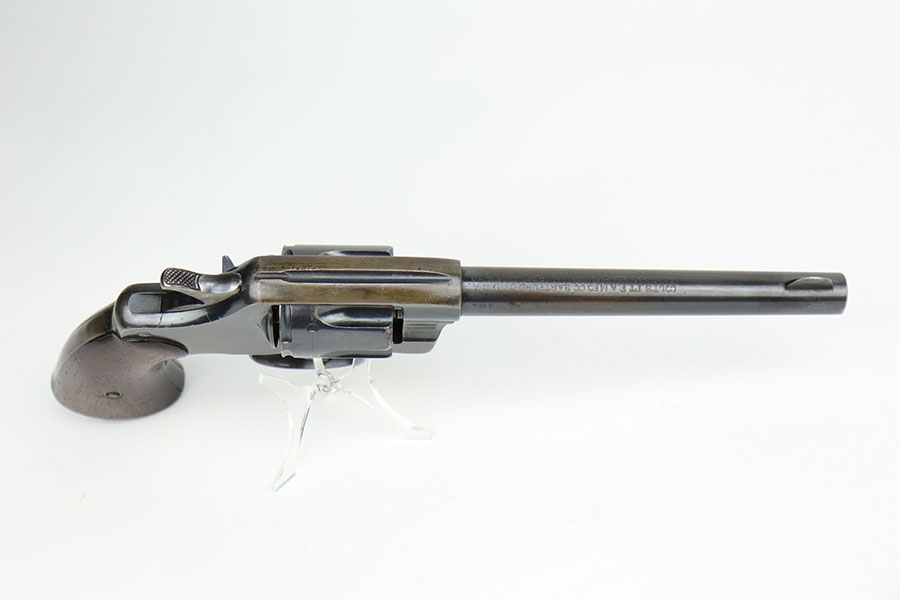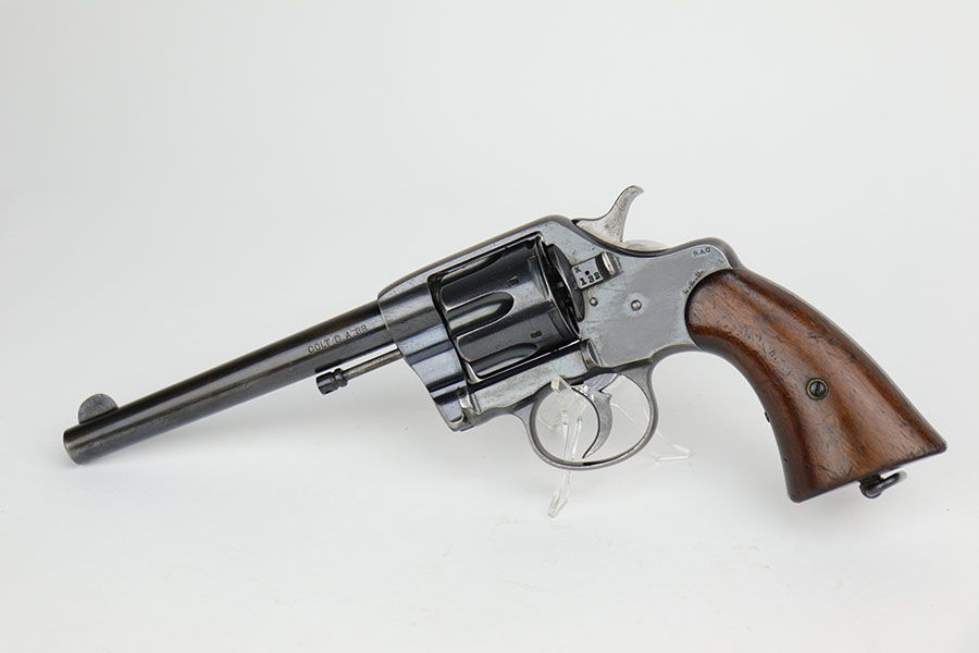 9/30/20 – This is a somewhat scarce military Colt Model 1901 that was made in 1899. The ‘Model 1901’ designation is actually when the gun was sent back to Colt for modification, in this case to have the lanyard ring added. The gun has all matching numbers and there is an RAC military inspection stamp on the left side of the frame, cylinder and bottom of the grip panels. The gun has some patina and thinning throughout, especially on the grip frame. Excellent bore. Mechanically correct.