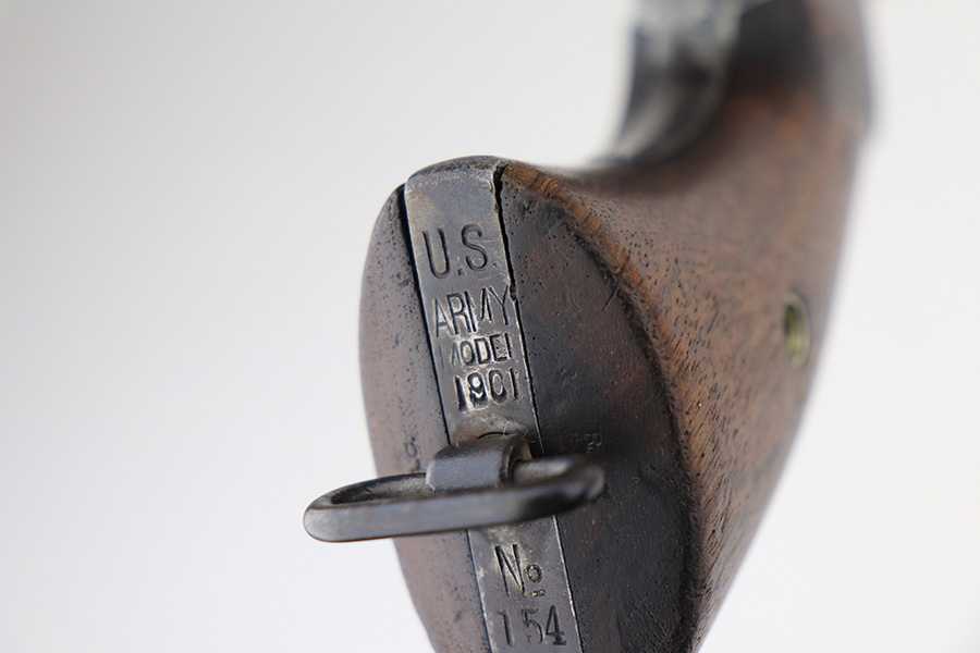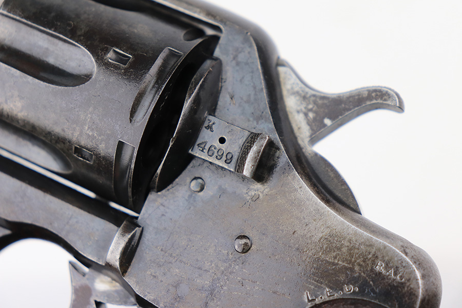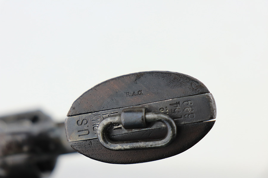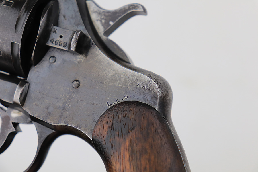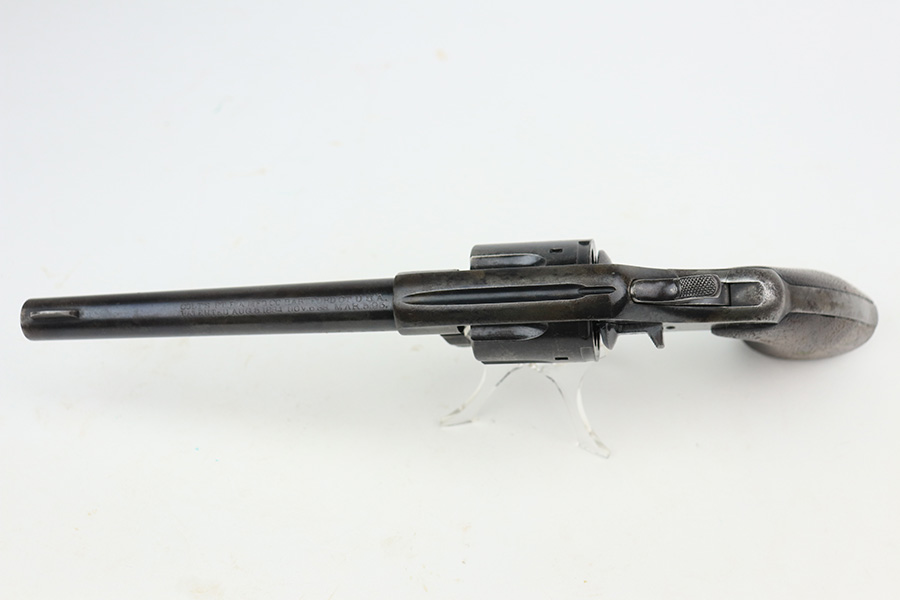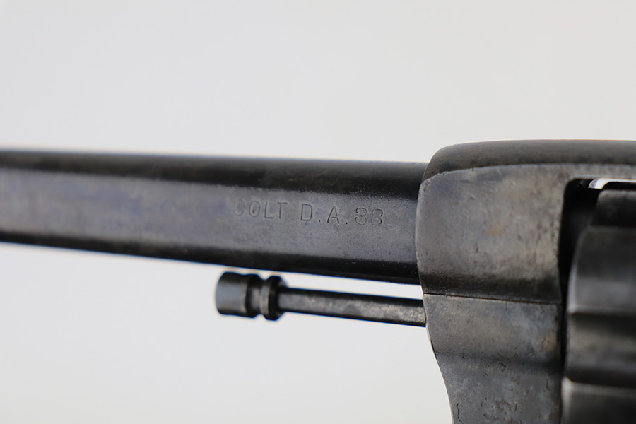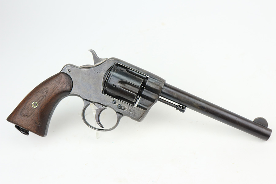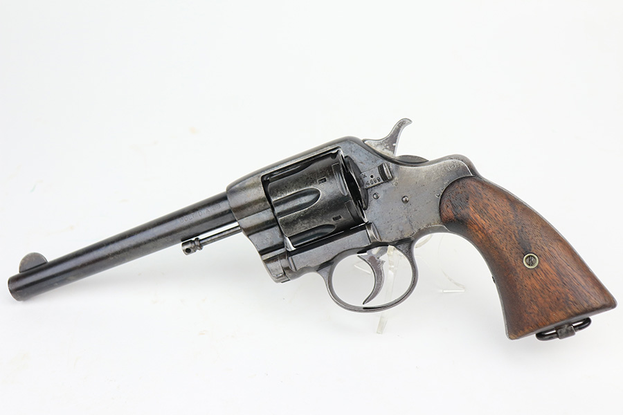 2/23/22 – This is a nice example of a Colt Model 1901 revolver issued to the US military in 1901. The gun is all matching, has the proper “L.E.B.” military inspection initials, and has the proper “R.A.C.” markings on the left side of the frame and on the bottom edges of each of the grip panels. LEB-marked revolvers were refurbishments done under contract by Remington. Capt. Leroy E. Briggs was the Remington’s inspector of these refurbished arms. Most, if not all, went to the US NAVY. The cylinder is tight and the action is smooth. It has retained roughly half of its original finish. There are areas of spotty wear, splotchy discoloration, and spotty oxidation throughout. The grips are hand-numbered on the inside and matching to the gun. There is a hairline crack and one small gouge in the wood on the right side. The bore has strong rifling but there are spotty areas of oxidation and tiny pitting.