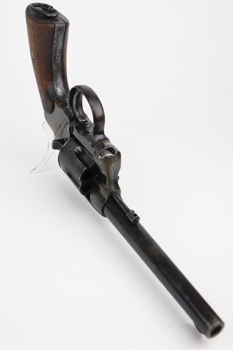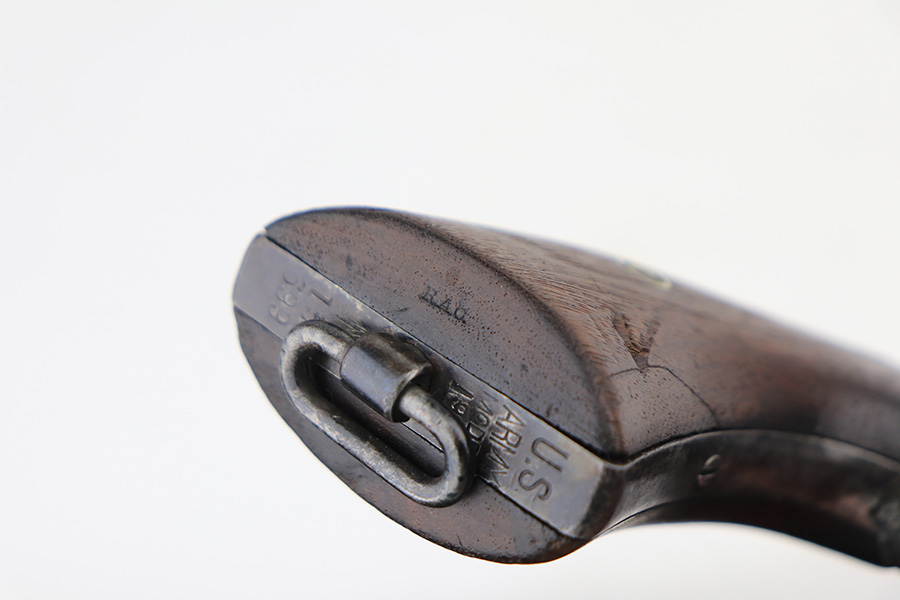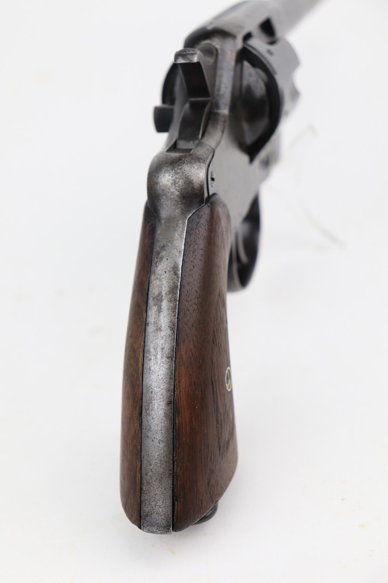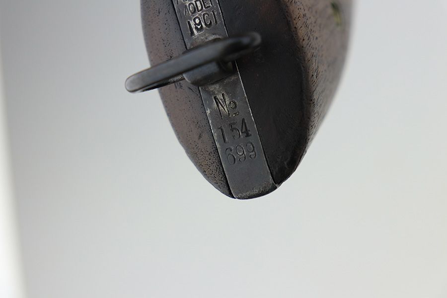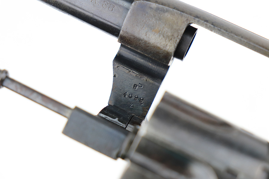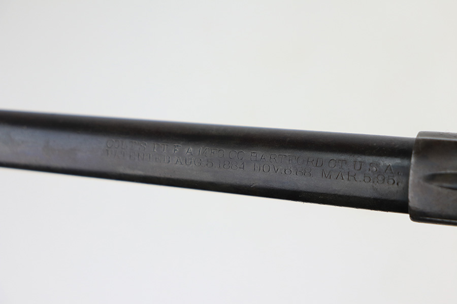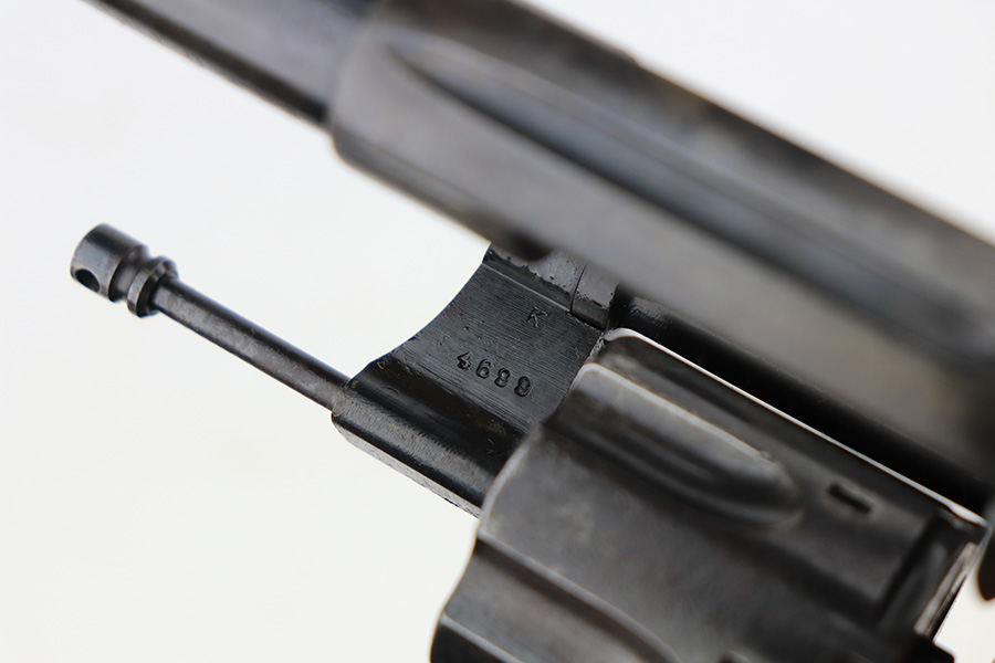 2/23/22 – This is a nice example of a Colt Model 1901 revolver issued to the US military in 1901. The gun is all matching, has the proper “L.E.B.” military inspection initials, and has the proper “R.A.C.” markings on the left side of the frame and on the bottom edges of each of the grip panels. LEB-marked revolvers were refurbishments done under contract by Remington. Capt. Leroy E. Briggs was the Remington’s inspector of these refurbished arms. Most, if not all, went to the US NAVY. The cylinder is tight and the action is smooth. It has retained roughly half of its original finish. There are areas of spotty wear, splotchy discoloration, and spotty oxidation throughout. The grips are hand-numbered on the inside and matching to the gun. There is a hairline crack and one small gouge in the wood on the right side. The bore has strong rifling but there are spotty areas of oxidation and tiny pitting.