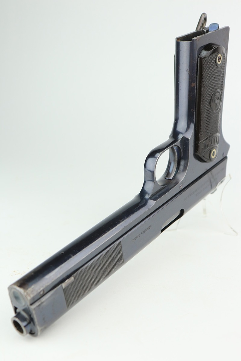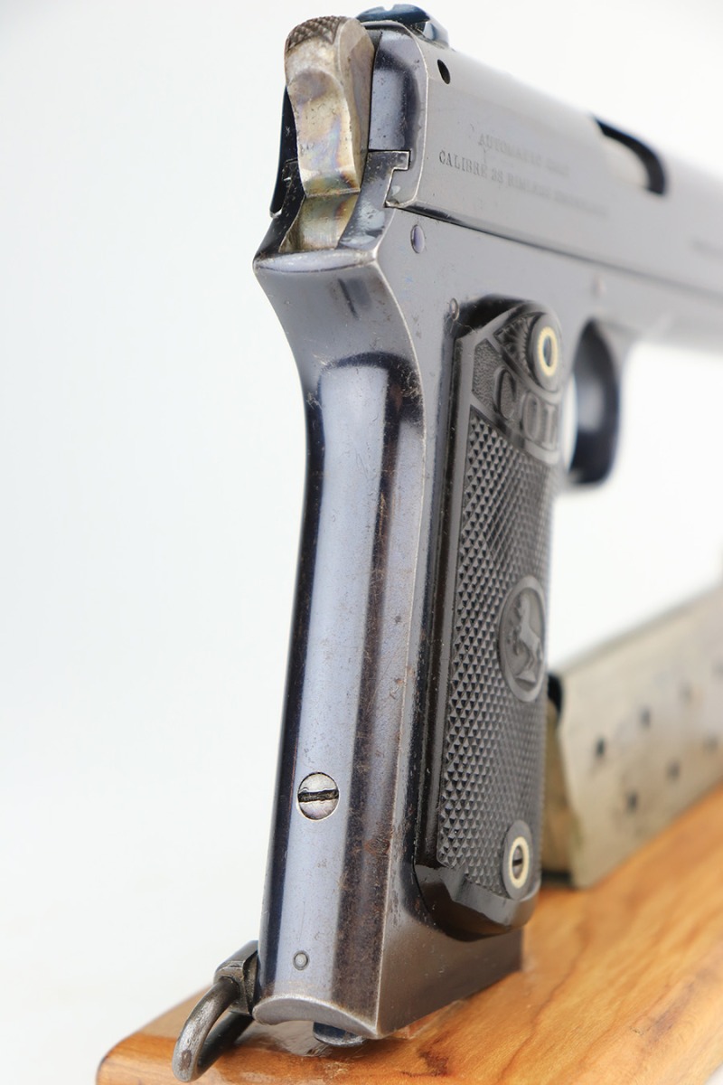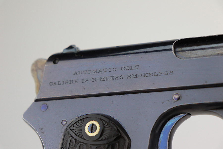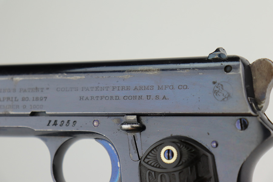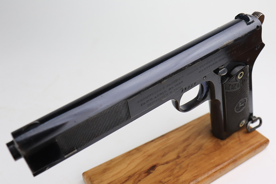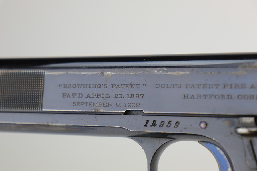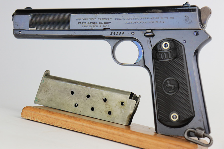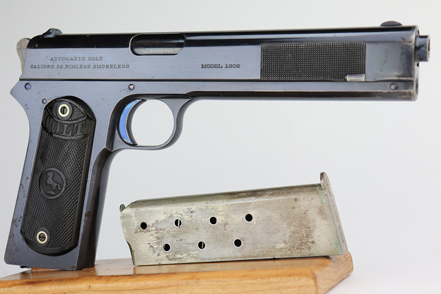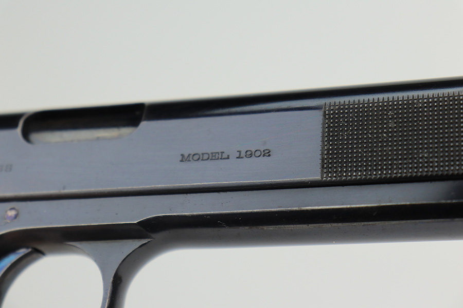 4/19/22 – This is a scarce Colt M1902 Military pistol that was made in 1902, the first year of production! Following the lackluster sales of the Colt Model 1900, Colt made some changes to appeal to the military requests in creating the Model 1902 Military. The pistol was given a larger frame so that it could hold an extra cartridge and provided a larger area for gripping. But the pistol was also given a slide-stop so that it could enable quicker reloading, and a lanyard ring was installed on the left side of the frame. The early models featured a rounded hammer, such as this one, and a checkered portion of the slide. A total of about 18,000 Military Model 1902’s were produced. This one has excellent Colt hard rubber grips, with just a small chip in the right panel. It has bluing loss along the high edges of the slide on both sides, and some oxidation on both straps. Minor pitting is visible on the right side of the frame, around the grip panel. Strong, shiny bore.