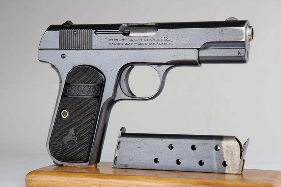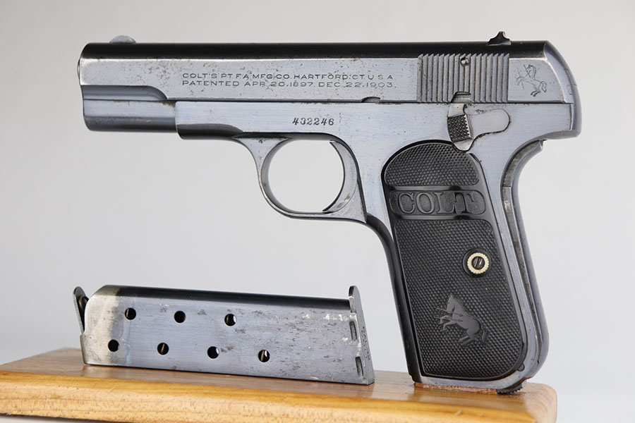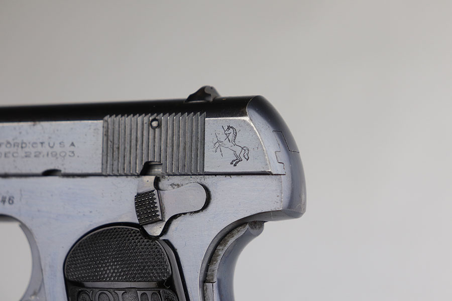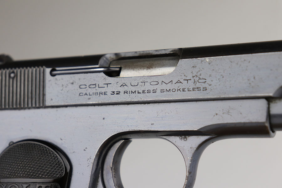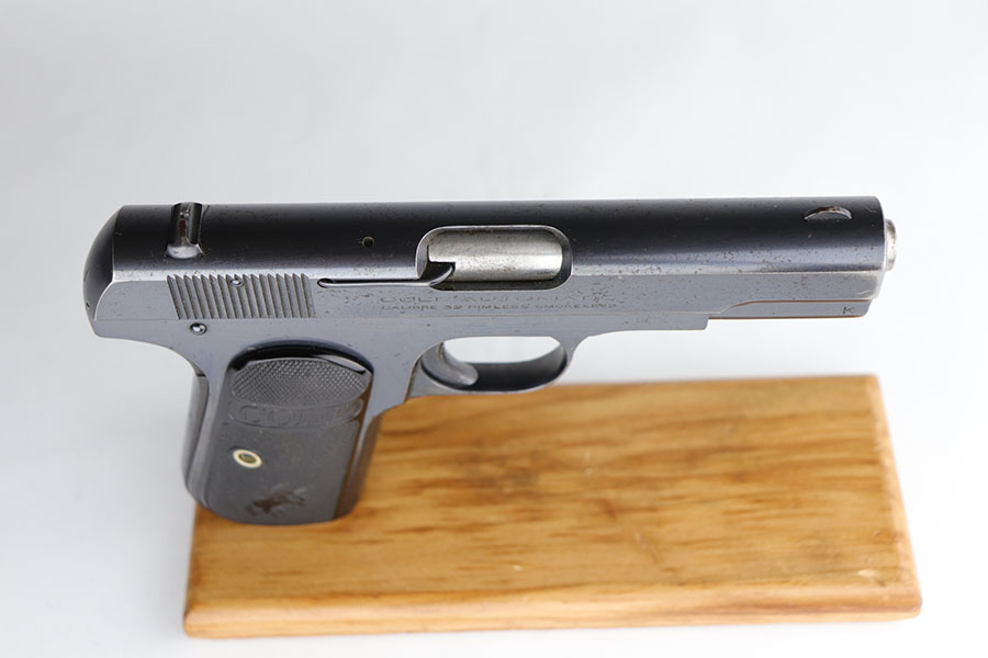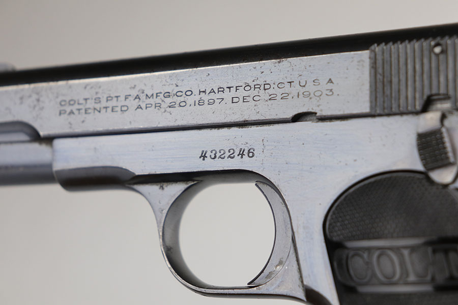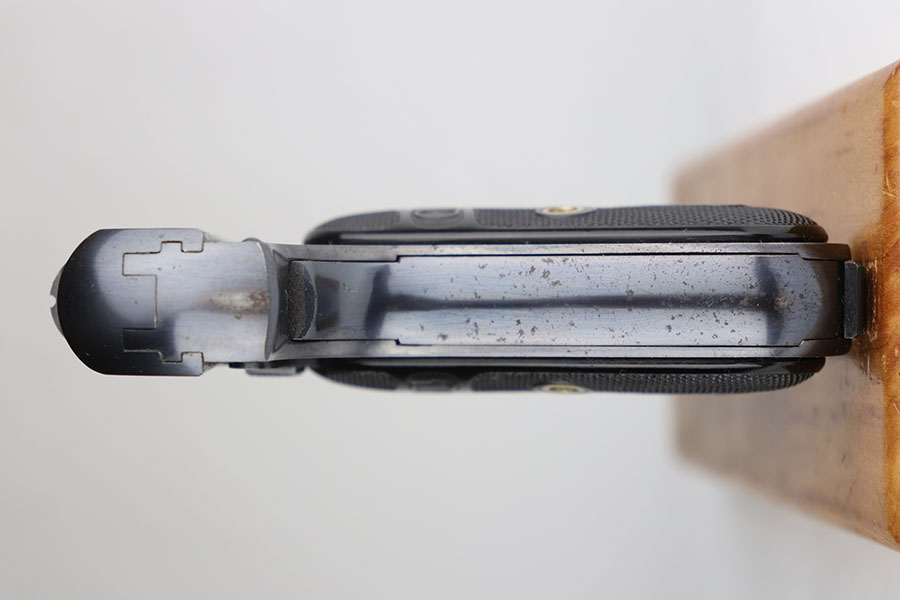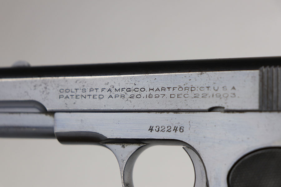 7/9/20 – This is an original Colt M1903 that was produced in 1923. It has about 95% of the original blue with muzzle wear on each side of the slide, and a bit of thinning along the high edges of the slide. While there is little actual bluing loss, there is obvious speckling and oxidation throughout. Grips are in excellent condition and original magazine is present. The bore has strong rifling but wasn’t well cared for and does have some pitting throughout.