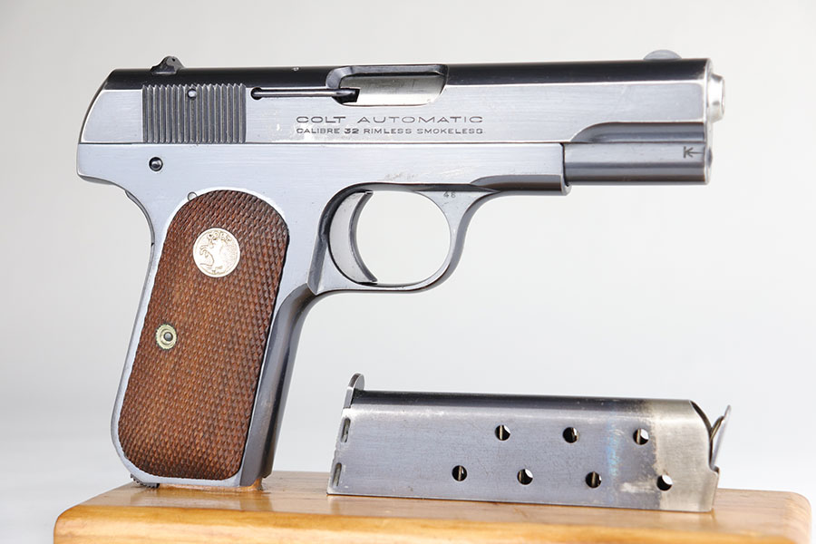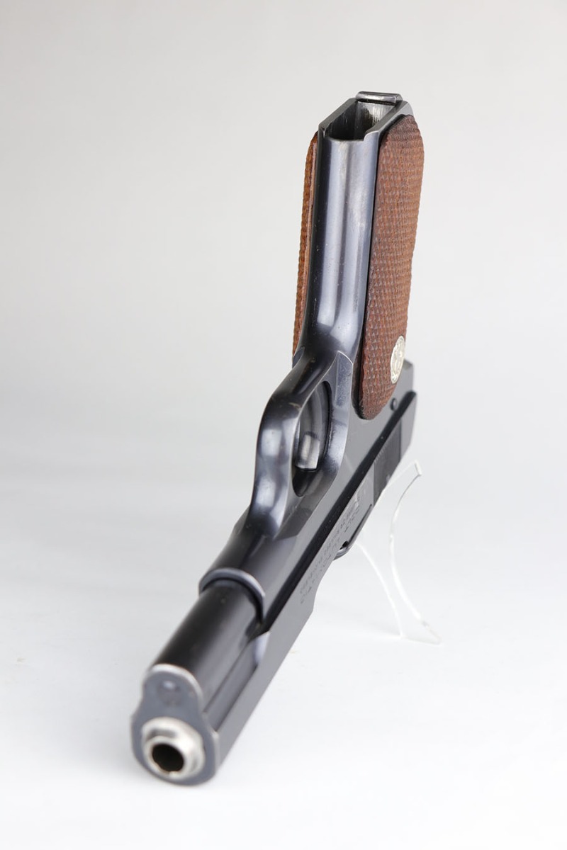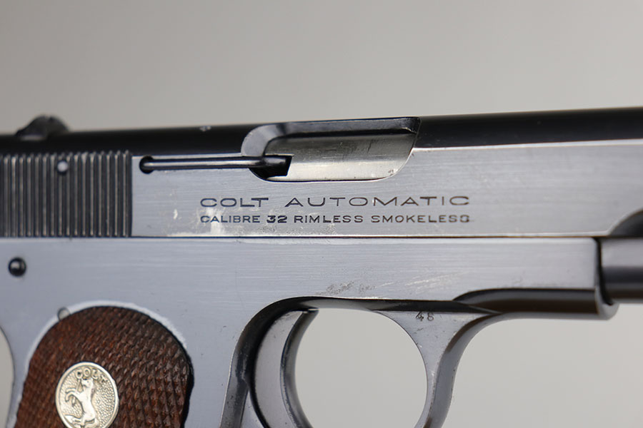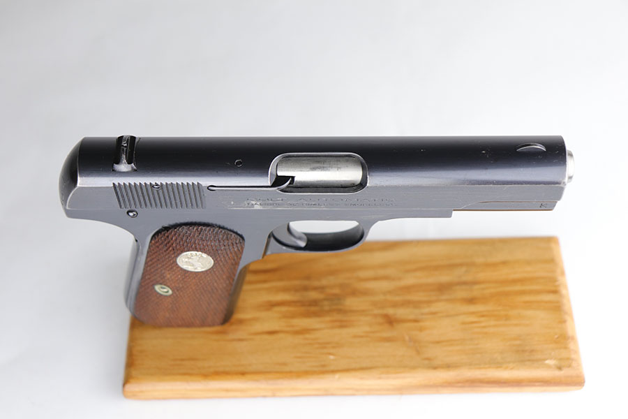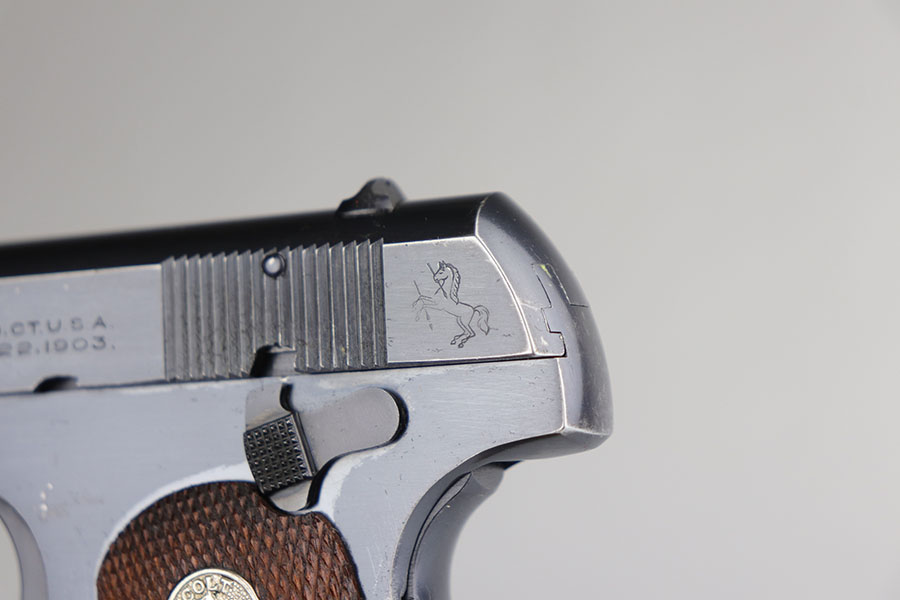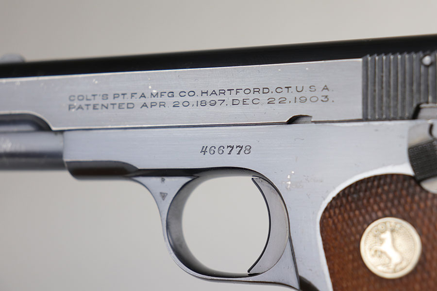 4/15/20 – This is a very nice Colt M1903 that was manufactured in 1926. The original blue rates at about 93-95%, with minor areas of wear on the underside of the slide, left side frame, bottom of grip safety and right side of slide. Minty bore and mint grips. Correct and original magazine.