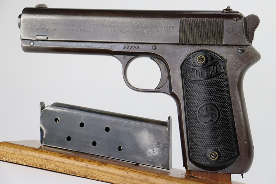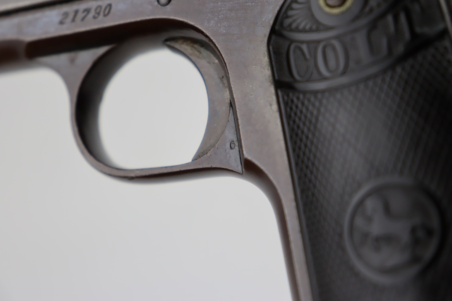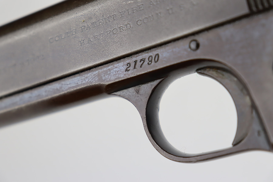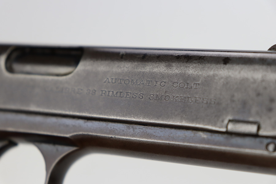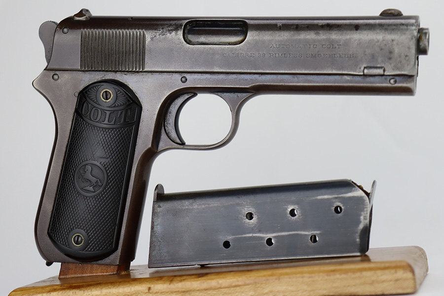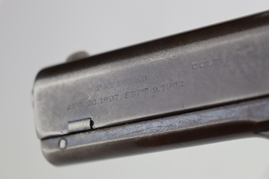 9/21/23 – This is a nice example of a Colt Model 1903 Pocket Hammer, manufactured in 1908. It is all matching but has lost most of its original finish with noticeable brown patina throughout. A few small dots of oxidation and tiny pitting on the right side of the slide. Fitted with period-correct black hard rubber grips. Comes with one proper magazine. The bore has decent rifling, but there is tiny pitting throughout.