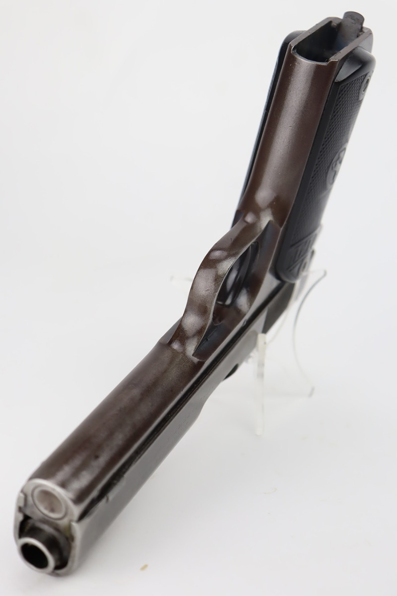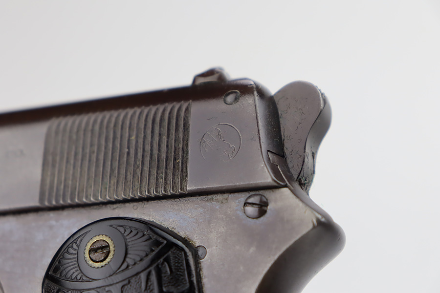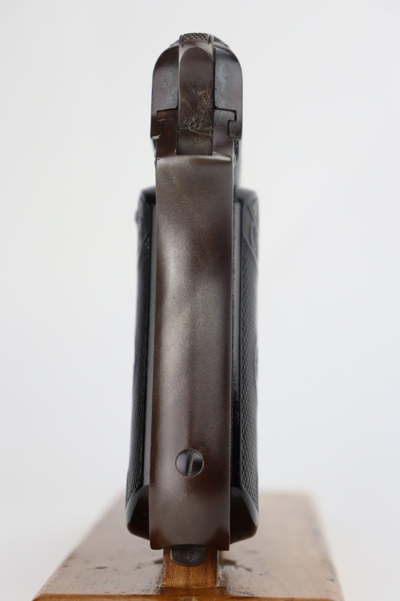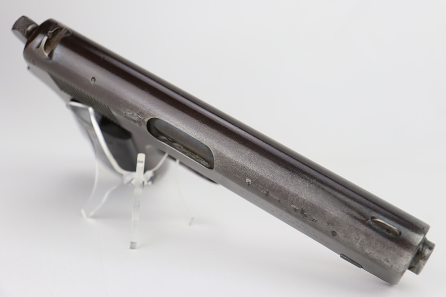 9/21/23 – This is a nice example of a Colt Model 1903 Pocket Hammer, manufactured in 1908. It is all matching but has lost most of its original finish with noticeable brown patina throughout. A few small dots of oxidation and tiny pitting on the right side of the slide. Fitted with period-correct black hard rubber grips. Comes with one proper magazine. The bore has decent rifling, but there is tiny pitting throughout.