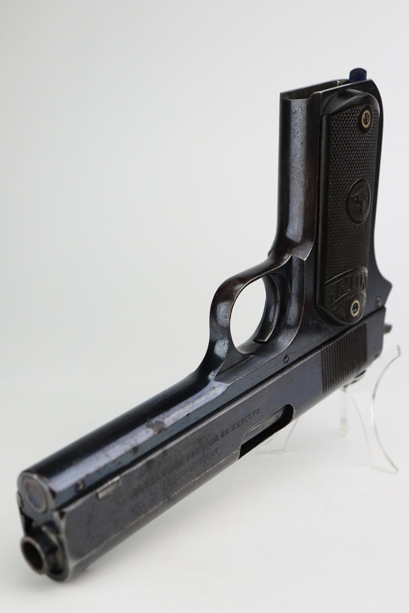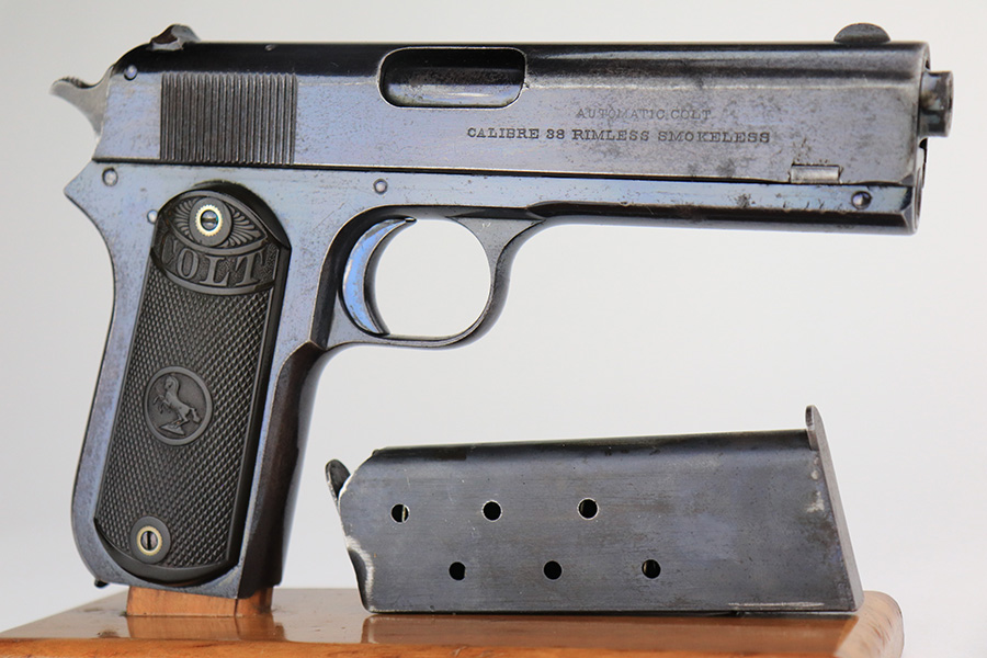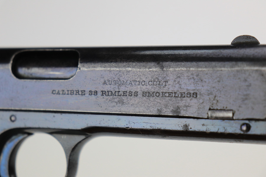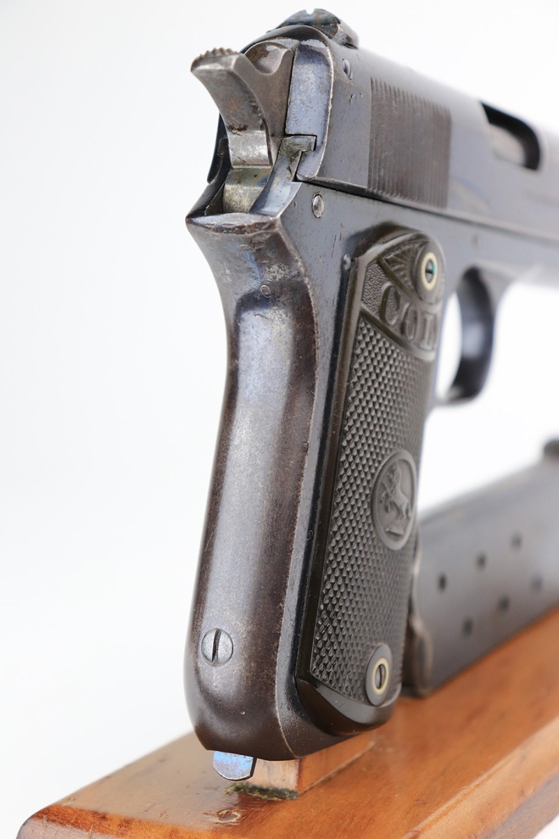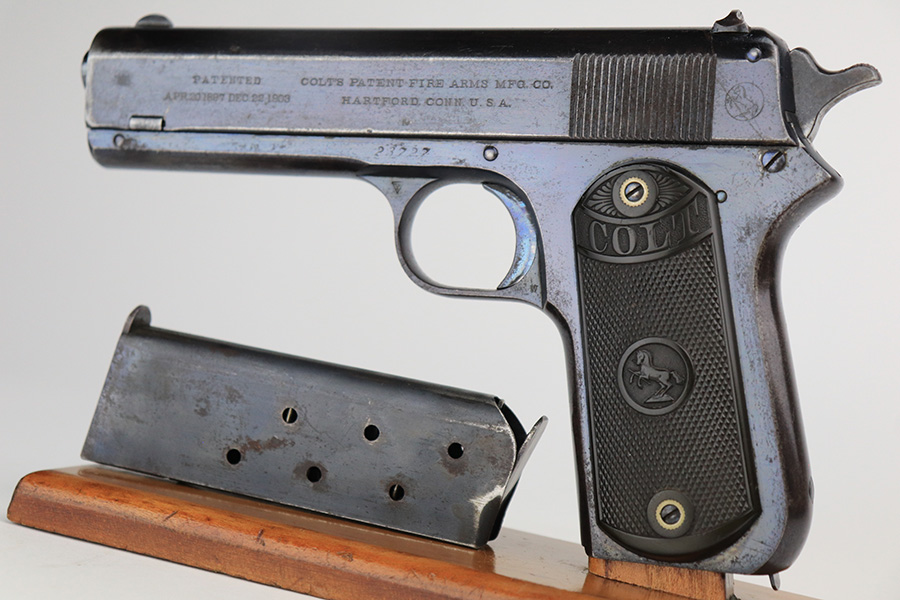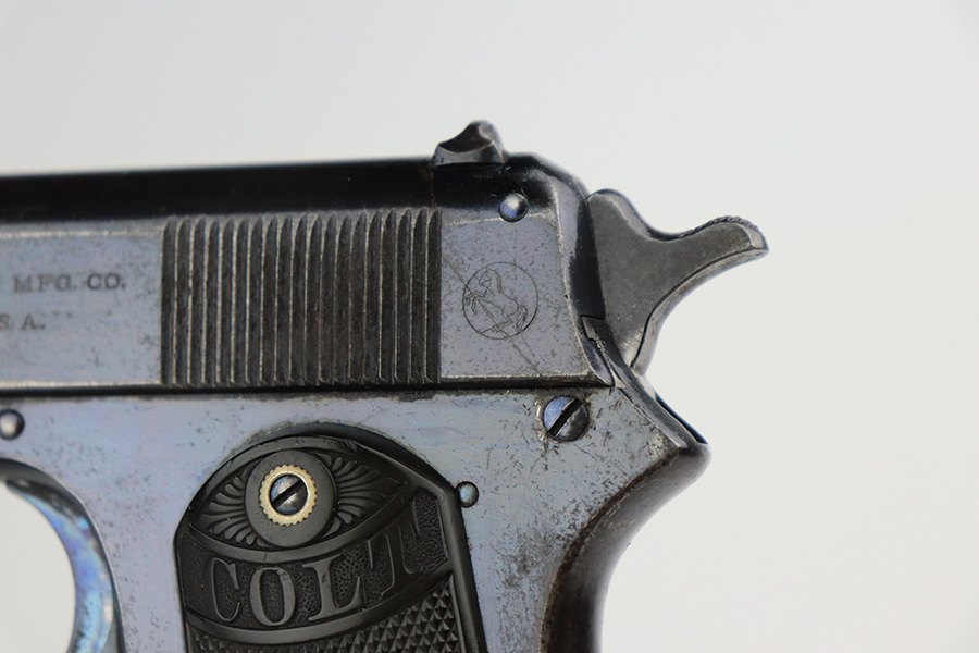 5/27/22 – This is a nice example of a Colt Model 1903 Pocket Hammer manufactured in 1909. It is all matching and has retained somewhere between 85-90% of its high polish finish. There is spotty wear throughout, concentrated mostly around the high edges. Noticeable spotty oxidation throughout. Some small areas of minor pitting here and there. Comes with period-correct hard rubber grips and one proper magazine. The rifling in the bore is fairly worn with minor pitting throughout.