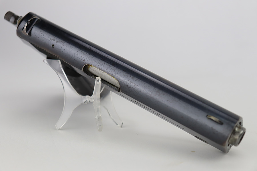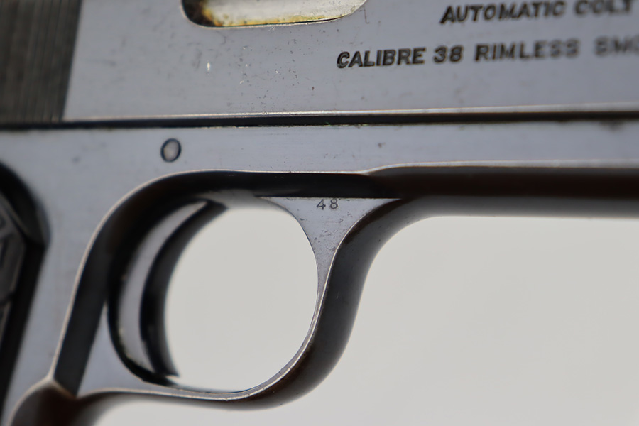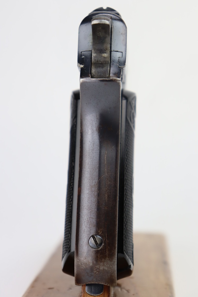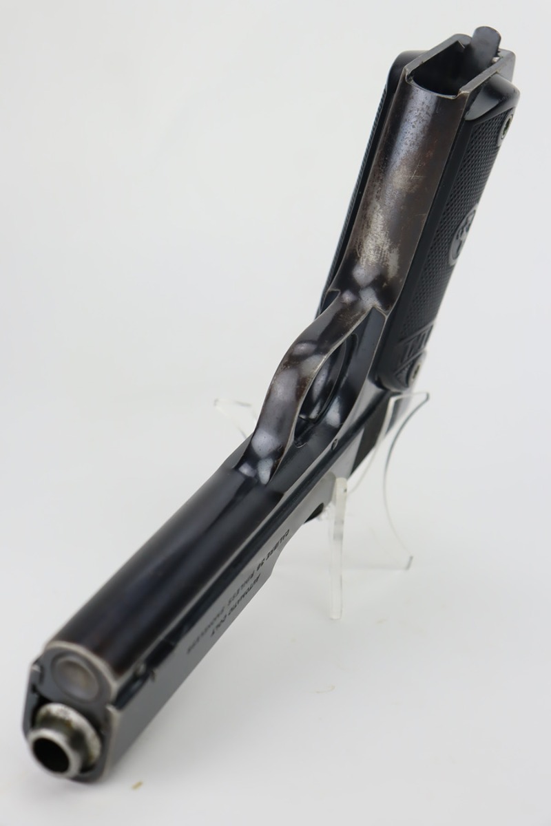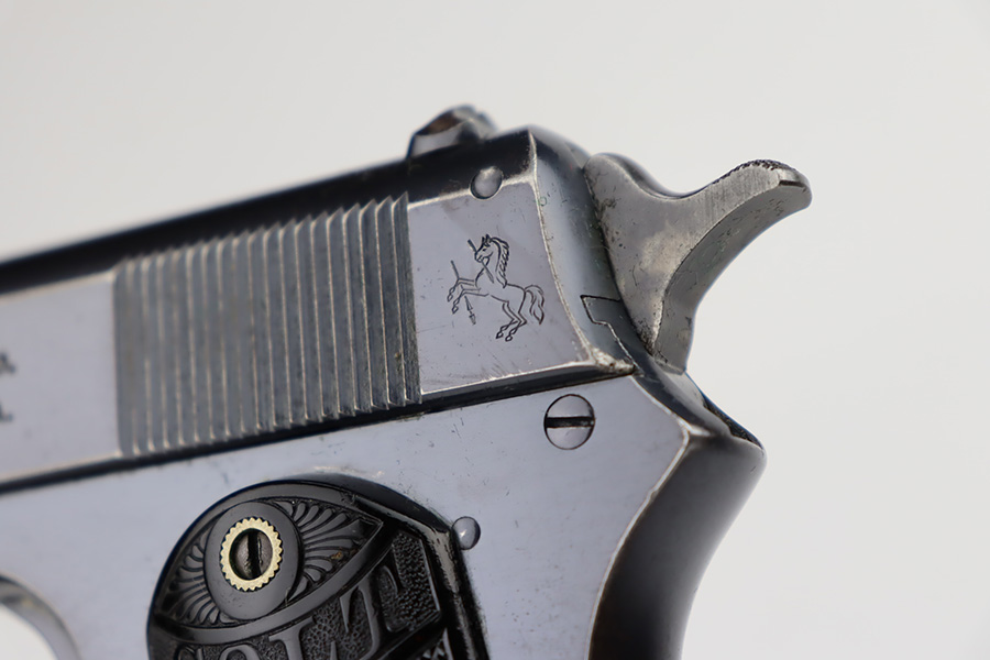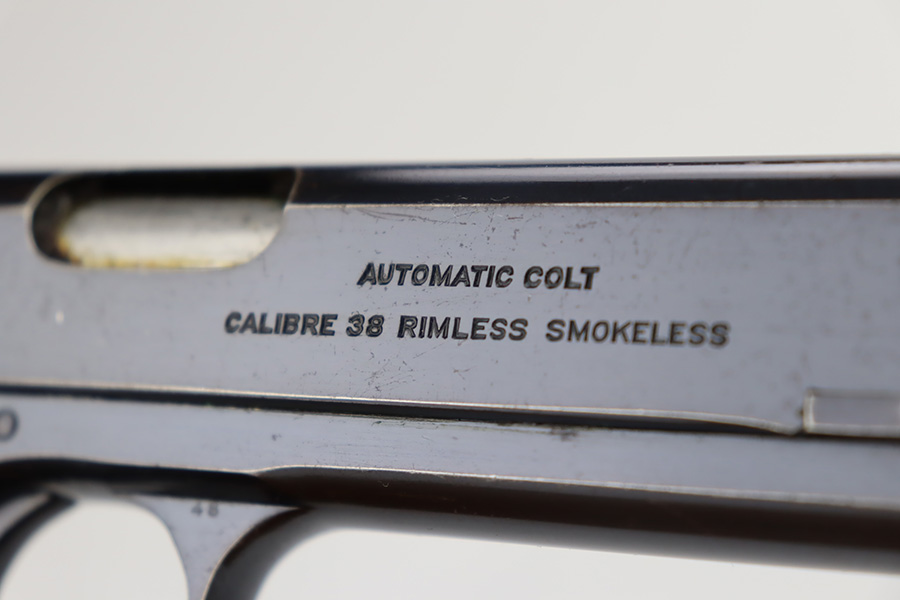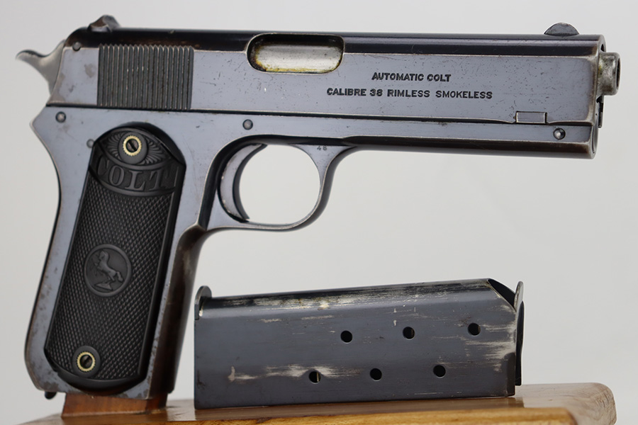 9/21/23 – This is a very nice example of a Colt Model 1903 Pocket Hammer, manufactured in 1921. It is all matching and has retained somewhere between 85-90% of its original high polish finish. Most of the finish loss comes in the form of scratchy wear on the grip straps, but there is also minor wear around the muzzle and on the high edges of the slide. There are light scratches here and there and areas of light freckling on the slide and on the grip straps. Fitted with period-correct black hard rubber grips. Comes with one proper magazine. Excellent bore with great rifling.