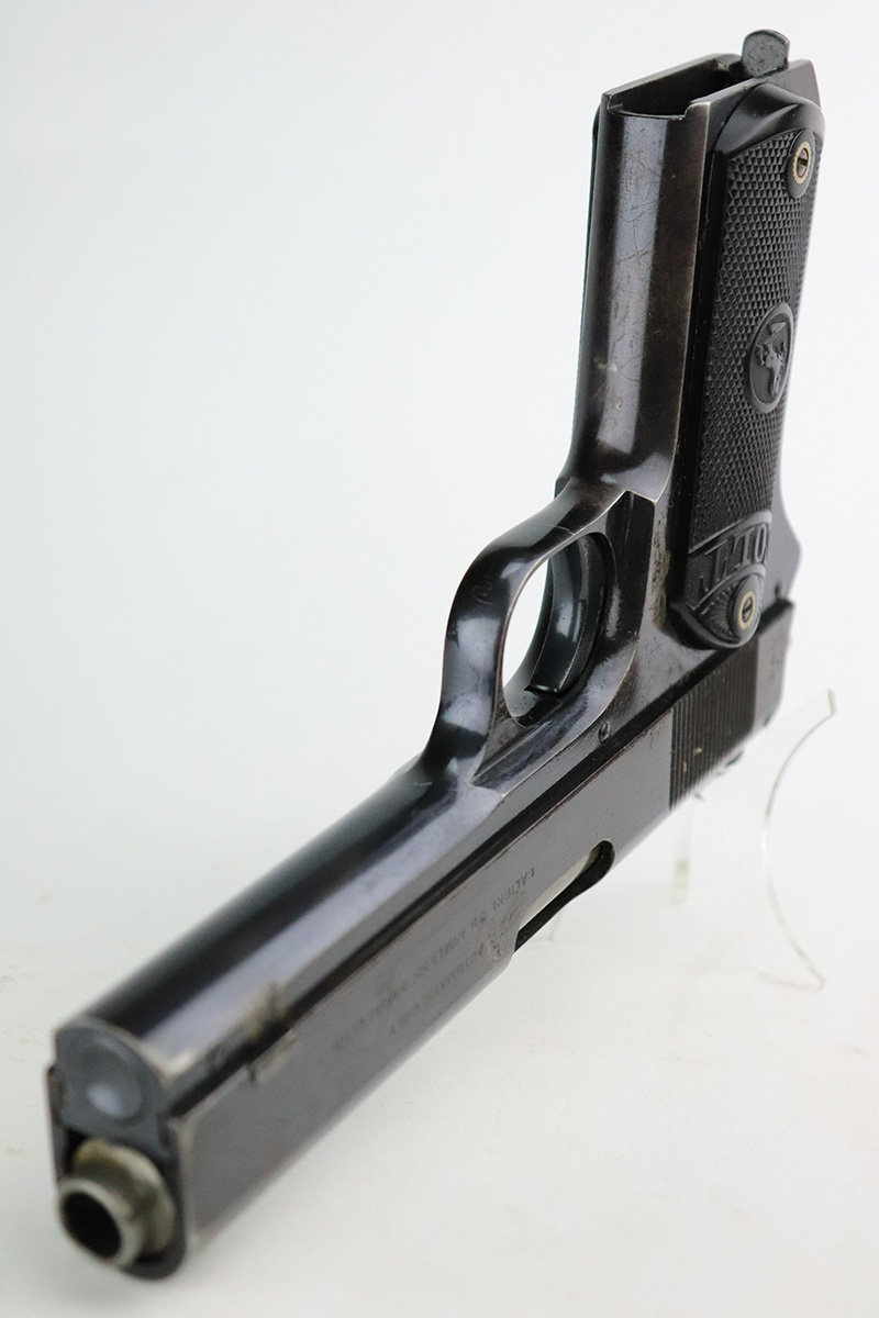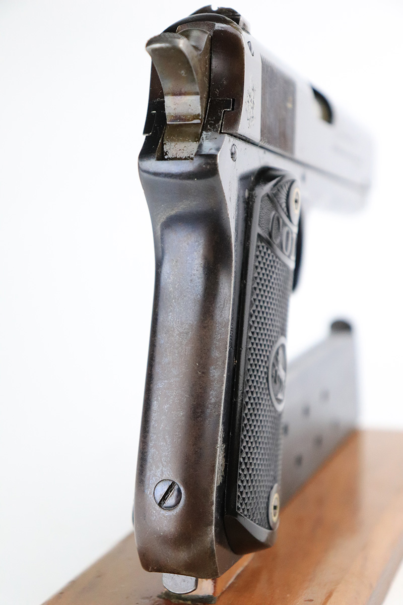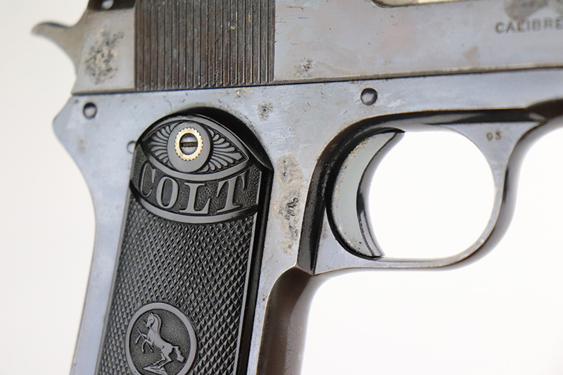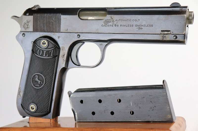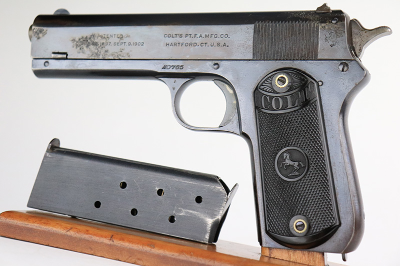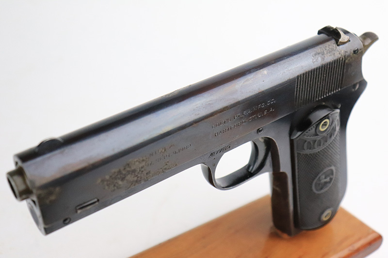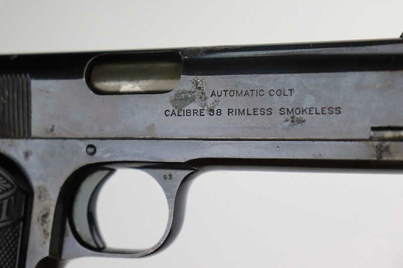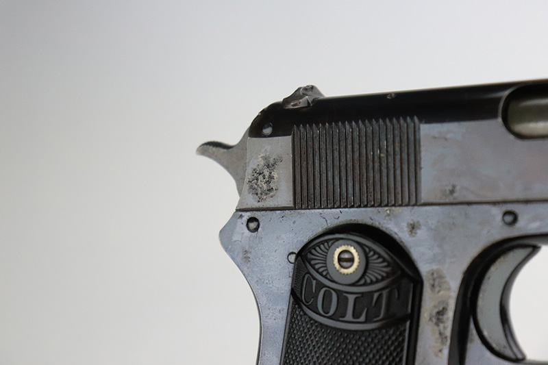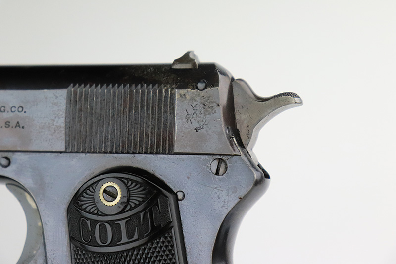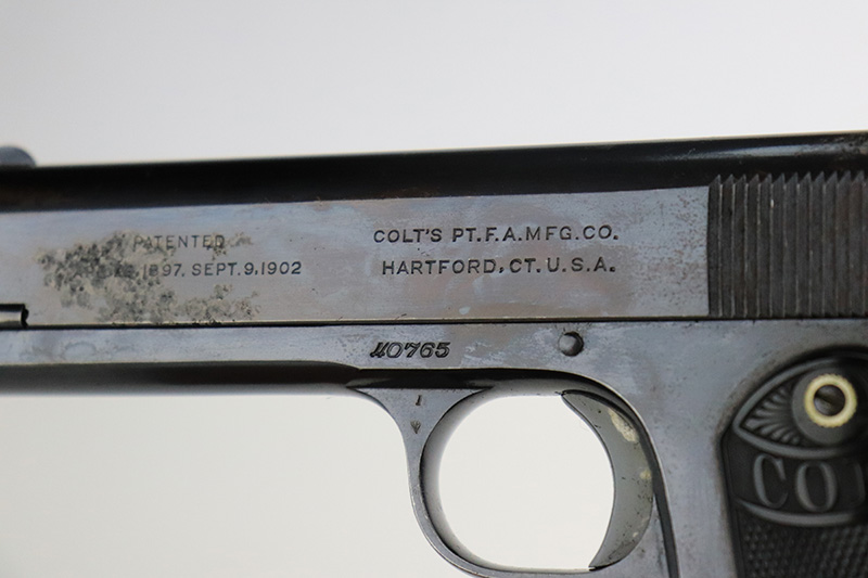 8/25/22 – This is a Colt Model 1903 Pocket Hammer pistol manufactured in 1919. The gun has retained roughly 80% of its original finish. While there isn’t a ton of actual finish loss, there are areas of obvious spotty wear and pitting here and there. There is also splotchy discoloration in the high polish bluing throughout. Scratchy wear and patina on both grip straps. Comes with excellent black hard rubber Colt grips and one proper magazine. The bore has good rifling with very minor frosting throughout.