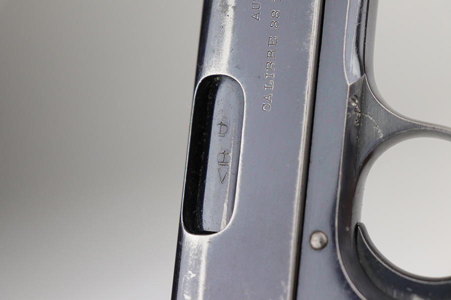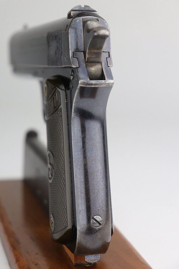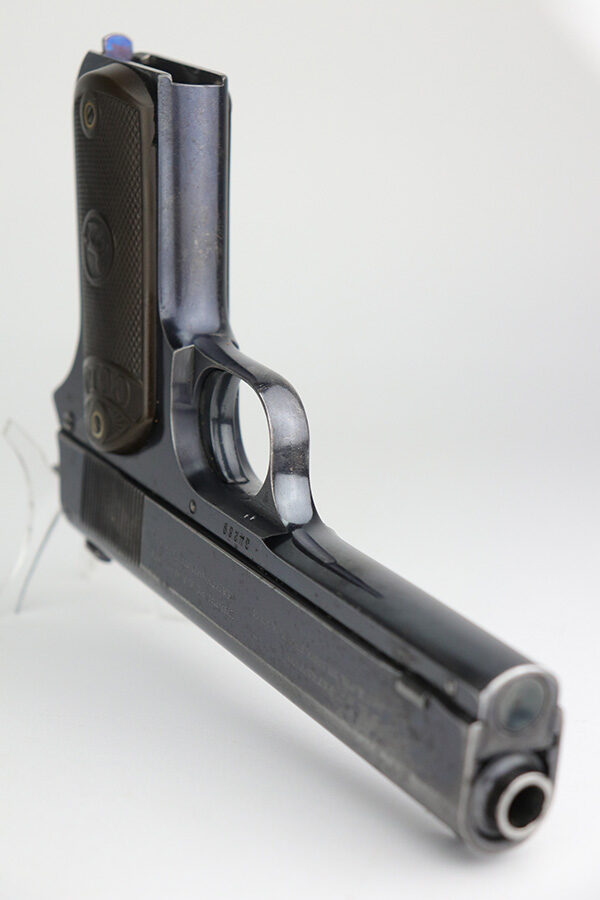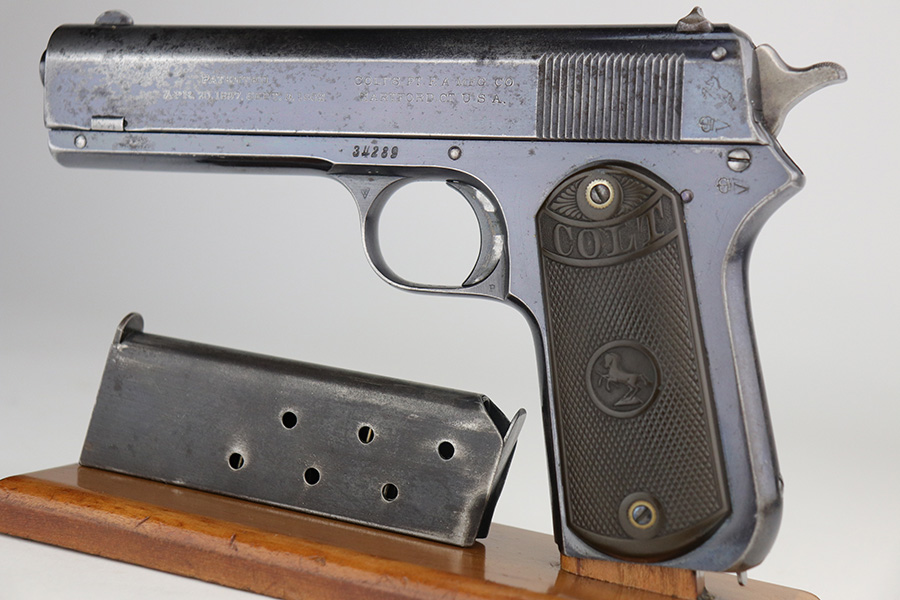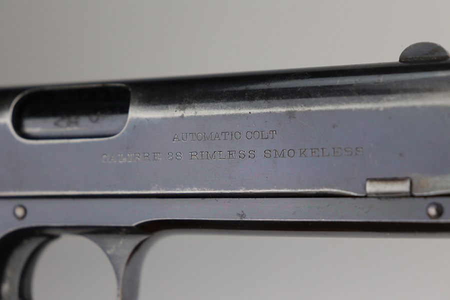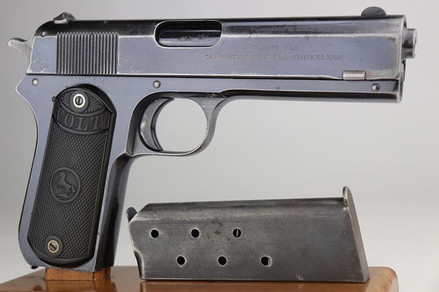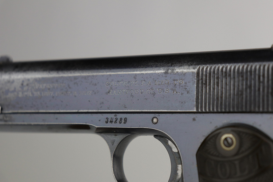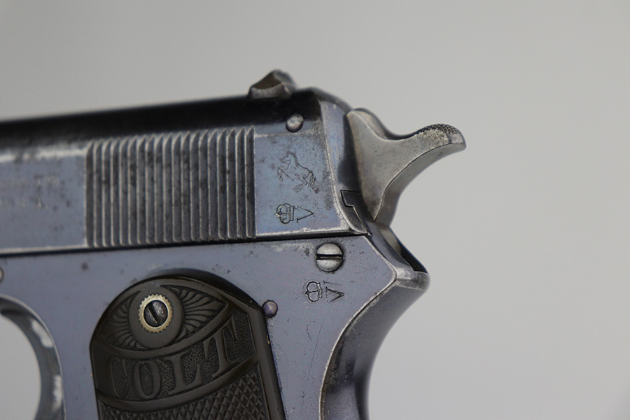 10/21/21 – This is a nice example of a Colt Model 1903 Pocket Hammer pistol manufactured in 1915. The gun is all matching and has the proper Rampant Colt logo at the back of the left side of the slide. It also has an British “Crown V” proofs on the frame, slide, and ejection port. From research, this indicates that this particular gun was delivered to the British military for use during WW1 – a fascinating gun indeed. It has retained roughly 60% of its original high polish Colt blue. The case-hardening on the hammer is mostly worn. Most of the finish loss is on the slide where the wear is spotty. It is most noticeable on the left side of the slide near the muzzle (spotty oxidation and a few areas of minor pitting in the same areas) and around the high edges of the slide. There is scratchy wear and minor freckling on the grip straps as well. There is a small area of minor dings on the right side of the gun at the top of the trigger guard. Comes with excellent hard rubber Colt grips – there is a small chip along the edge of the left grip panel. It also comes with one proper magazine. The bore has decent rifling with minor pin-pricking throughout.