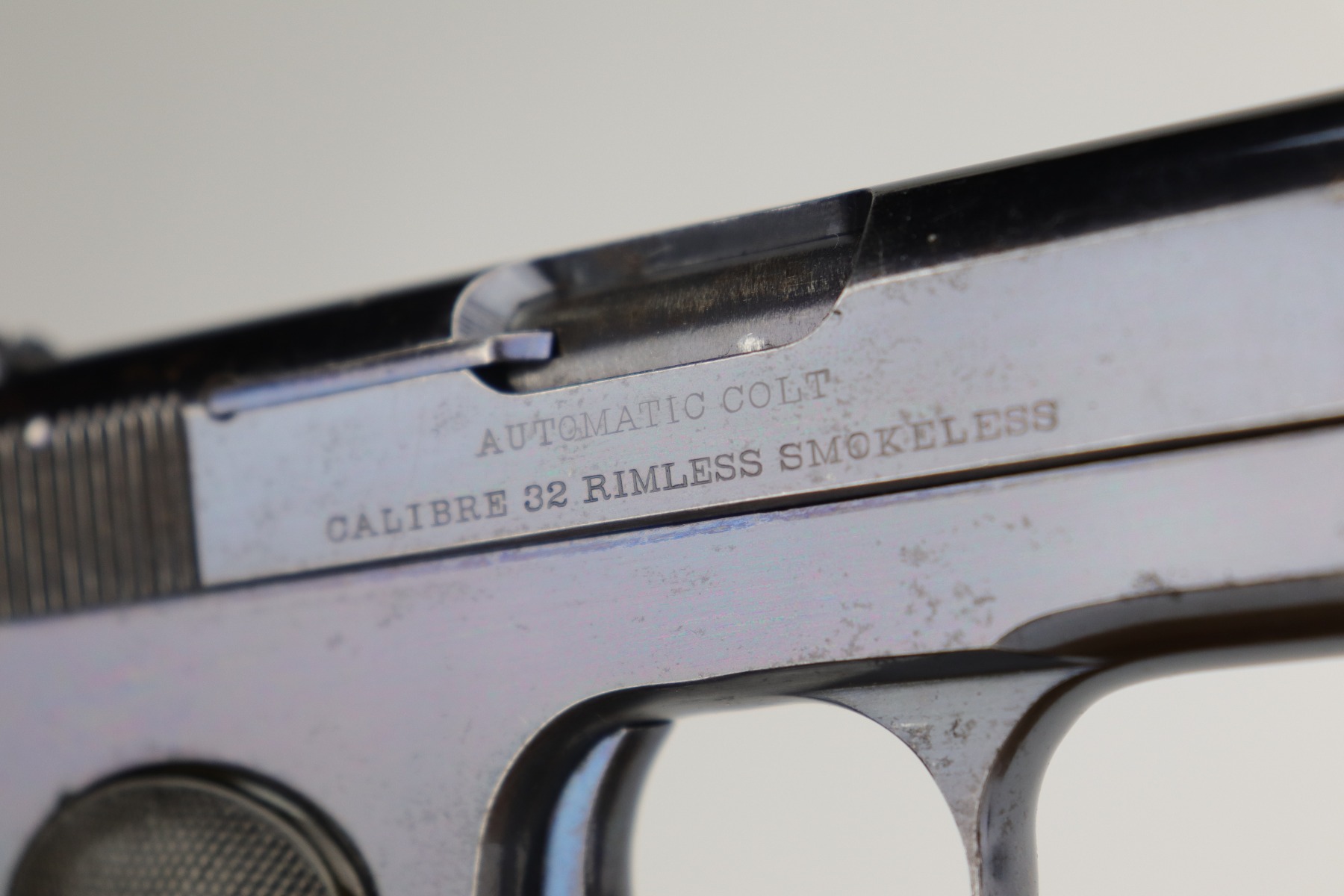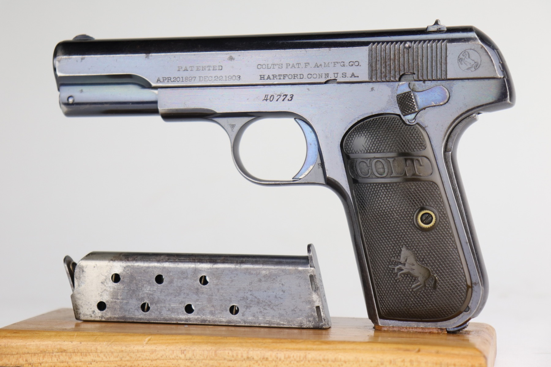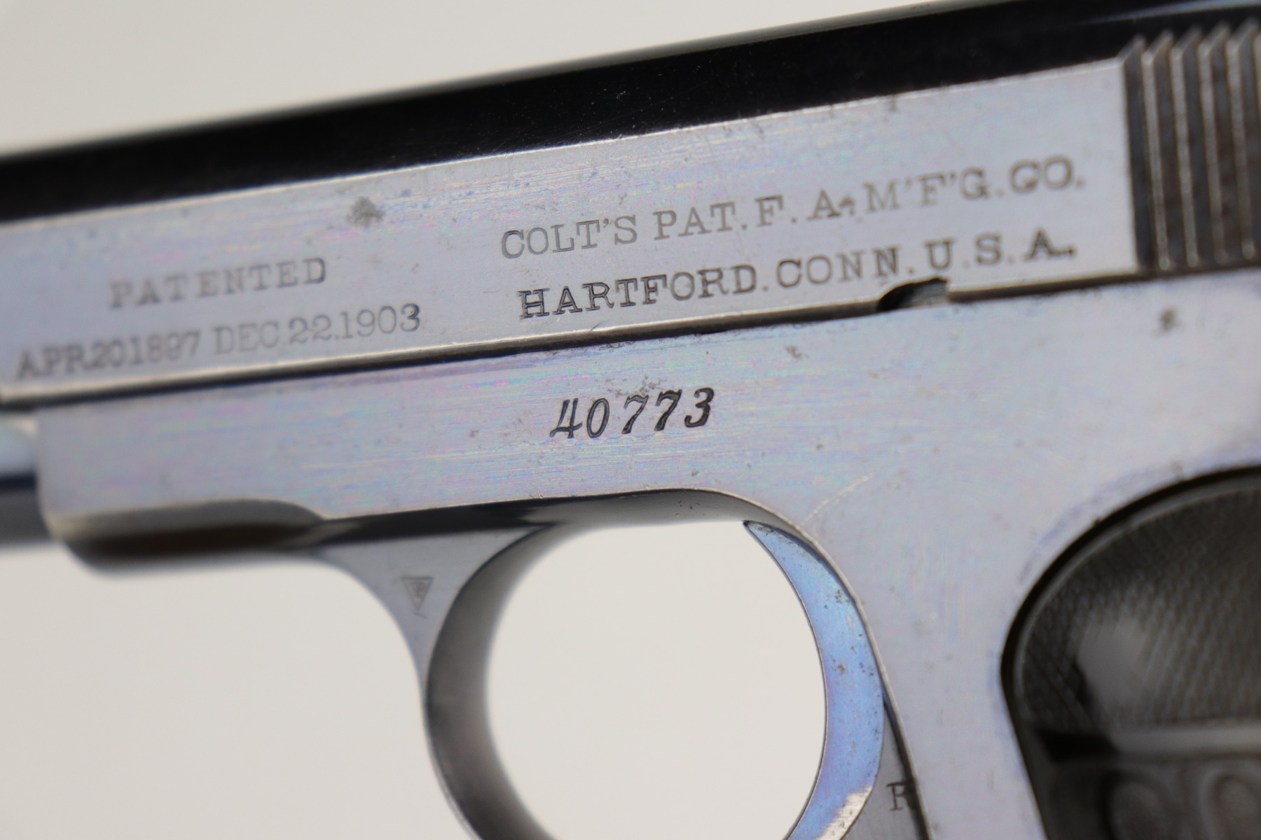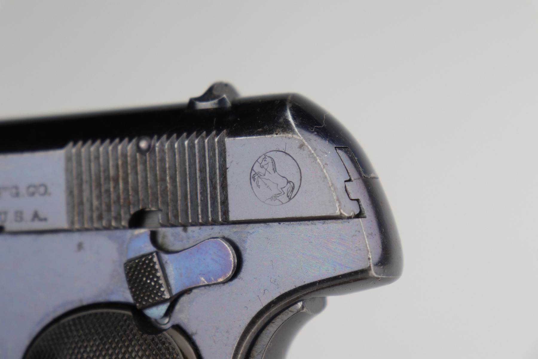 12/21/20 – This is a very nice example of a Colt M1903 Pocket Hammerless semi auto pistol, made in 1906. It has retained about 90% of its high polish bluing. The fire-bluing is mostly in tact on the small parts. Most of the wear is on the straps, but there is minor wear around the muzzle and high edges. There are very minor surface scratches here and there. It comes with excellent original grips and one proper magazine. The bore is minty.