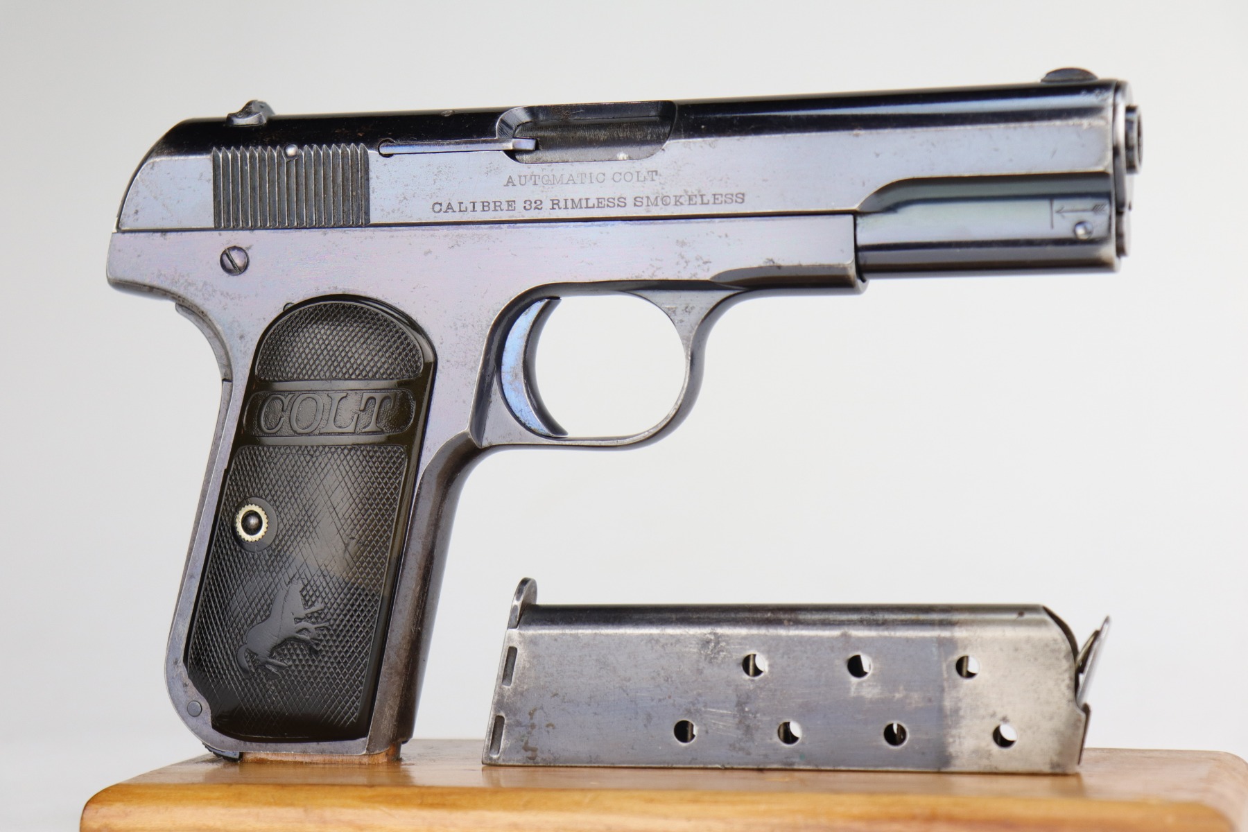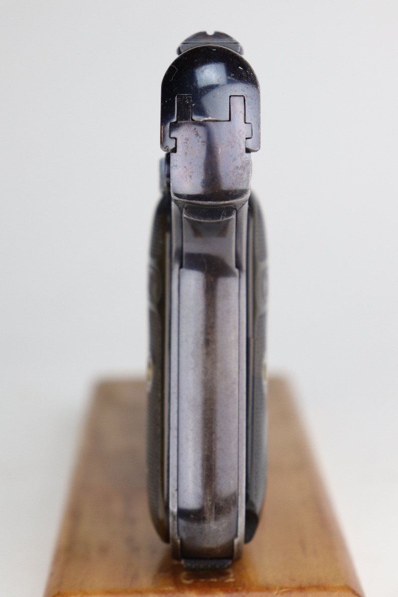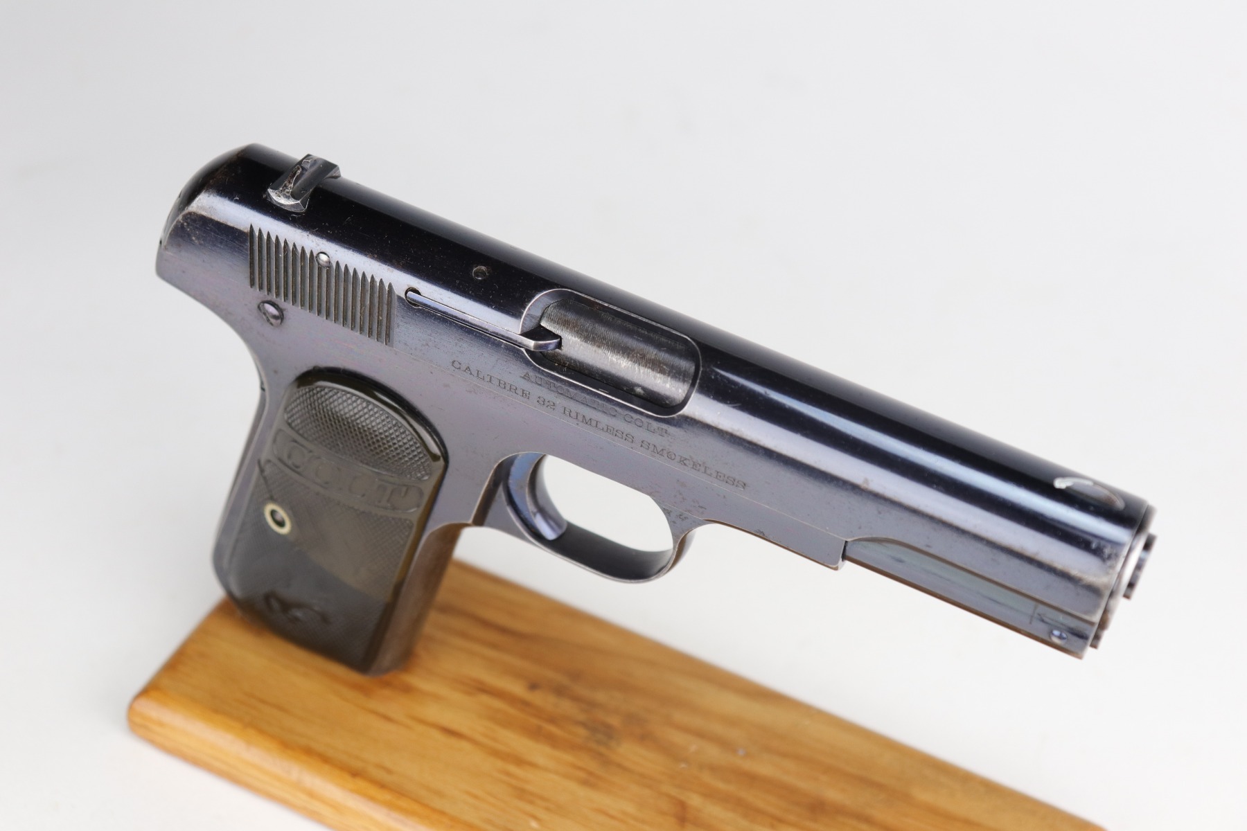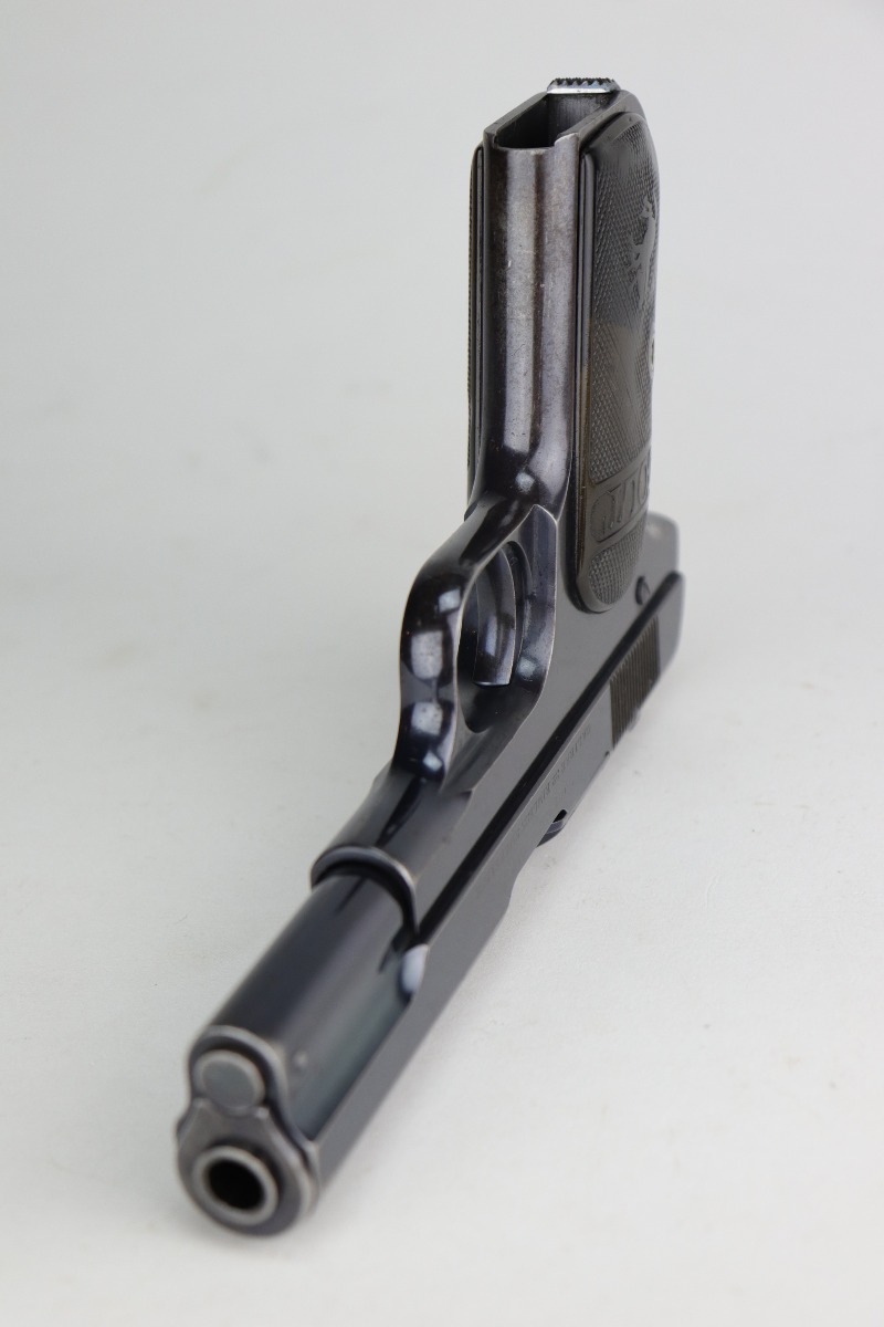 12/21/20 – This is a very nice example of a Colt M1903 Pocket Hammerless semi auto pistol, made in 1906. It has retained about 90% of its high polish bluing. The fire-bluing is mostly in tact on the small parts. Most of the wear is on the straps, but there is minor wear around the muzzle and high edges. There are very minor surface scratches here and there. It comes with excellent original grips and one proper magazine. The bore is minty.