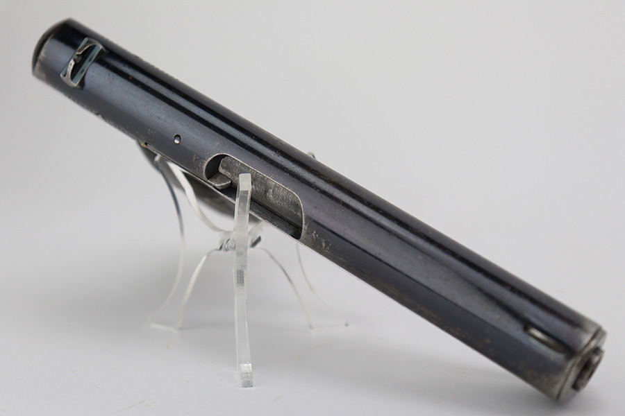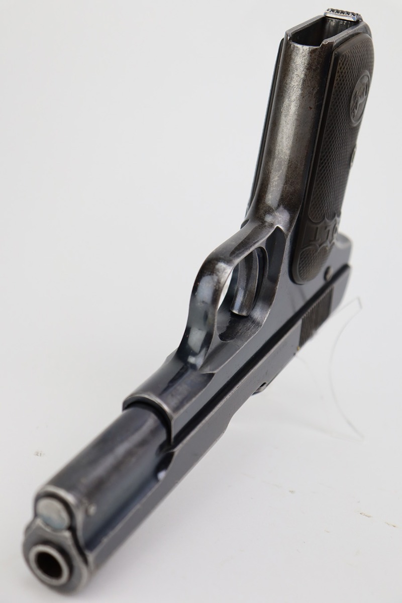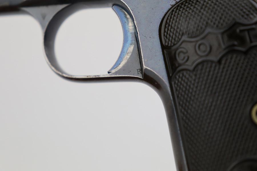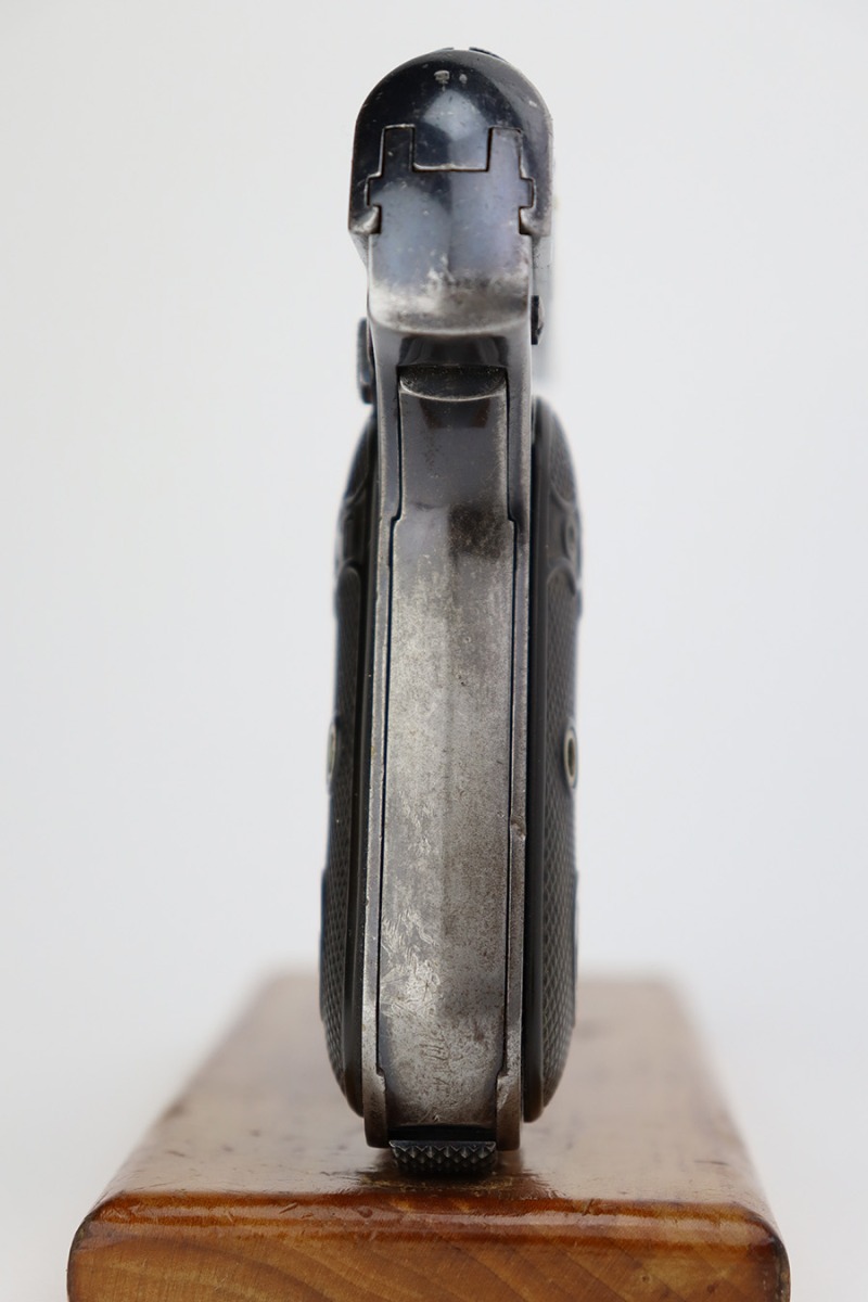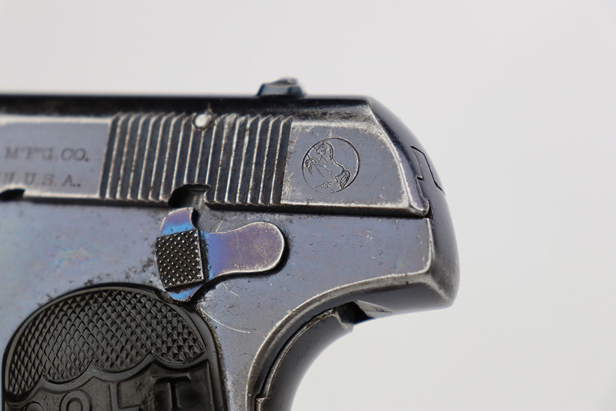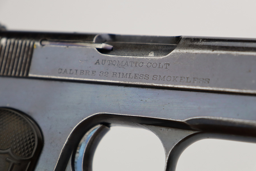 8/1/23 – This is a nice example of a Colt Model 1903 Pocket Hammerless, manufactured in 1907 and chambered in .32 ACP. It is all matching and has retained roughly 60% of its original high polish finish. There is obvious spotty wear and finish loss throughout, concentrated mostly on the grip straps, around the muzzle, and on the high edges of the slide. Some light scratches and handling marks here and there. Some tiny dings at the right front of the gun. Fitted with period-correct hard rubber Colt grips. Comes with one proper magazine. The bore has strong rifling with minor pin-pricking in the grooves.