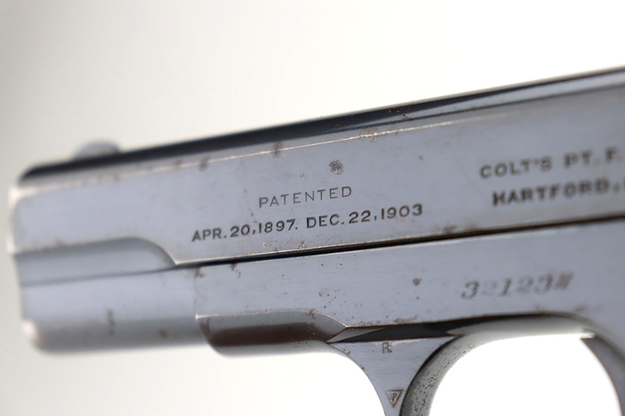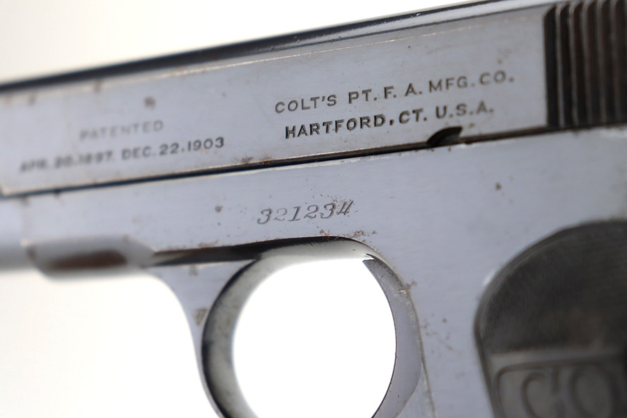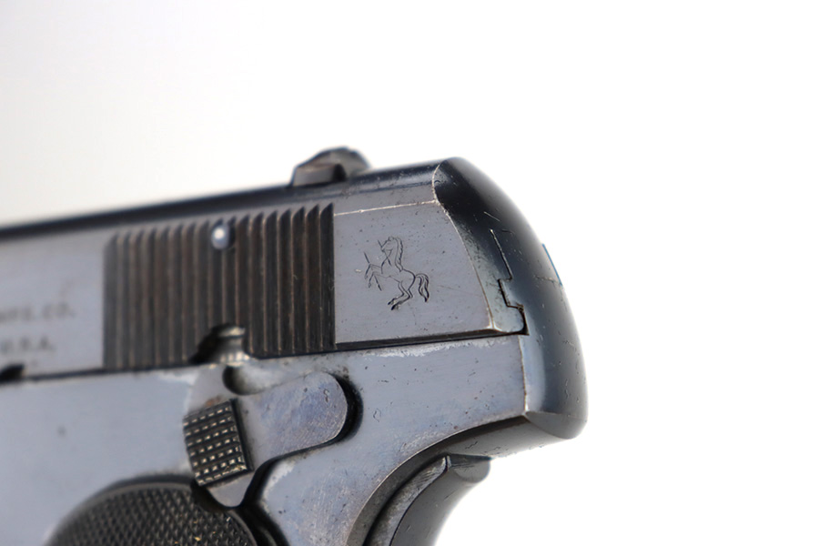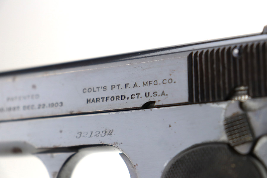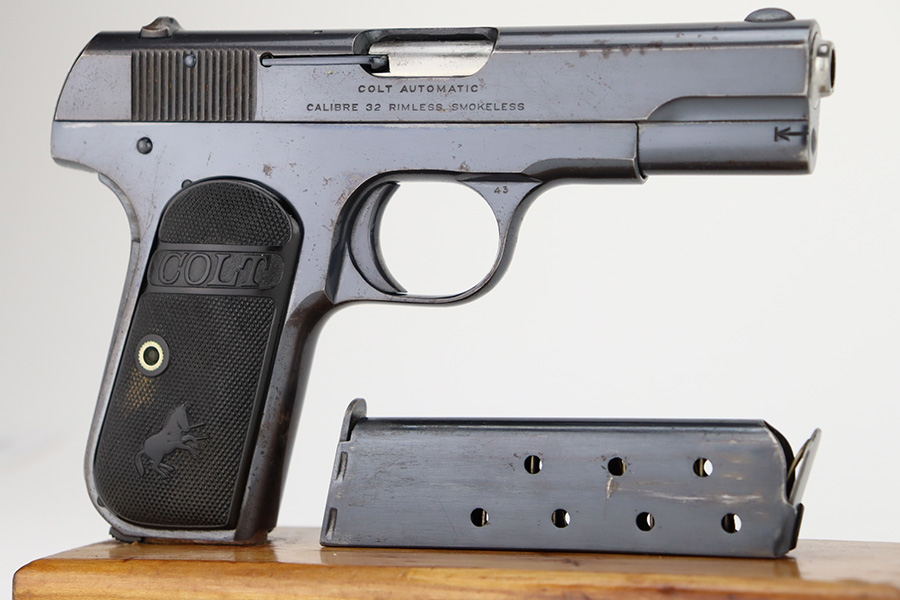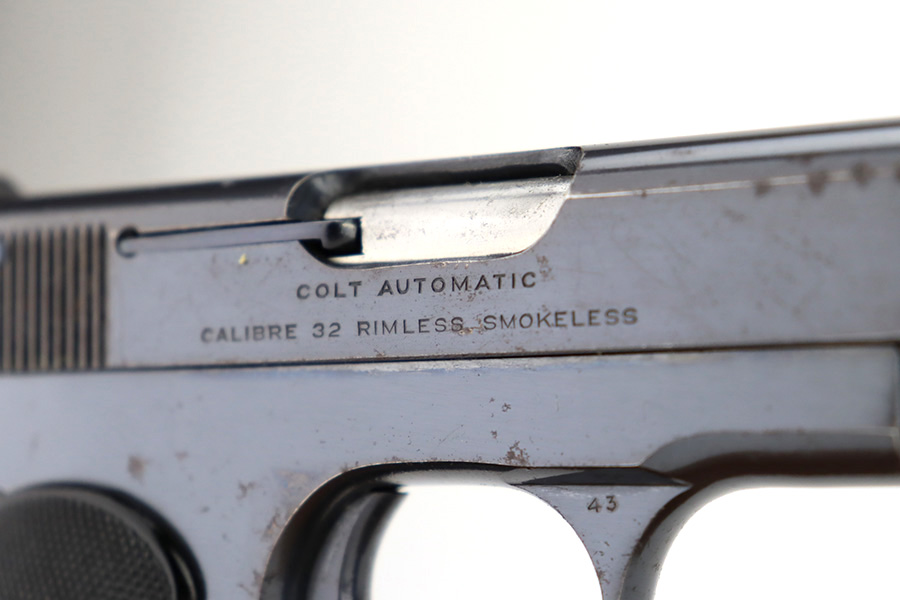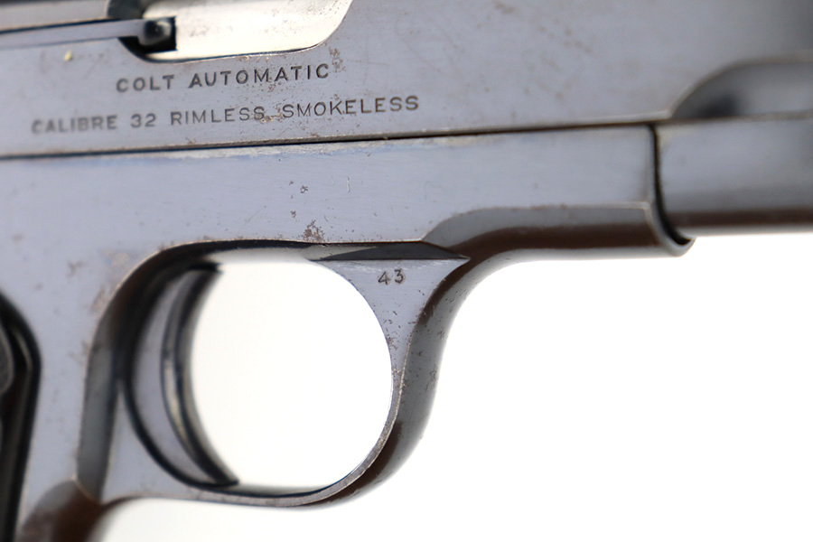 12/14/23 – This is a very nice Colt Model 1903 Pocket Hammerless, manufactured in 1919 and chambered in .32 ACP. It is all matching and has retained about 96-97% of its original high polish finish. There is very minor wear around the muzzle and on the high edges of the slide. A couple of small spots of wear on the grip straps. While there is very little actual finish loss, there are areas of light spotty oxidation throughout. Fitted with period-correct black hard rubber grips. Comes with one proper magazine. Excellent bore with strong rifling.