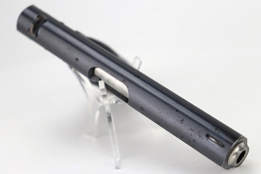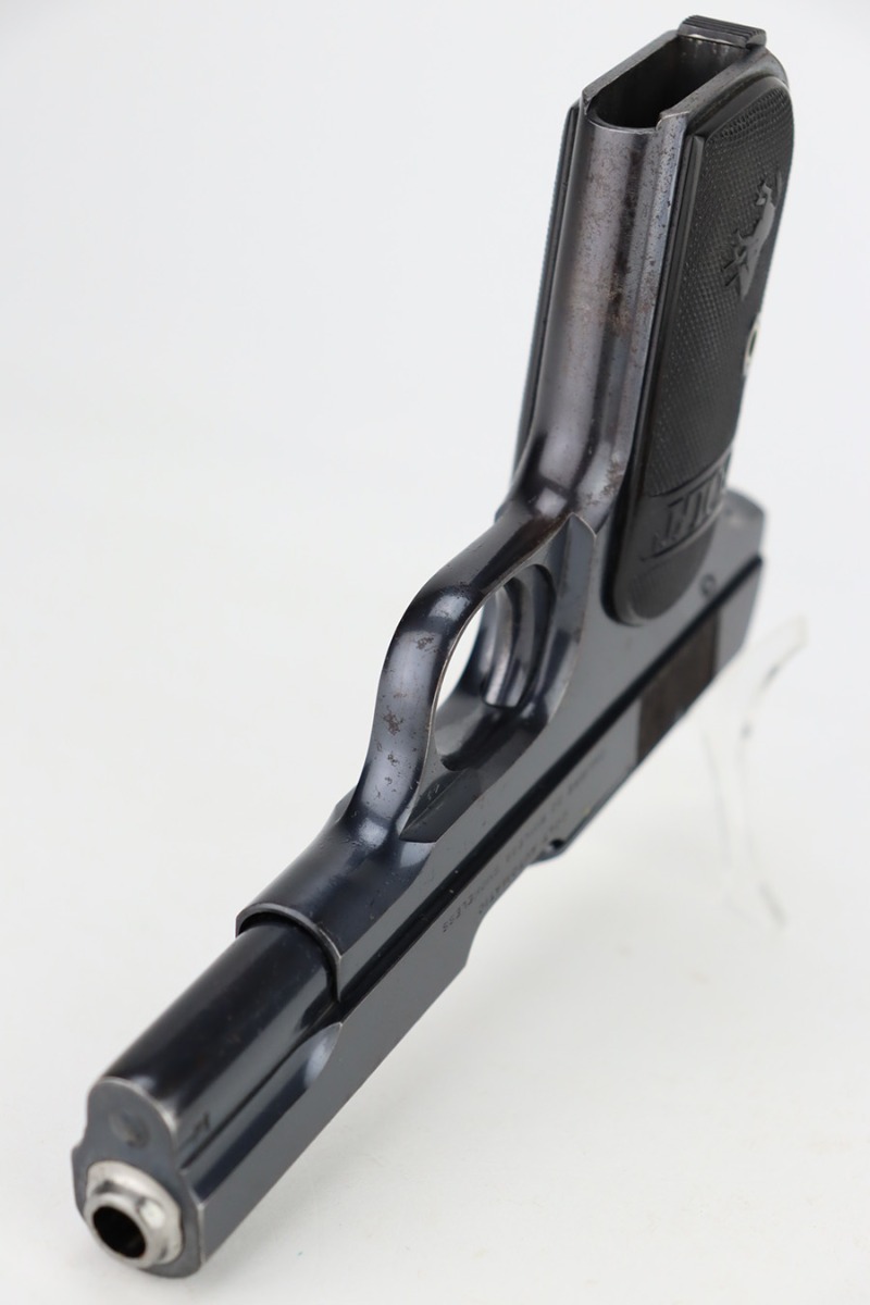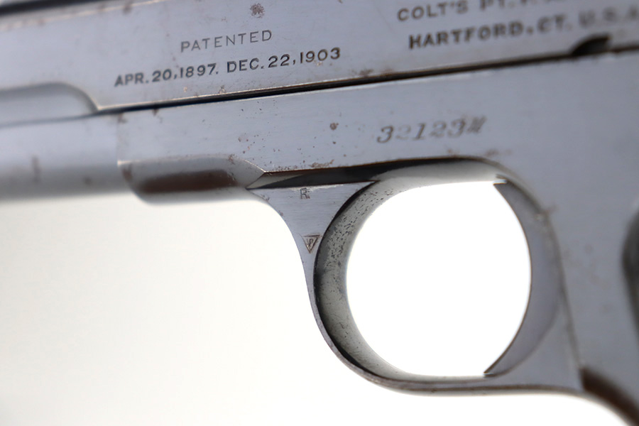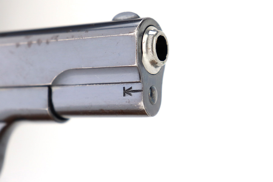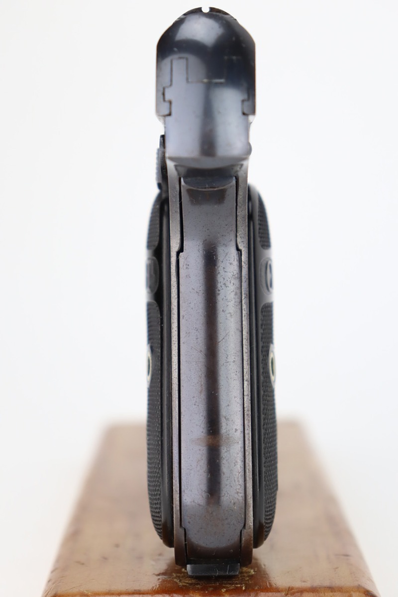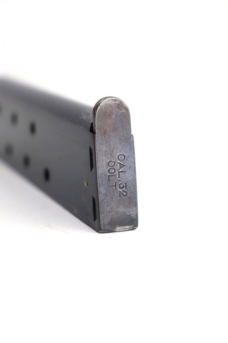 12/14/23 – This is a very nice Colt Model 1903 Pocket Hammerless, manufactured in 1919 and chambered in .32 ACP. It is all matching and has retained about 96-97% of its original high polish finish. There is very minor wear around the muzzle and on the high edges of the slide. A couple of small spots of wear on the grip straps. While there is very little actual finish loss, there are areas of light spotty oxidation throughout. Fitted with period-correct black hard rubber grips. Comes with one proper magazine. Excellent bore with strong rifling.