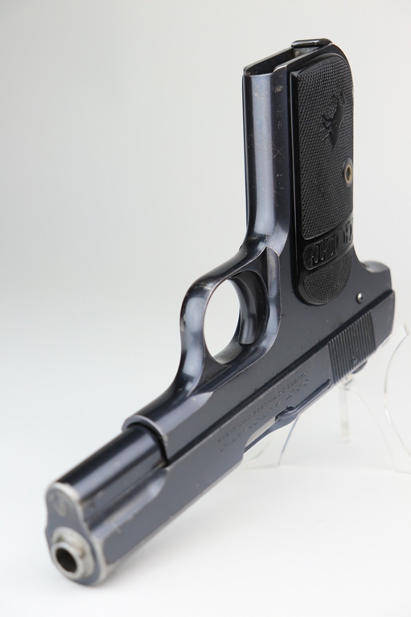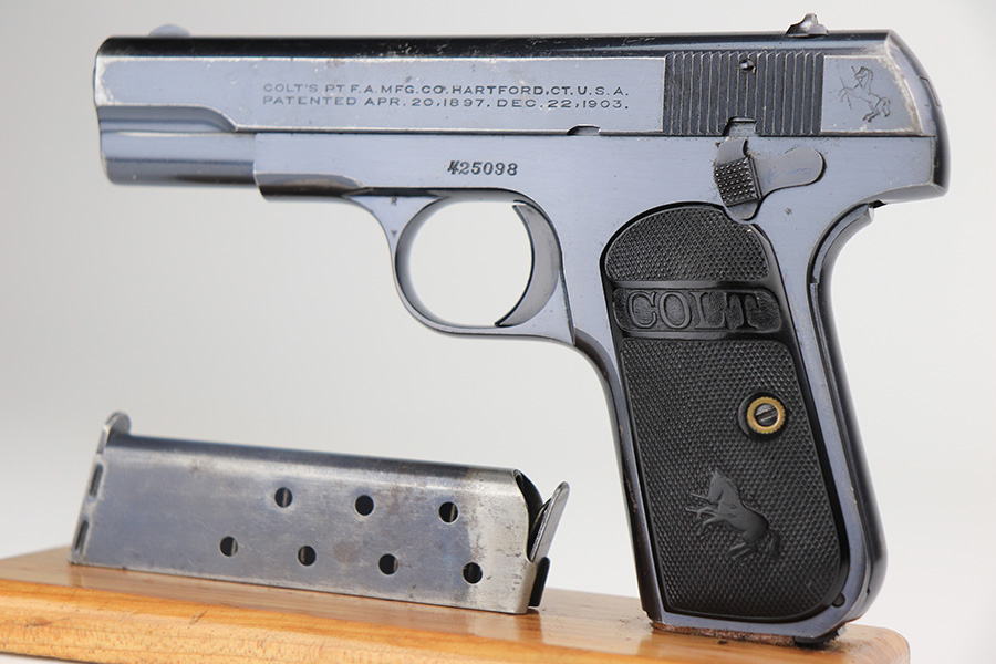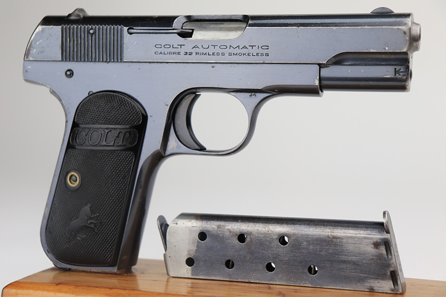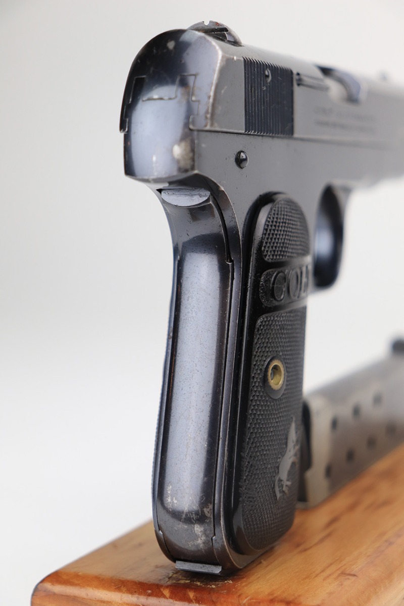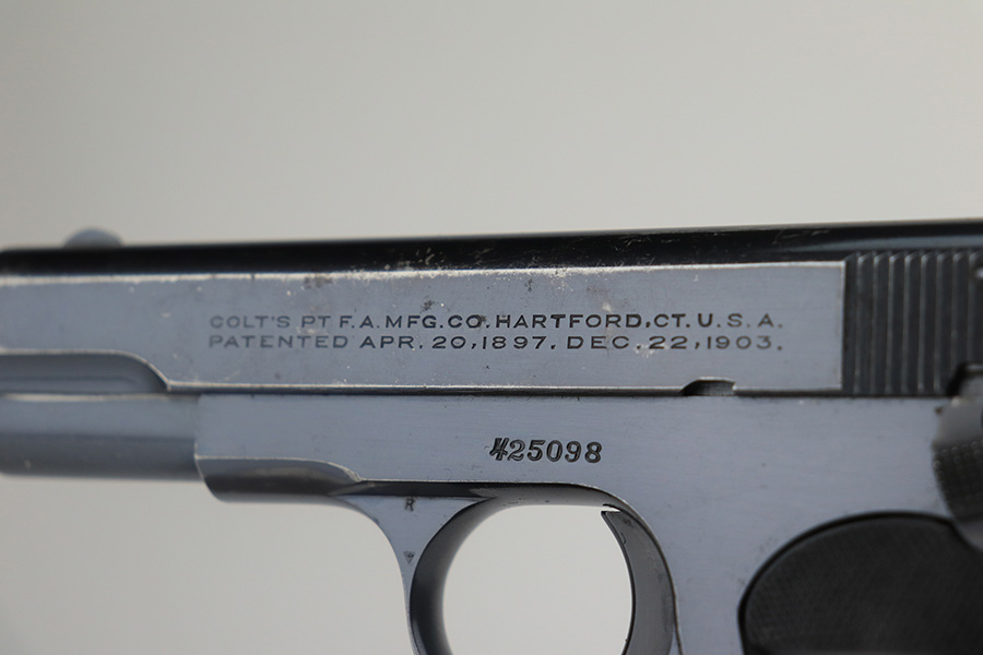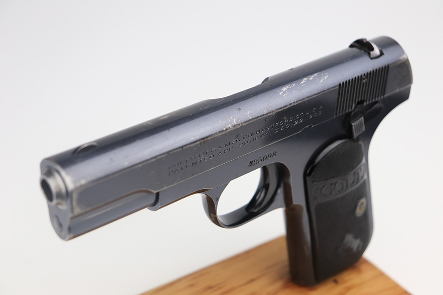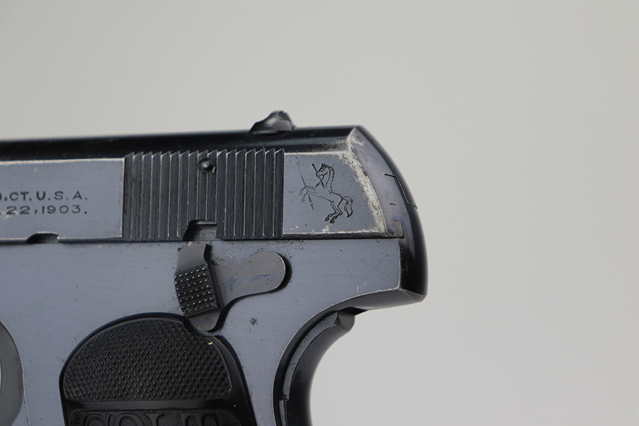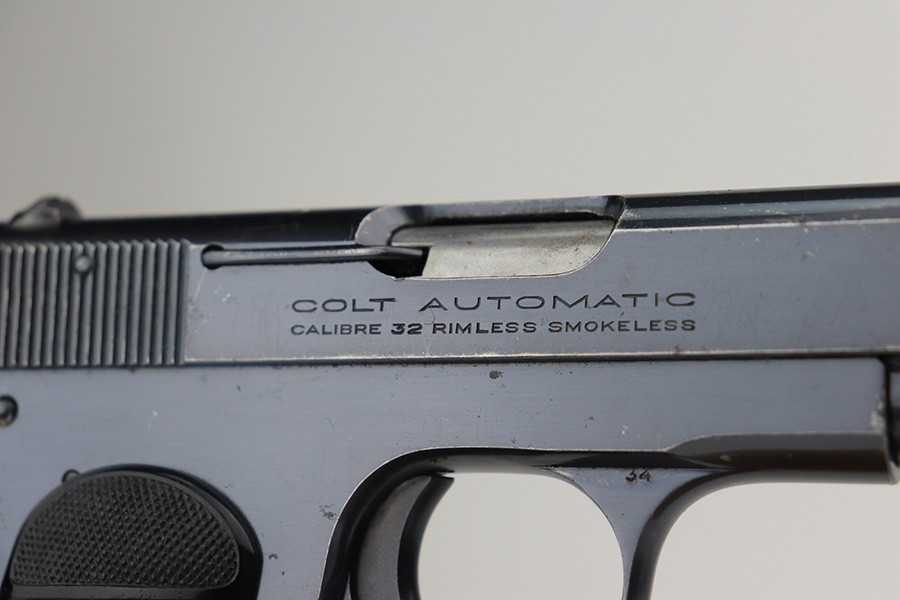 3/3/22 – This is a very nice example of a Colt Model 1903 Pocket Hammerless sold in the commercial market in 1923. The gun is all matching and has retained about 92% of its original high polish Colt bluing. There is muzzle wear and areas of spotty, scratchy wear on both sides of the slide (mostly concentrated around the high edges and on the top). There is also some light scratchy wear on both grip straps. Comes with excellent black hard rubber grips and one proper magazine. The bore has good rifling, but there is pin-pricking throughout and a few tiny pits near the muzzle end.