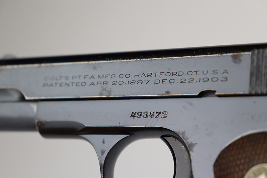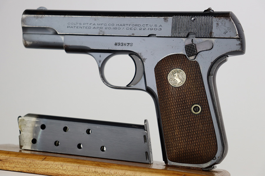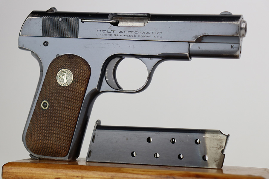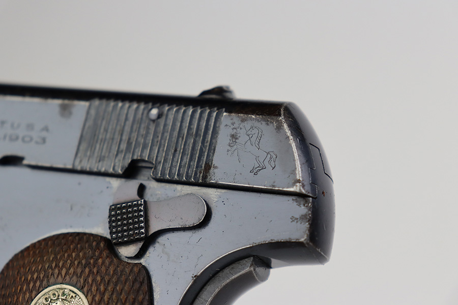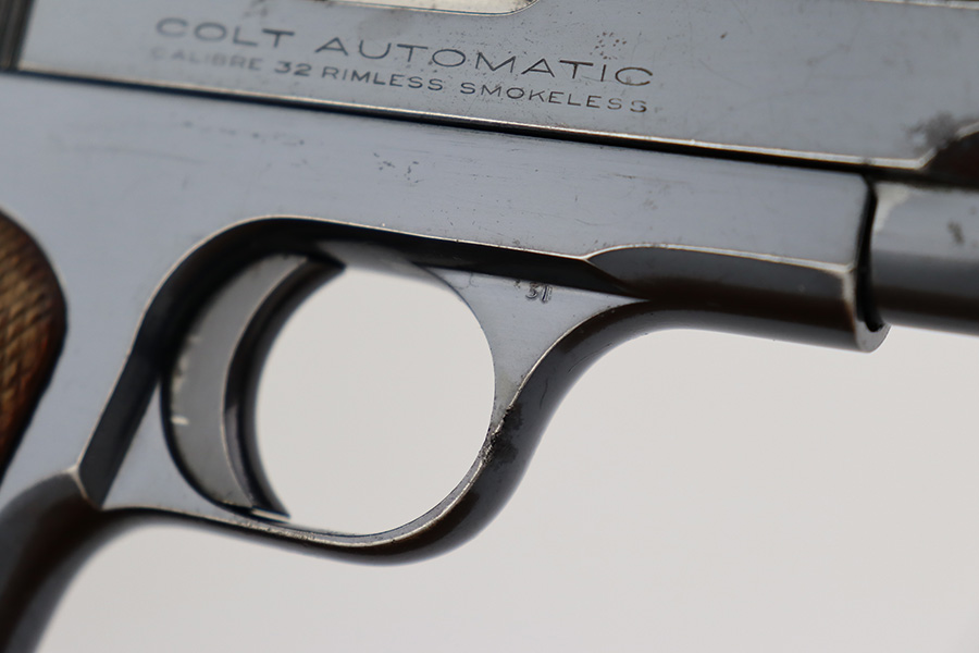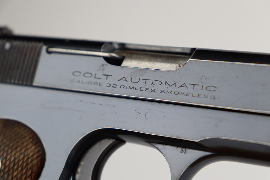 7/12/23 – This is a nice example of a Colt Model 1903 Pocket Hammerless, manufactured in 1929 and chambered in .32 ACP. All matching. It has retained roughly 85% of its original high polish finish. There is wear around the muzzle and on the high edges of the slide, thinning on the back strap, and light spotty wear on the front strap. There are also areas of surface oxidation and tiny pitting here and there, most noticeable on the left side of the gun. Fitted with excellent period-correct wood grips and comes with one proper magazine. Minty bore.