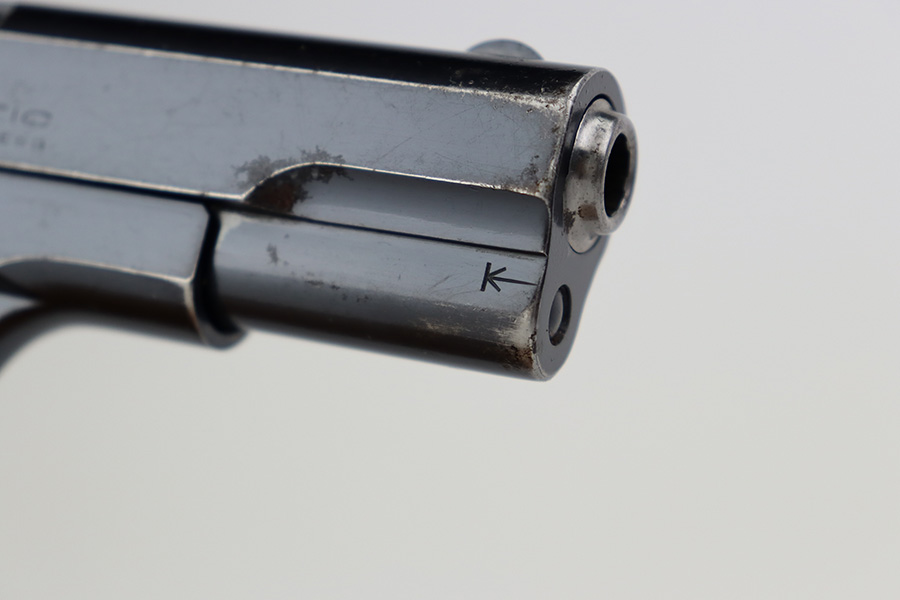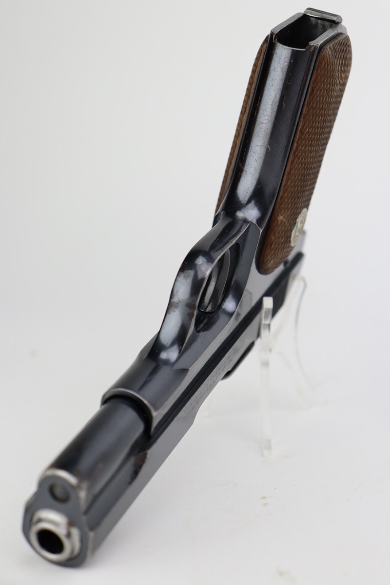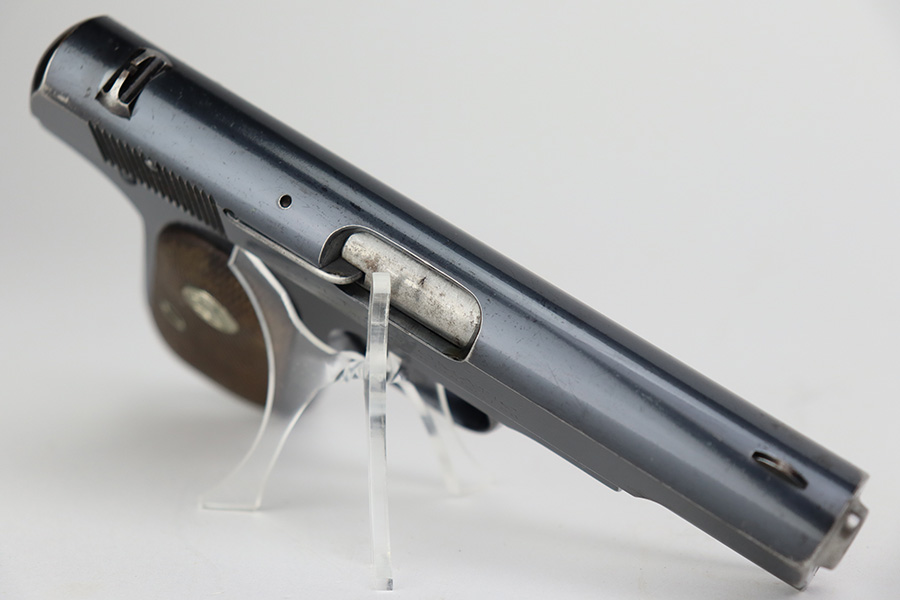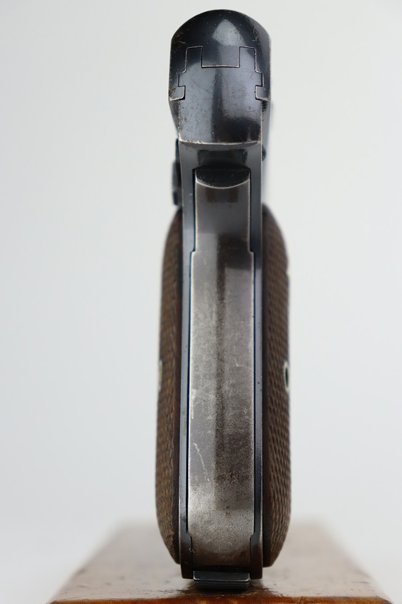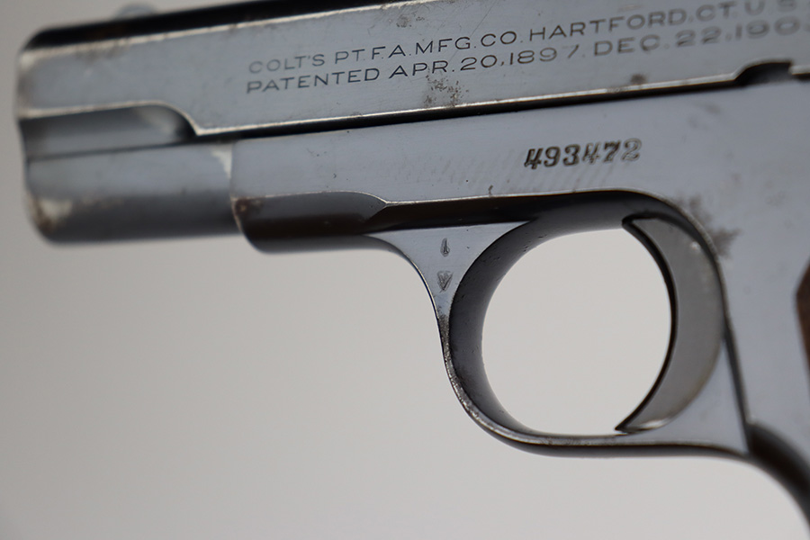 7/12/23 – This is a nice example of a Colt Model 1903 Pocket Hammerless, manufactured in 1929 and chambered in .32 ACP. All matching. It has retained roughly 85% of its original high polish finish. There is wear around the muzzle and on the high edges of the slide, thinning on the back strap, and light spotty wear on the front strap. There are also areas of surface oxidation and tiny pitting here and there, most noticeable on the left side of the gun. Fitted with excellent period-correct wood grips and comes with one proper magazine. Minty bore.