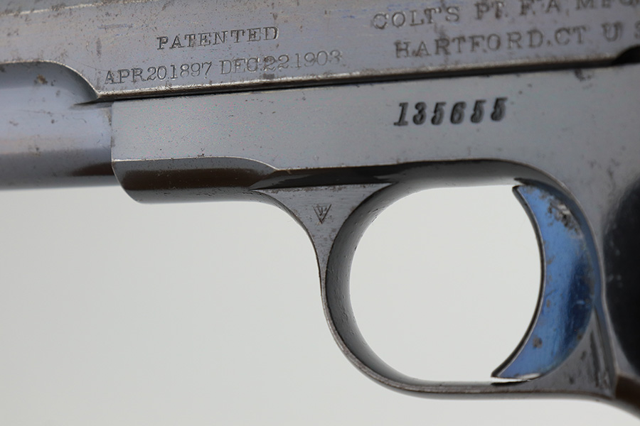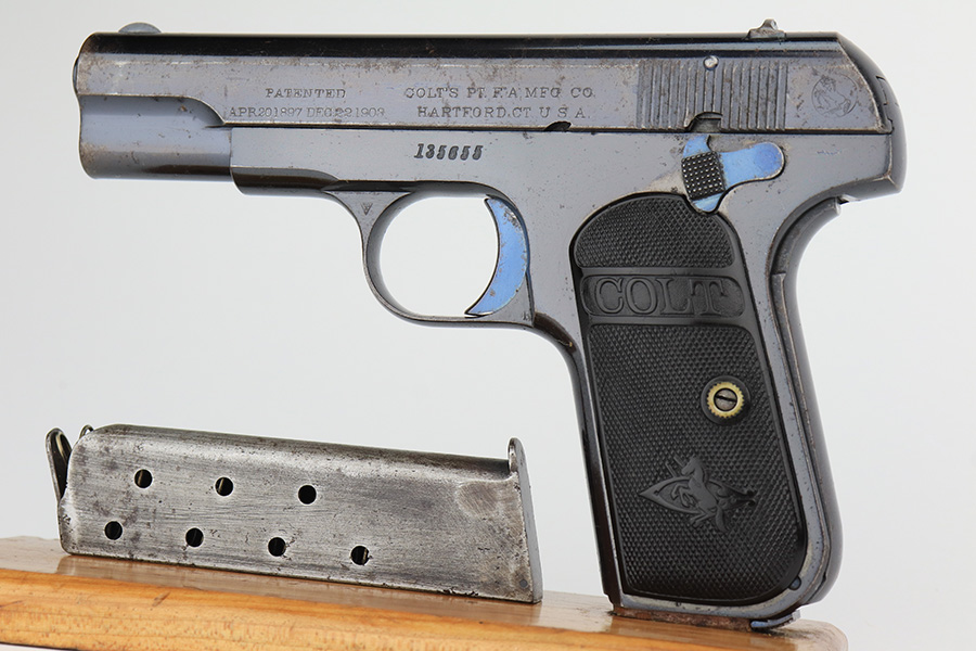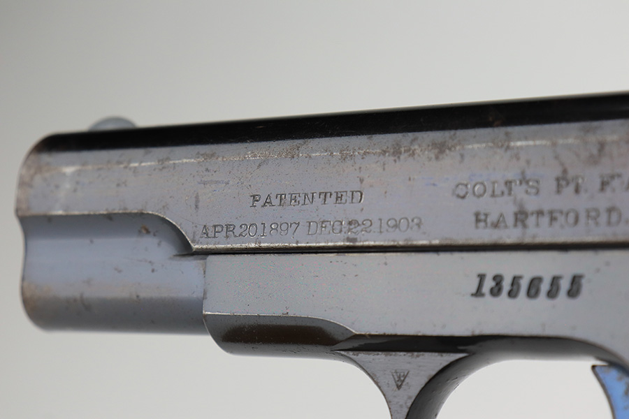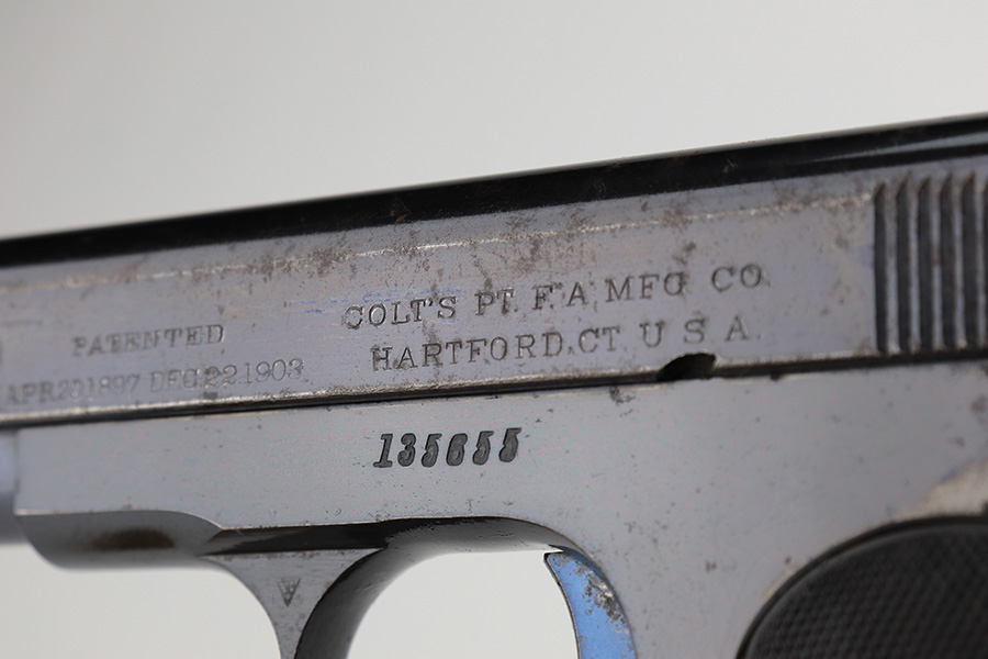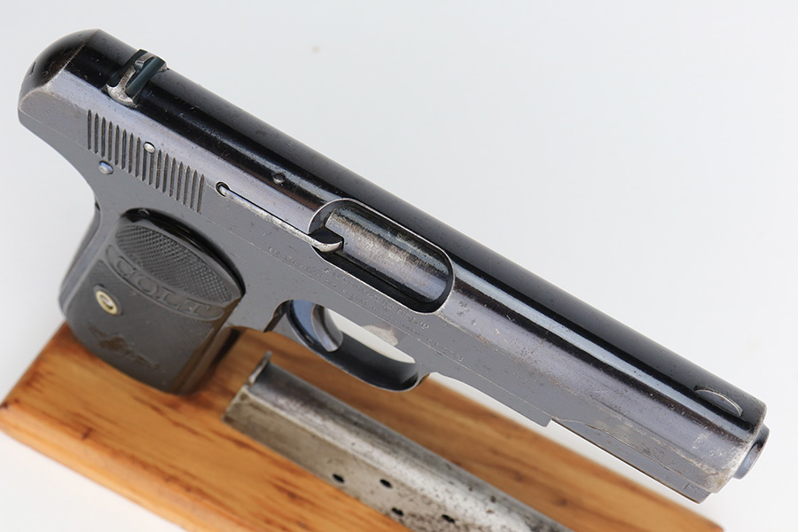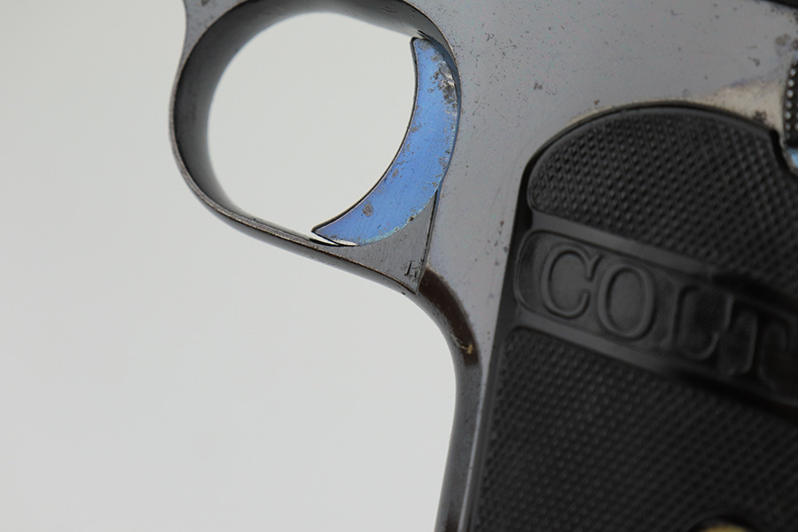 3/28/23 – This is a nice example of a Colt Model 1903 Pocket Hammerless manufactured in 1912 and chambered in .32 ACP. It is all matching and has retained somewhere between 85-90% of its original high polish finish. There is light scratchy, spotty wear throughout and one small spot of discoloration on the right side of the frame. Very nice fire blue on the small parts. Excellent period-correct black hard rubber grips. The bore has good rifling, but there is pin-pricking throughout. Comes with one proper magazine.