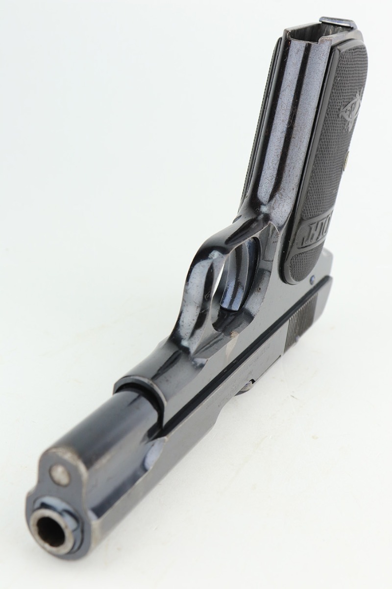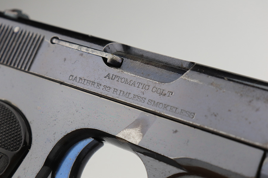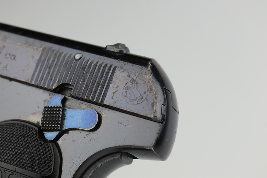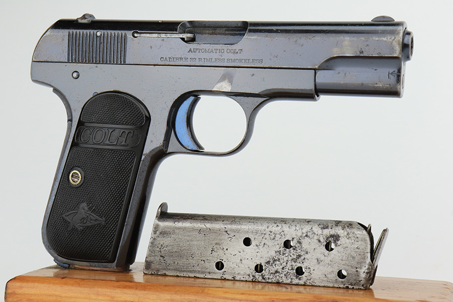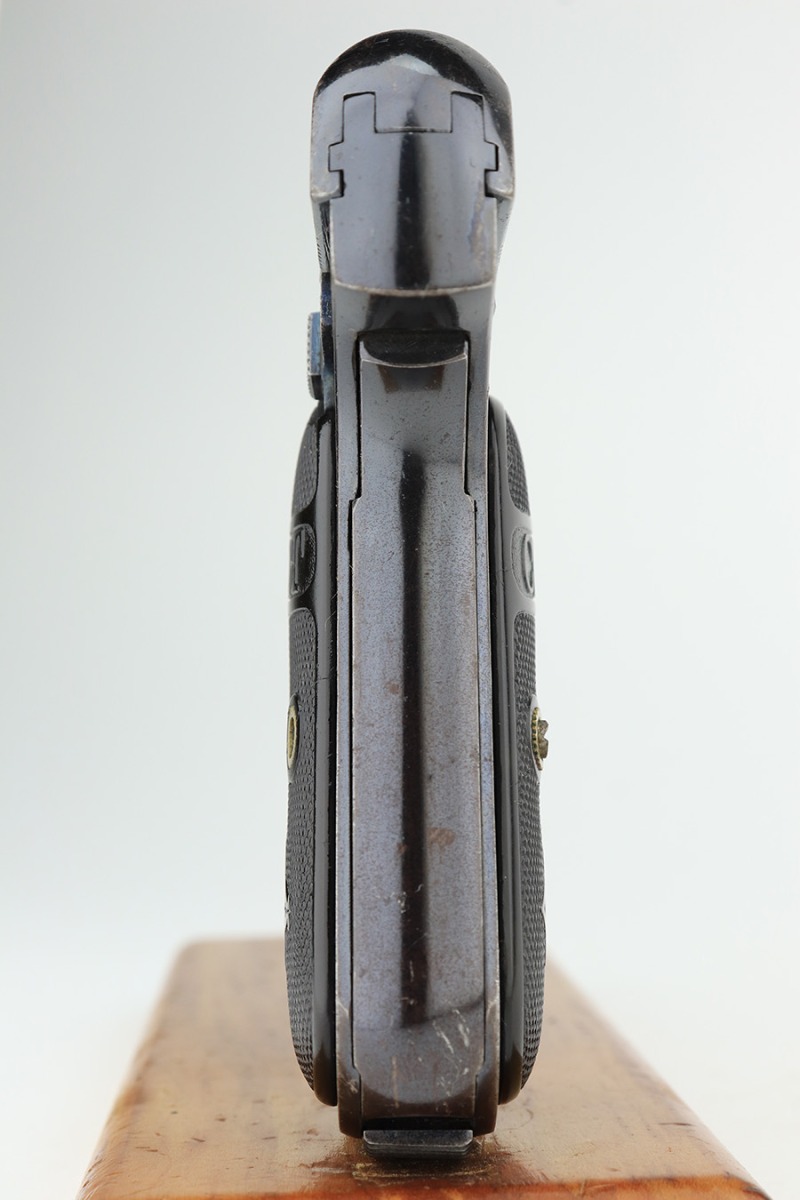 3/28/23 – This is a nice example of a Colt Model 1903 Pocket Hammerless manufactured in 1912 and chambered in .32 ACP. It is all matching and has retained somewhere between 85-90% of its original high polish finish. There is light scratchy, spotty wear throughout and one small spot of discoloration on the right side of the frame. Very nice fire blue on the small parts. Excellent period-correct black hard rubber grips. The bore has good rifling, but there is pin-pricking throughout. Comes with one proper magazine.