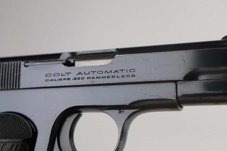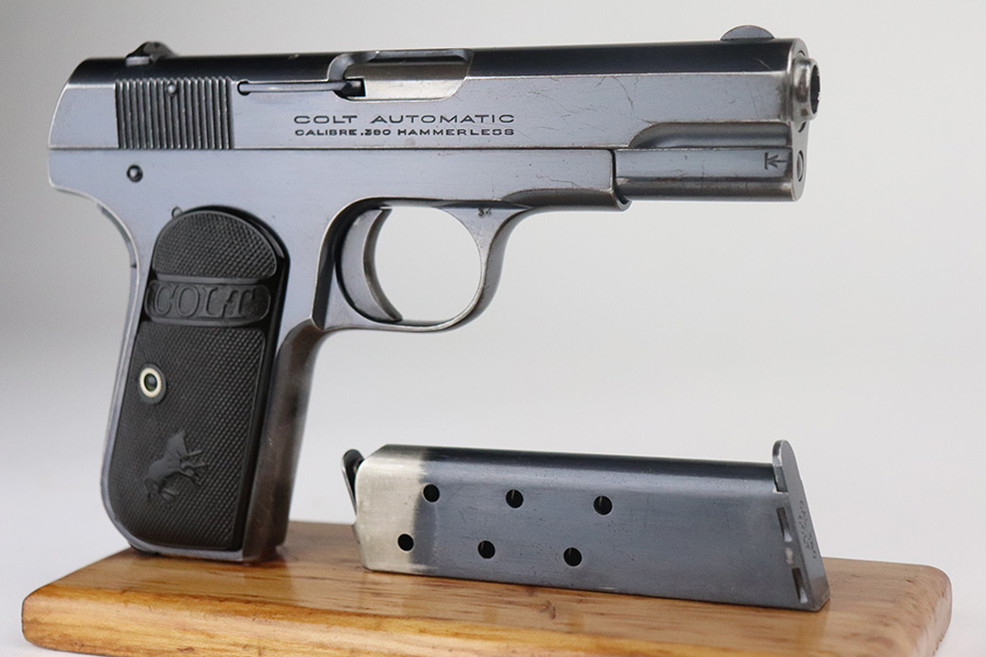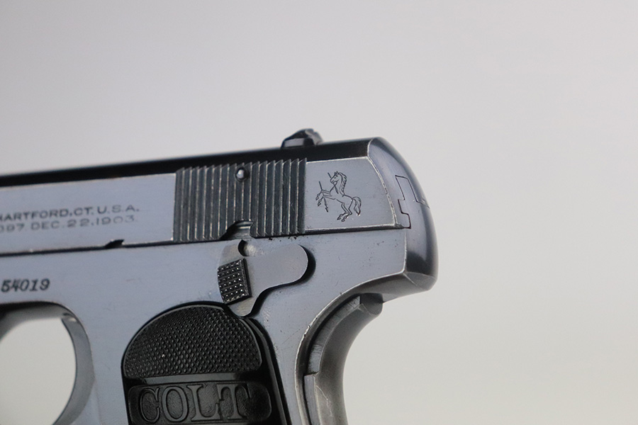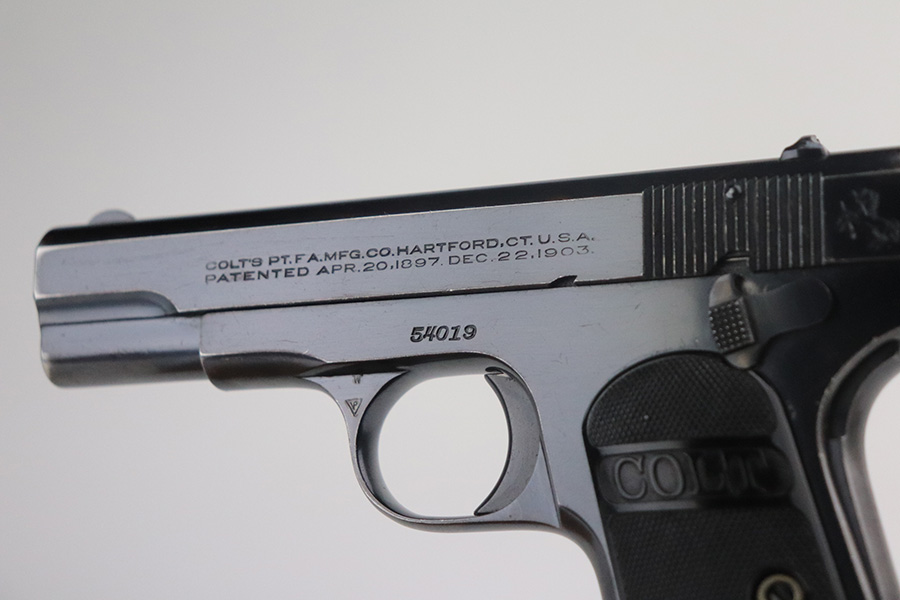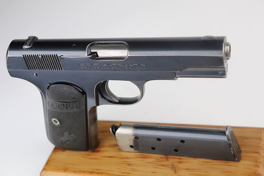 7/13/21 – This is a nice example of a Colt Model 1908 manufactured in 1922. It is all matching and correct. It has retained roughly 75-80% of its original high polish finish. Most of the finish loss is on the straps where there is also some spotty oxidation. There is minor wear on the high edges of the slide and around the muzzle. A few scratches along the slide. Comes with nice hard rubber grips. There is a repaired chip adjacent to the screw on the right side. Also comes with one proper magazine. The bore has good rifling with minor pin-pricking throughout.