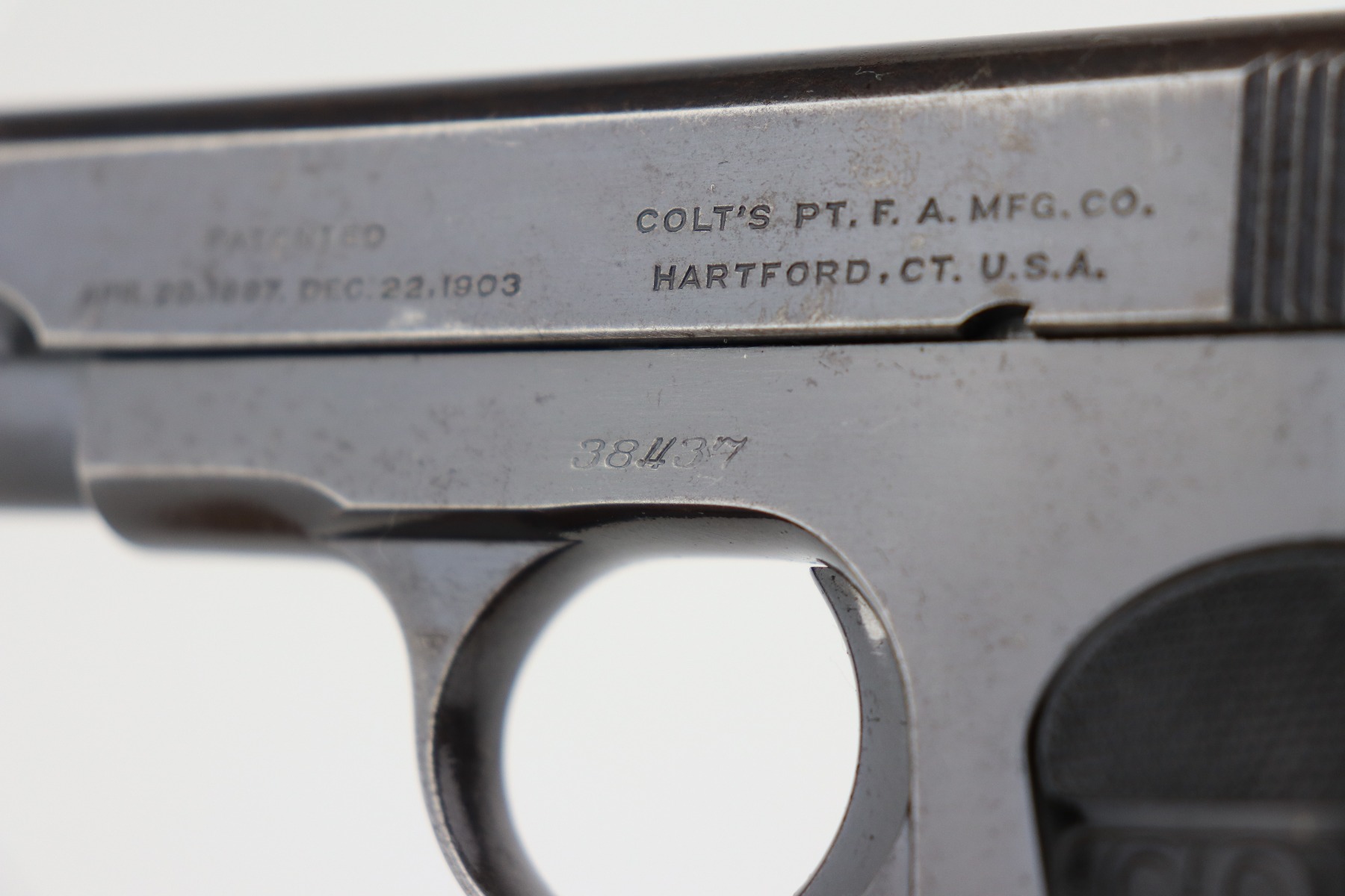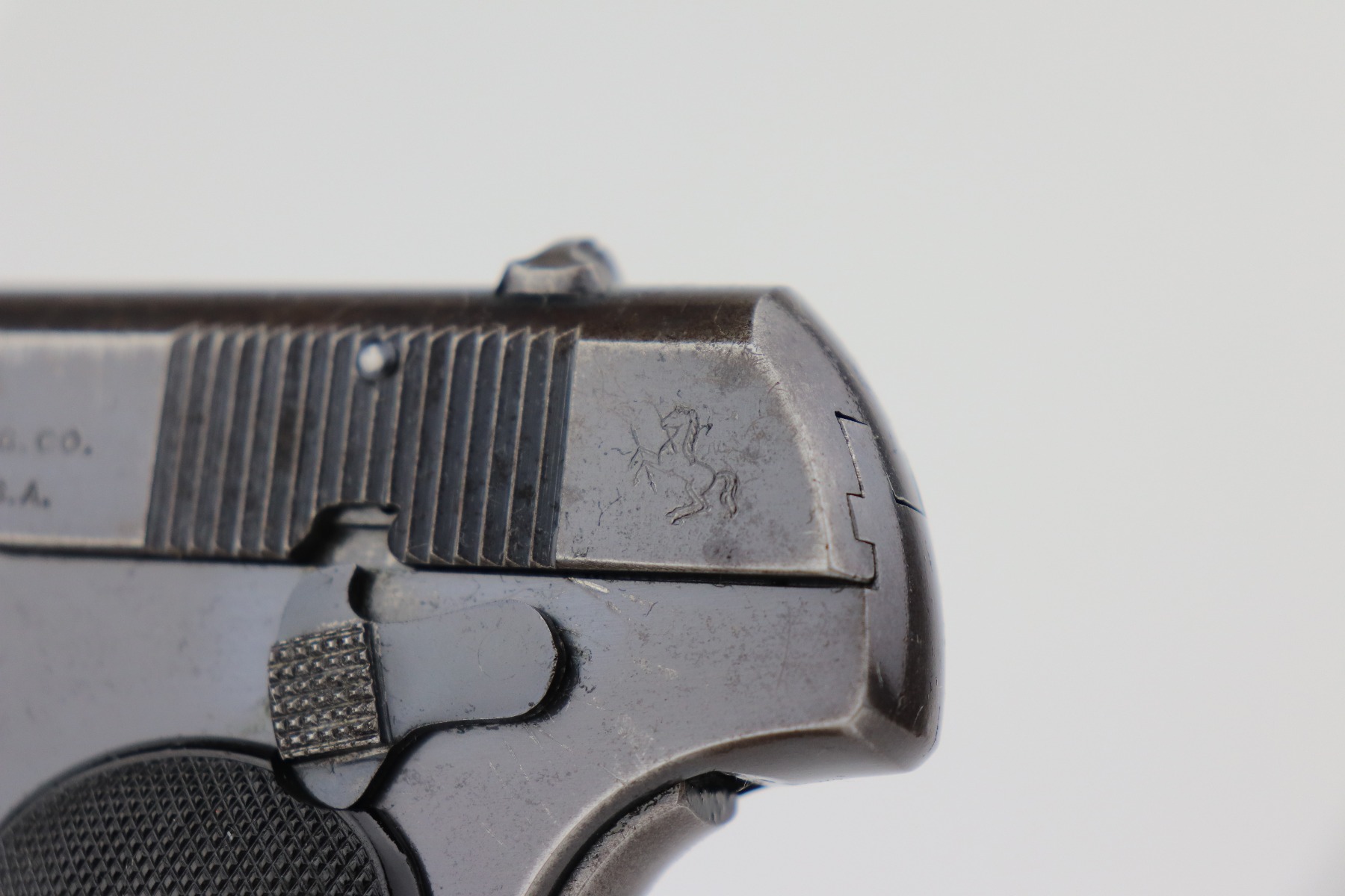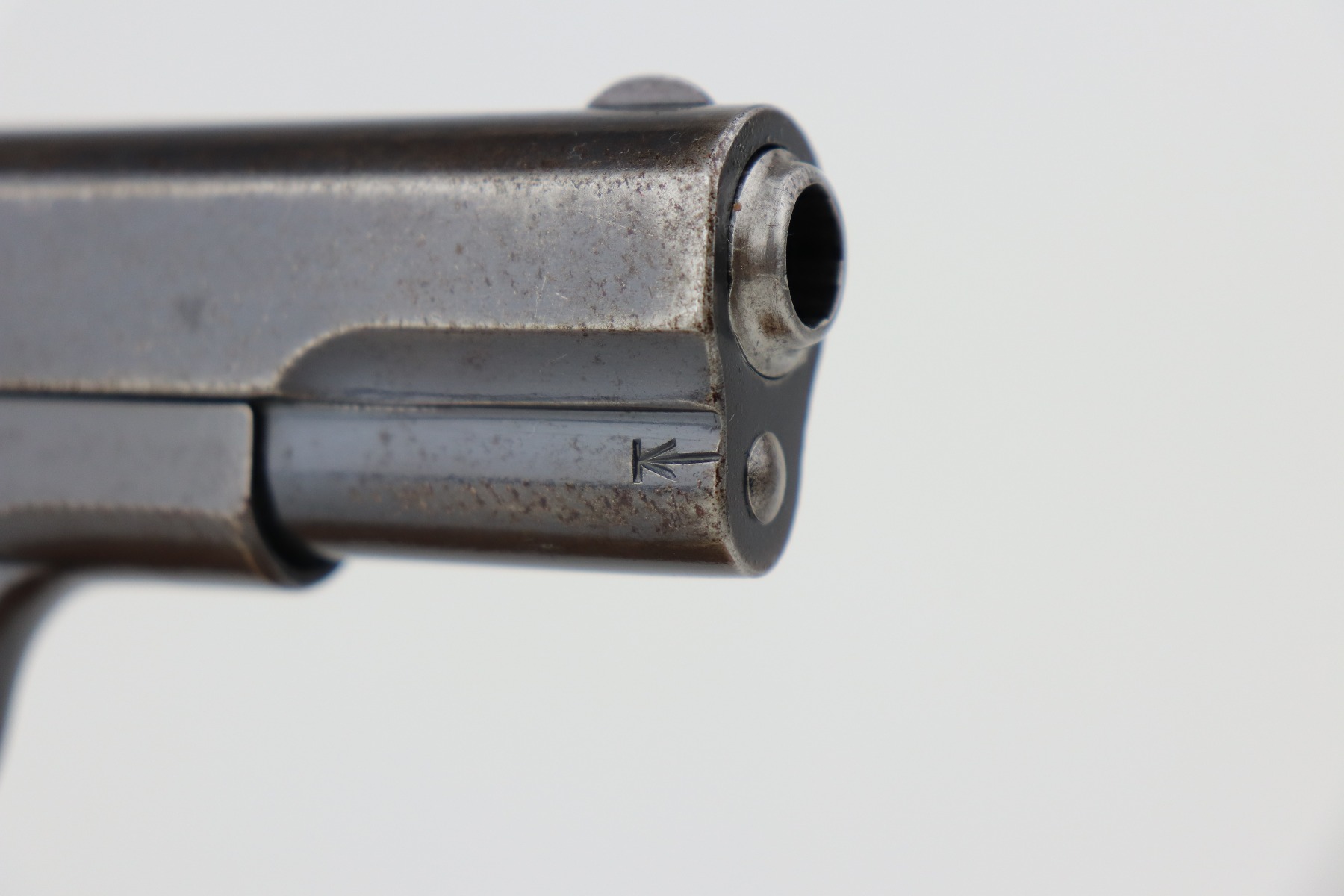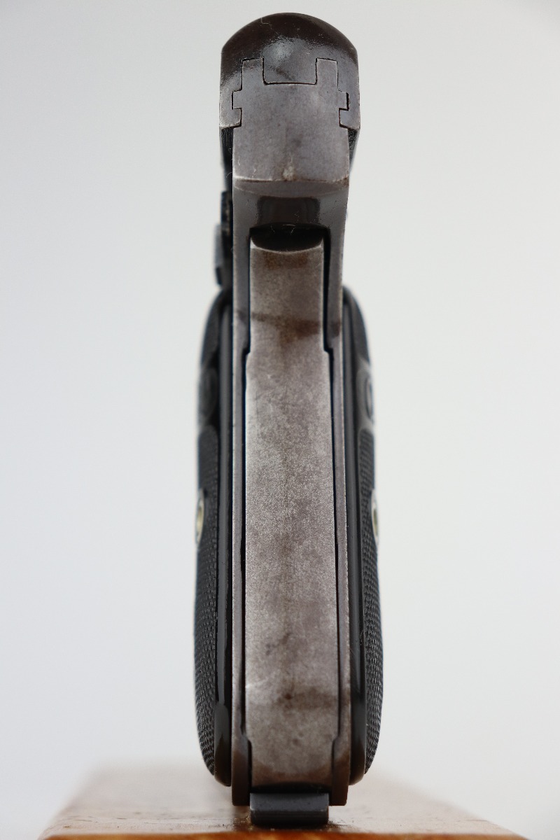 3/30/21 – This is a nice example of a Colt Model 1908 Pocket Hammerless, manufactured in 1921. It is all correct and has retained roughly 80% of its original finish. There is minor spotty wear around the muzzle and high edges of the slide. Thinning on the straps. Spotty oxidation along the slide and on the straps. Comes with excellent grips and a proper magazine. The bore has strong rifling with freckling throughout.