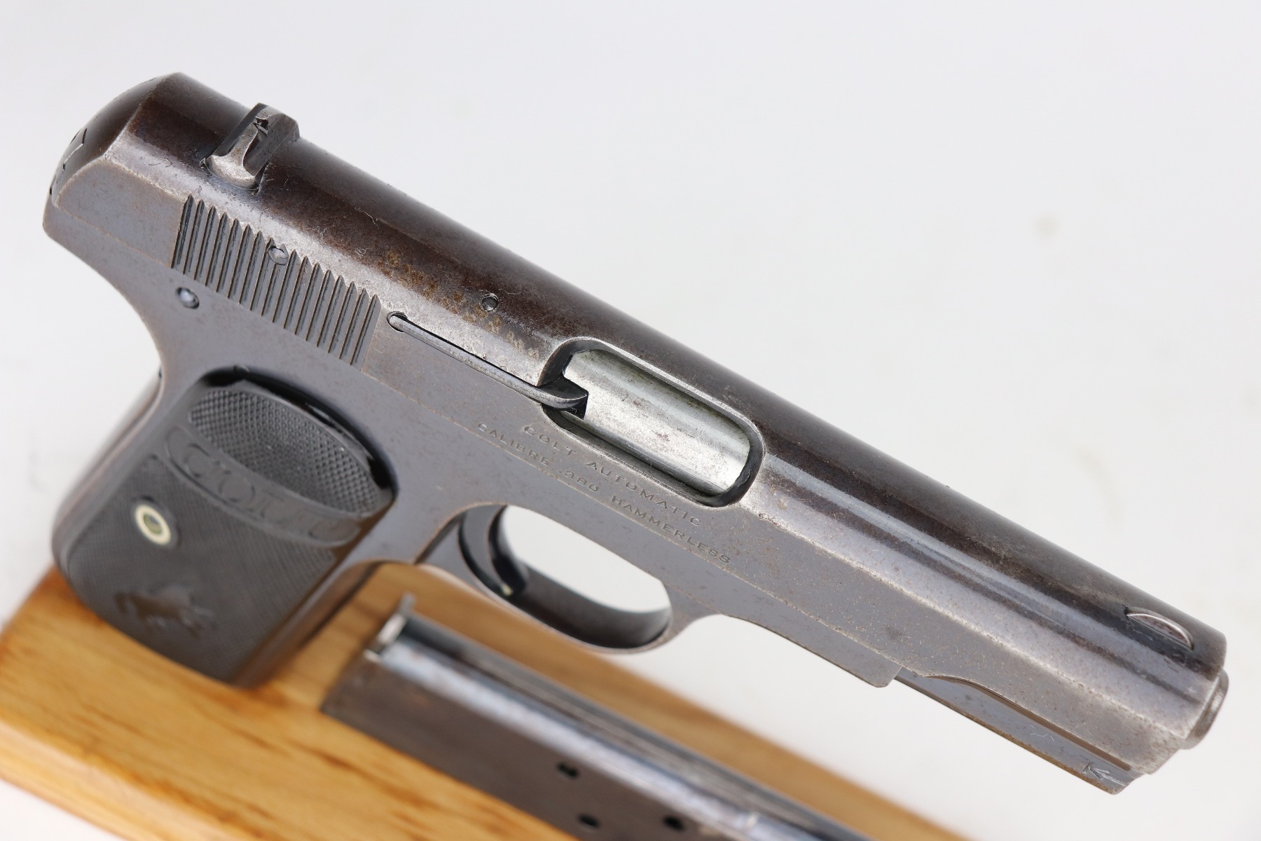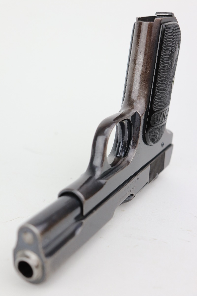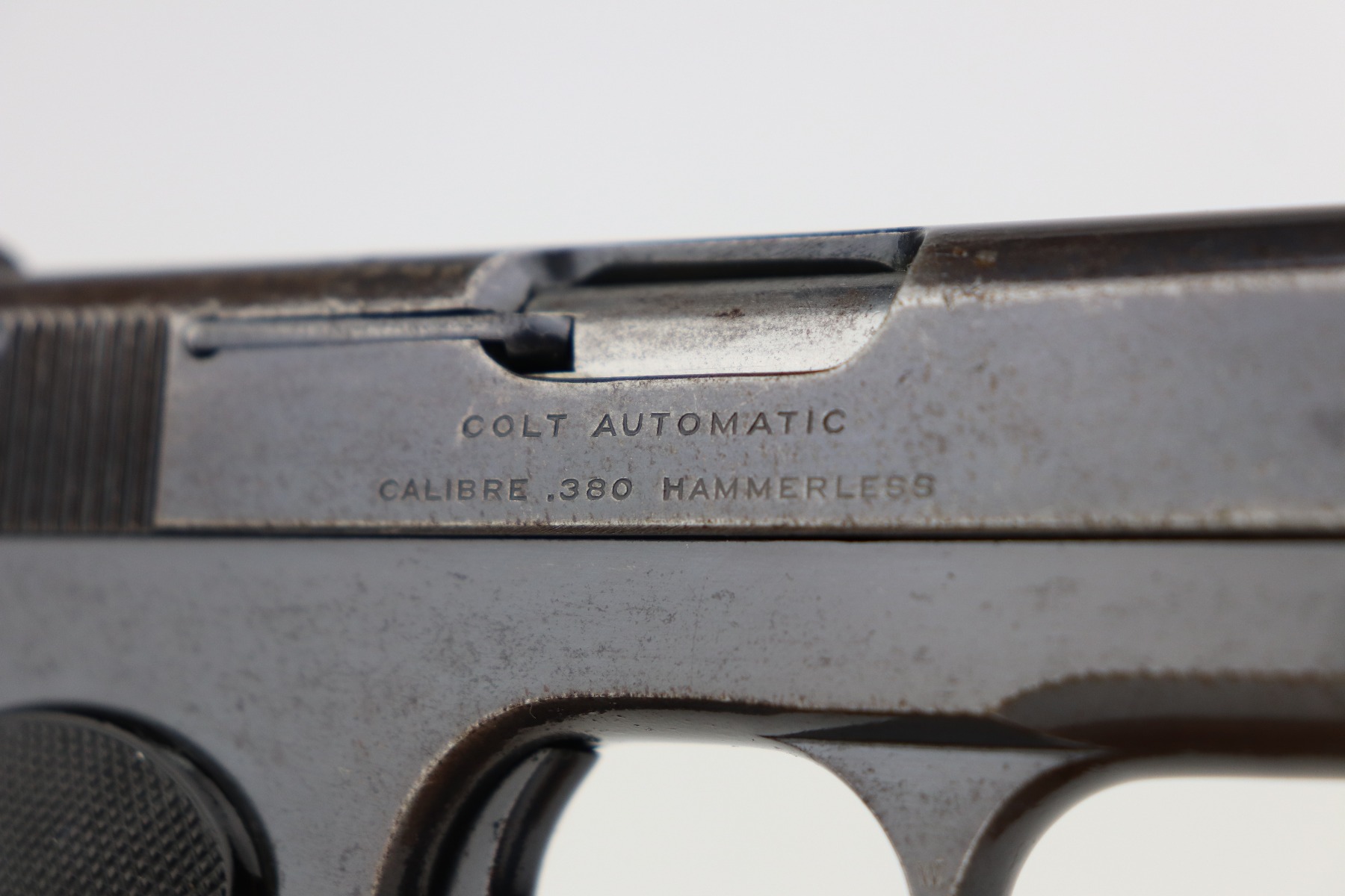 3/30/21 – This is a nice example of a Colt Model 1908 Pocket Hammerless, manufactured in 1921. It is all correct and has retained roughly 80% of its original finish. There is minor spotty wear around the muzzle and high edges of the slide. Thinning on the straps. Spotty oxidation along the slide and on the straps. Comes with excellent grips and a proper magazine. The bore has strong rifling with freckling throughout.