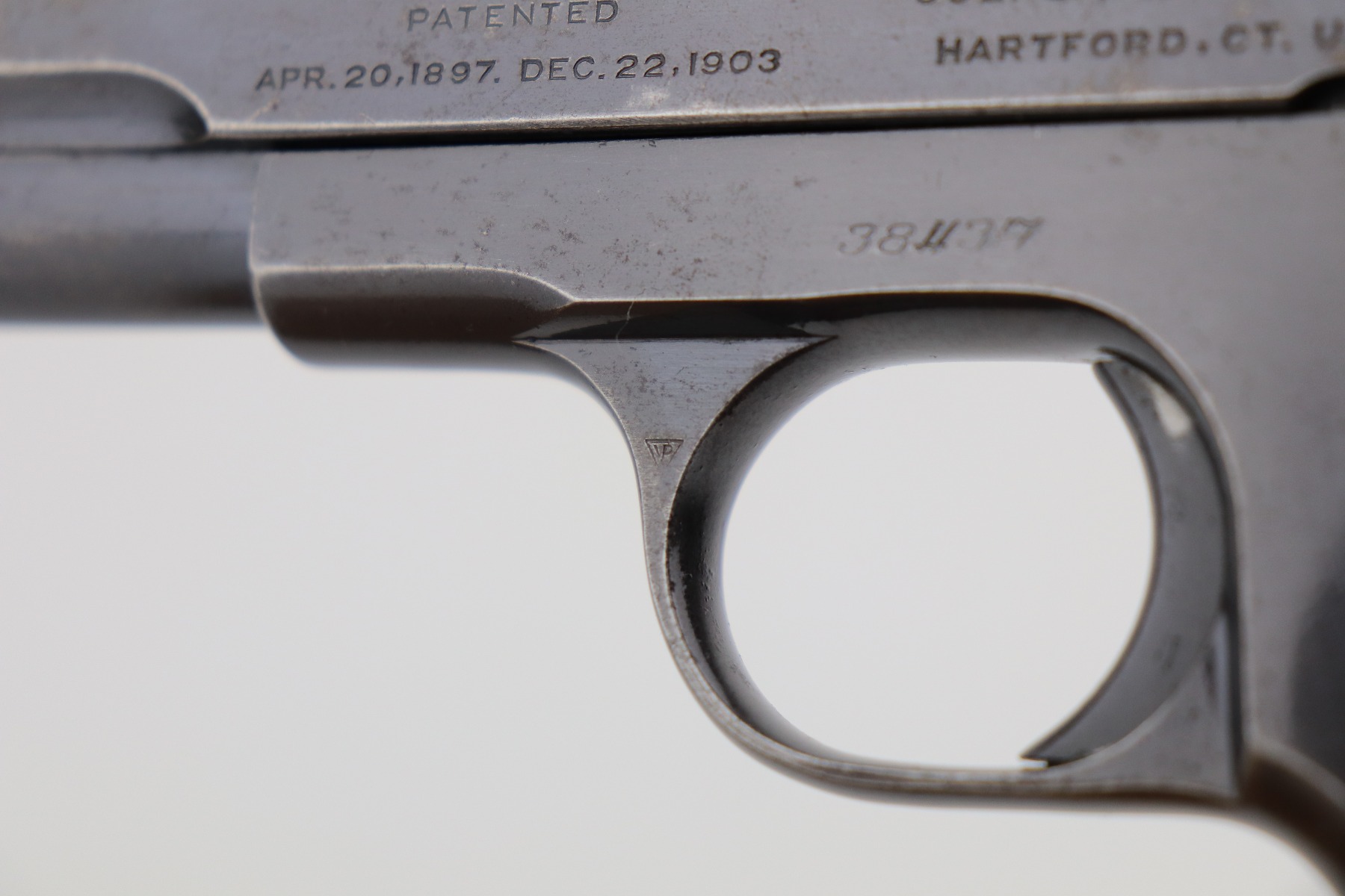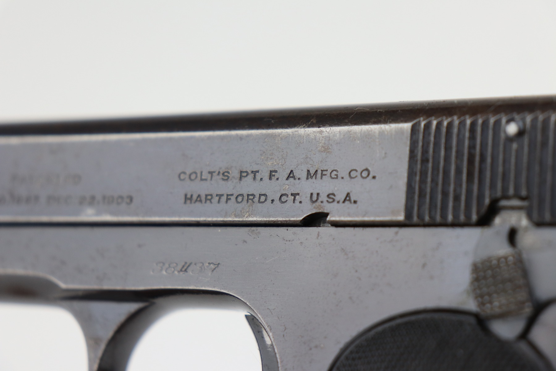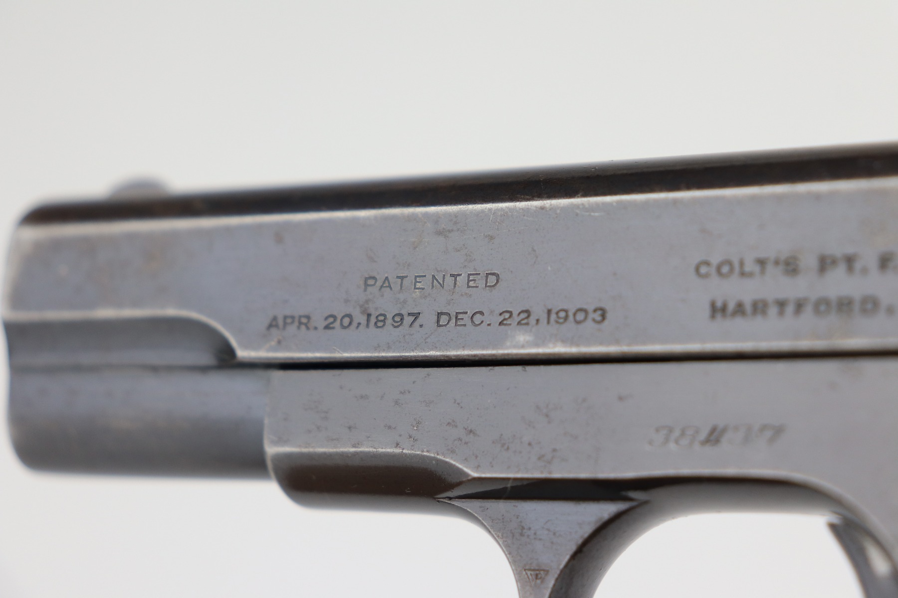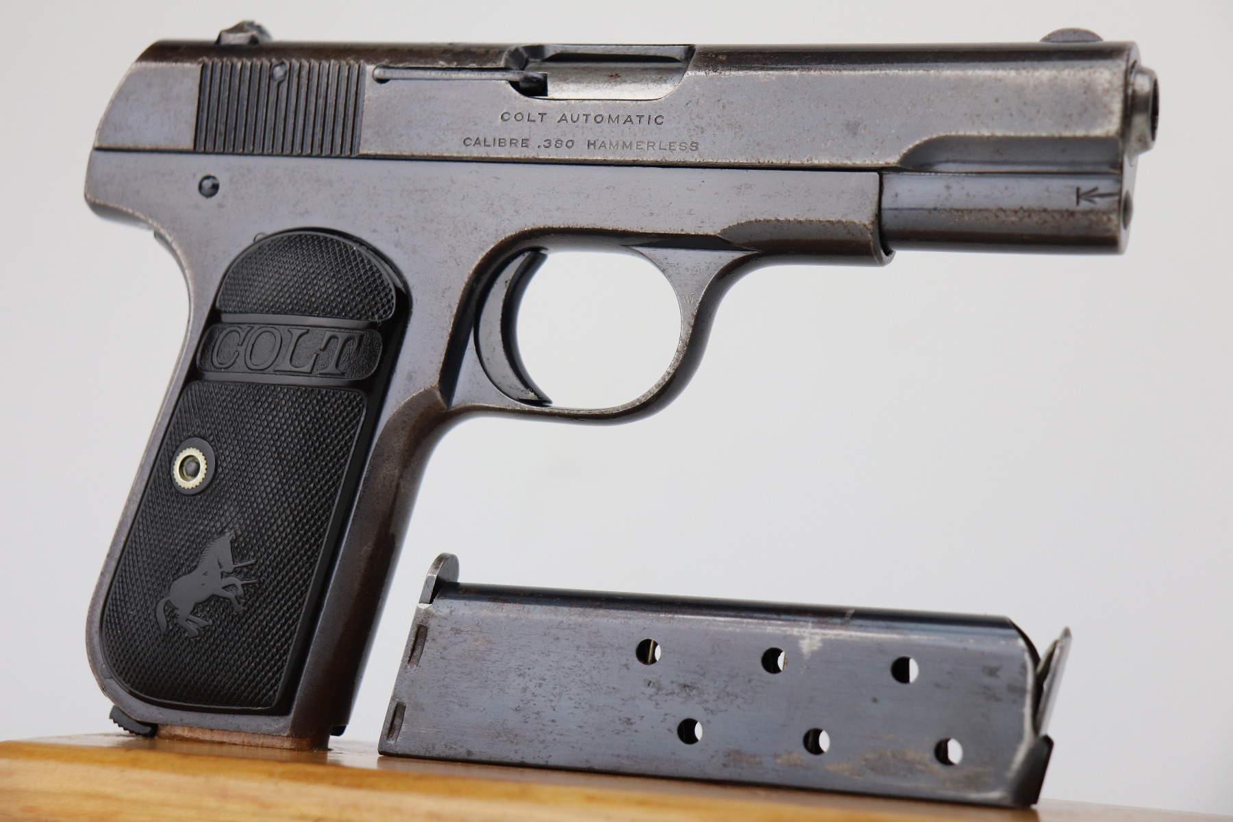 3/30/21 – This is a nice example of a Colt Model 1908 Pocket Hammerless, manufactured in 1921. It is all correct and has retained roughly 80% of its original finish. There is minor spotty wear around the muzzle and high edges of the slide. Thinning on the straps. Spotty oxidation along the slide and on the straps. Comes with excellent grips and a proper magazine. The bore has strong rifling with freckling throughout.