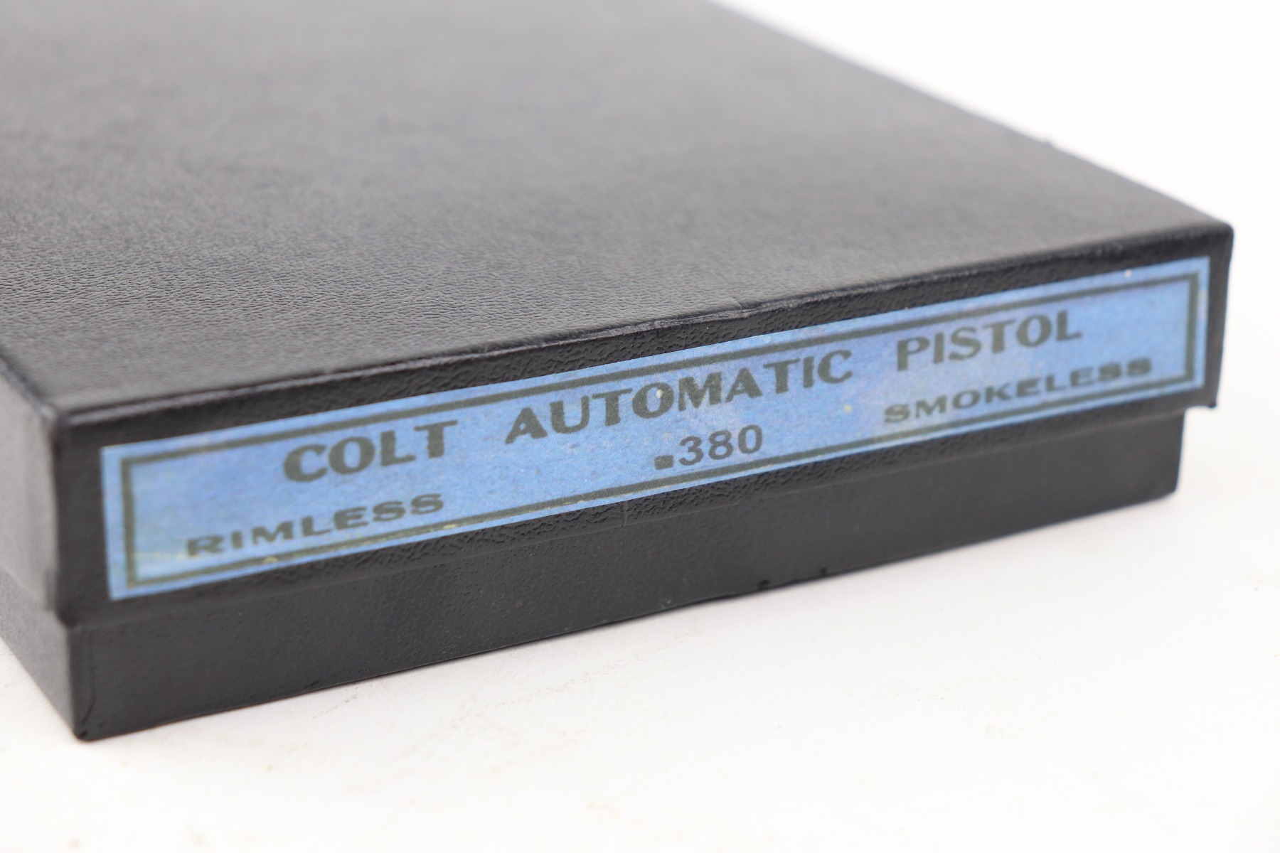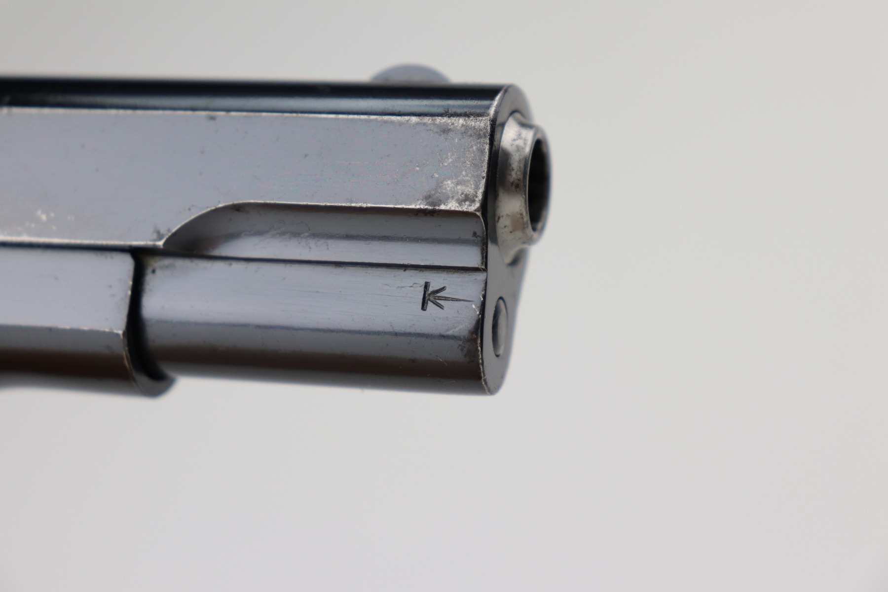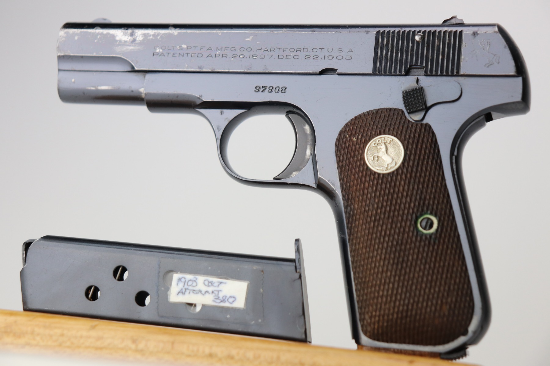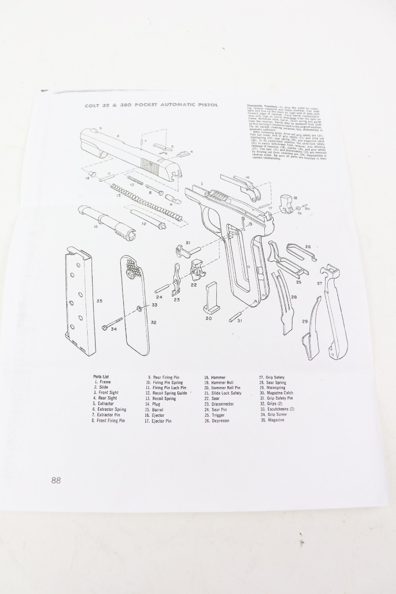 3/1/21 – This is a very nice example of a Colt Model 1908 Pocket Hammerless, chambered in .380 ACP. It was manufactured in 1928. This one comes with a Colt factory letter, an aftermarket box, two original magazines, one aftermarket magazine, a magazine pouch, a Colt multitool, and printouts of the original owners manual and paperwork. The gun has retained about 90% of its original bluing. There is spotty wear and areas of minor freckling along both sides of the slide. Minor handling marks and pin-pricking on the straps. Excellent grips. The bore is excellent – shiny with strong rifling.