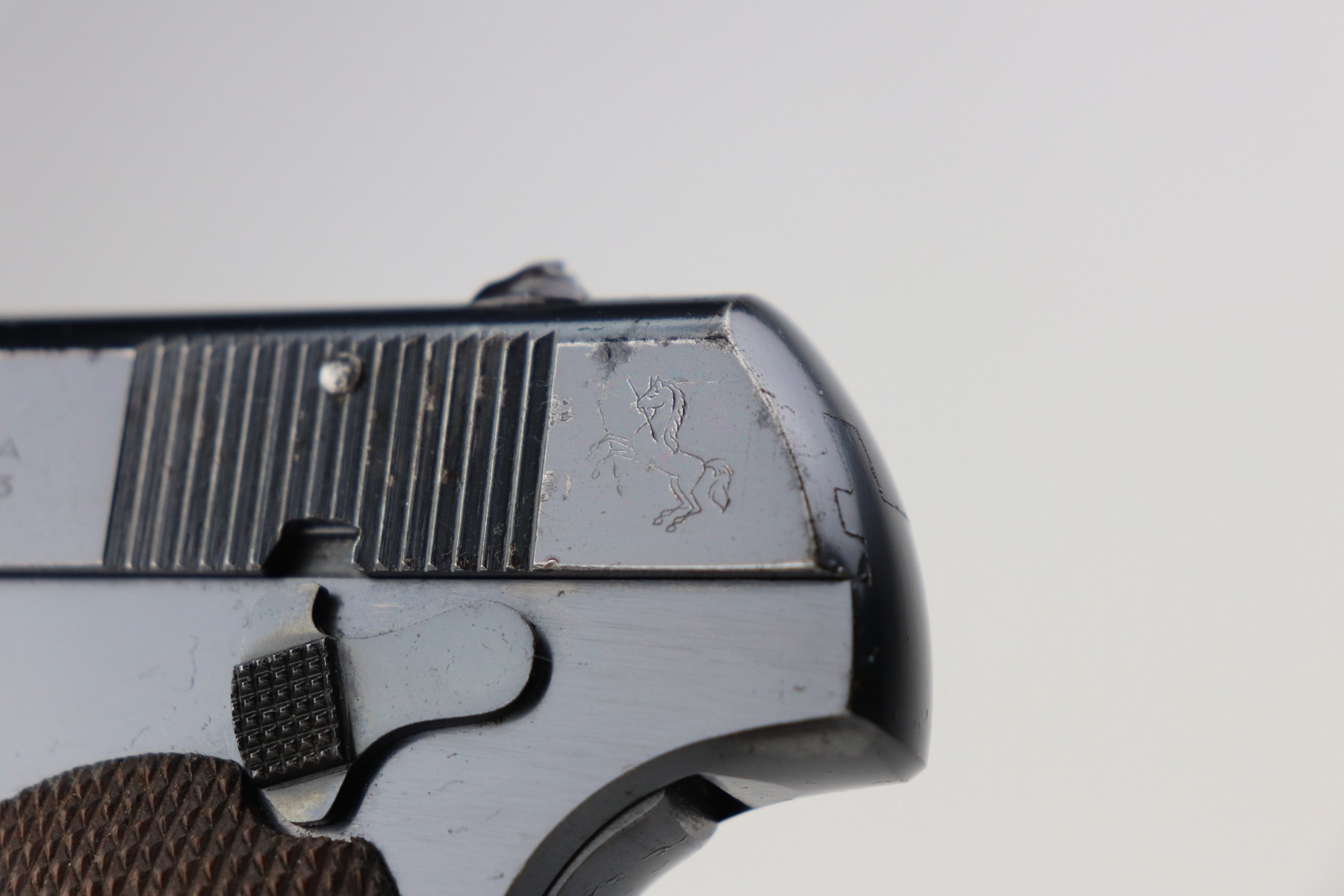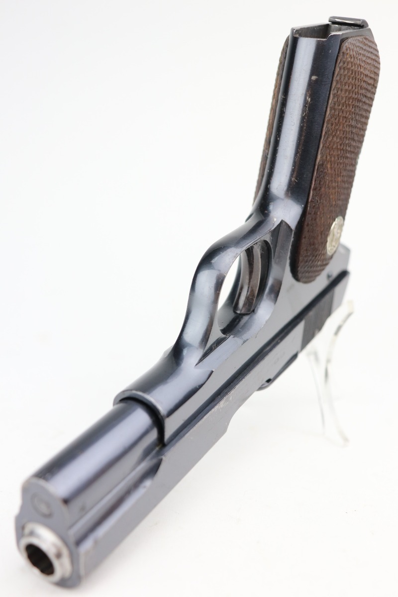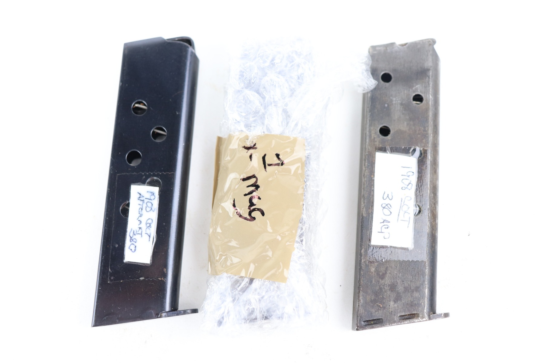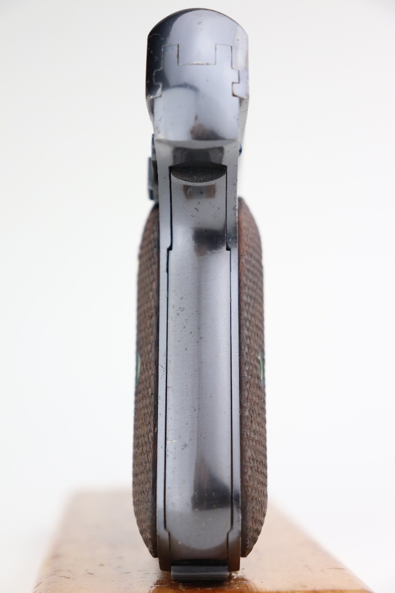 3/1/21 – This is a very nice example of a Colt Model 1908 Pocket Hammerless, chambered in .380 ACP. It was manufactured in 1928. This one comes with a Colt factory letter, an aftermarket box, two original magazines, one aftermarket magazine, a magazine pouch, a Colt multitool, and printouts of the original owners manual and paperwork. The gun has retained about 90% of its original bluing. There is spotty wear and areas of minor freckling along both sides of the slide. Minor handling marks and pin-pricking on the straps. Excellent grips. The bore is excellent – shiny with strong rifling.