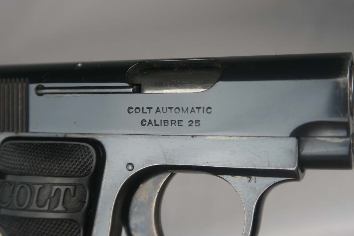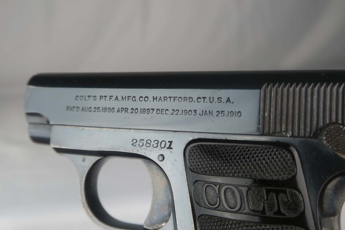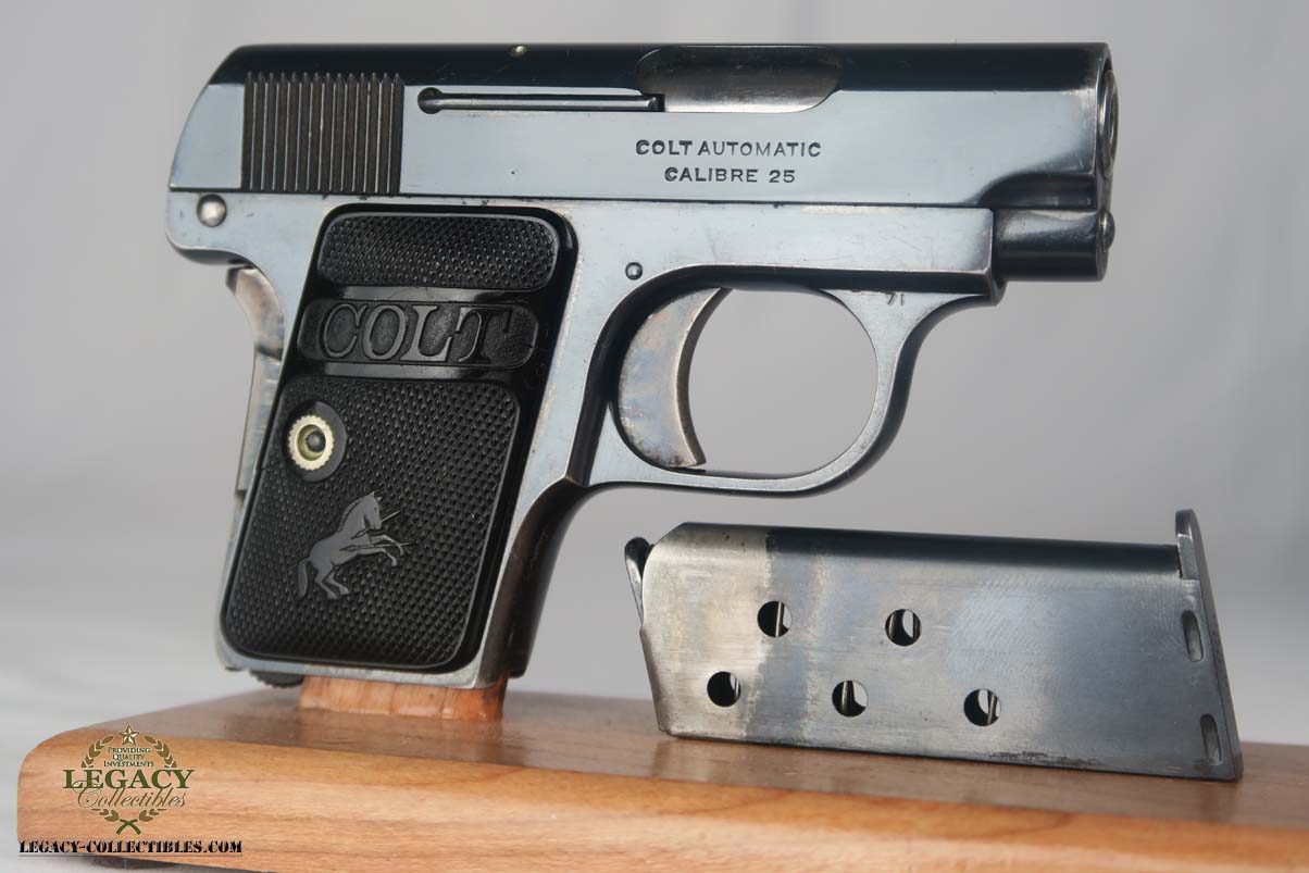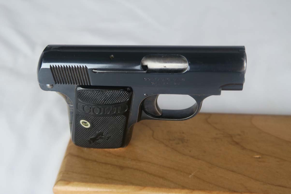 6/14/17 – This is a 1908 Vest Pocket model Colt, in about 85-90% original condition. The bluing on the slide and frame is very nice, but the grip safety shows almost no finish remaining. Colt records date this pistol to 1920. Chambered in .25. Correct grips and magazine. Right grip panel does have a small crack. Strong bore with no major issues.