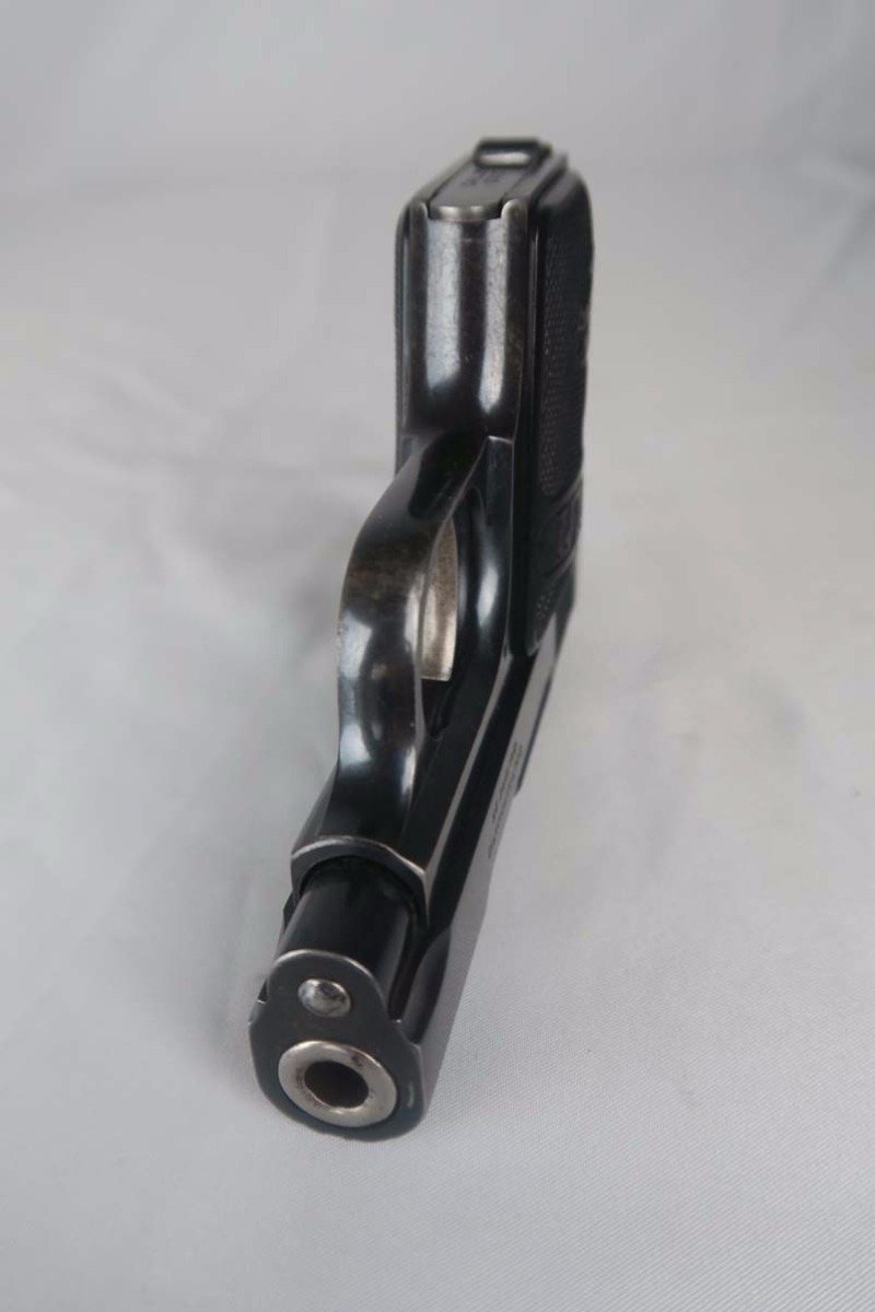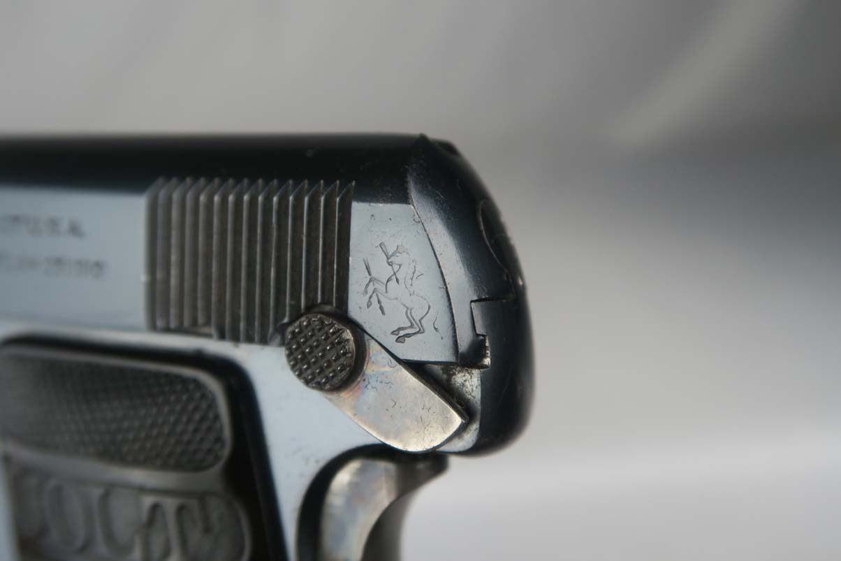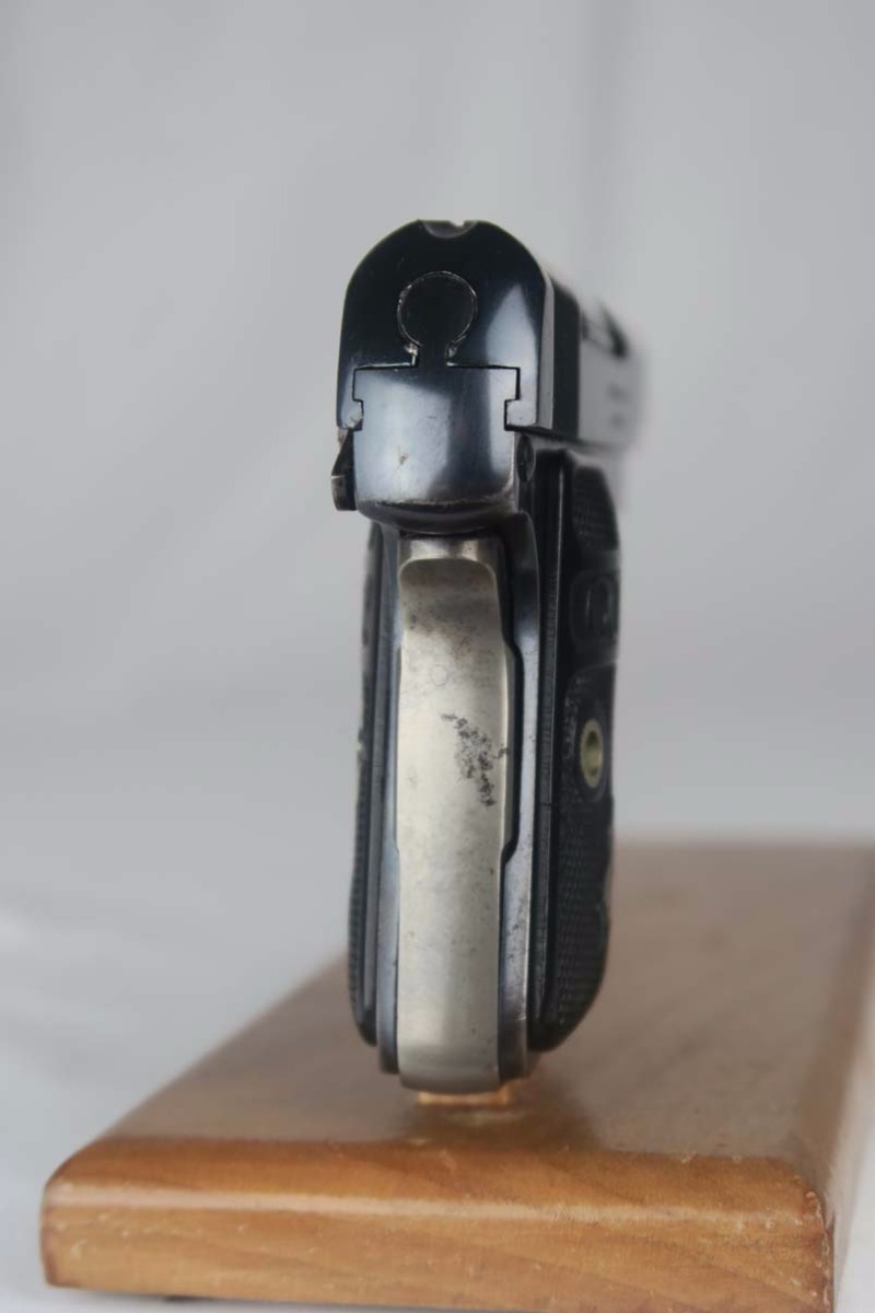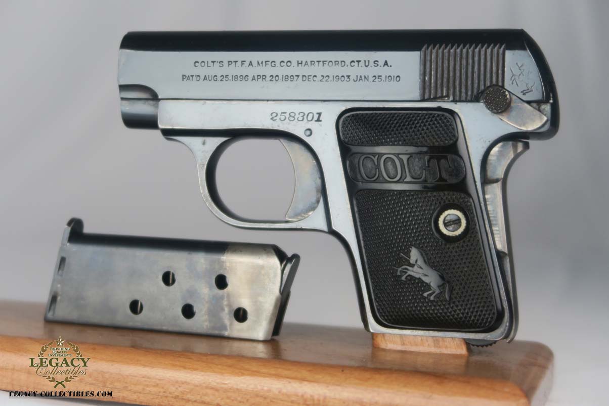6/14/17 – This is a 1908 Vest Pocket model Colt, in about 85-90% original condition. The bluing on the slide and frame is very nice, but the grip safety shows almost no finish remaining. Colt records date this pistol to 1920. Chambered in .25. Correct grips and magazine. Right grip panel does have a small crack. Strong bore with no major issues.