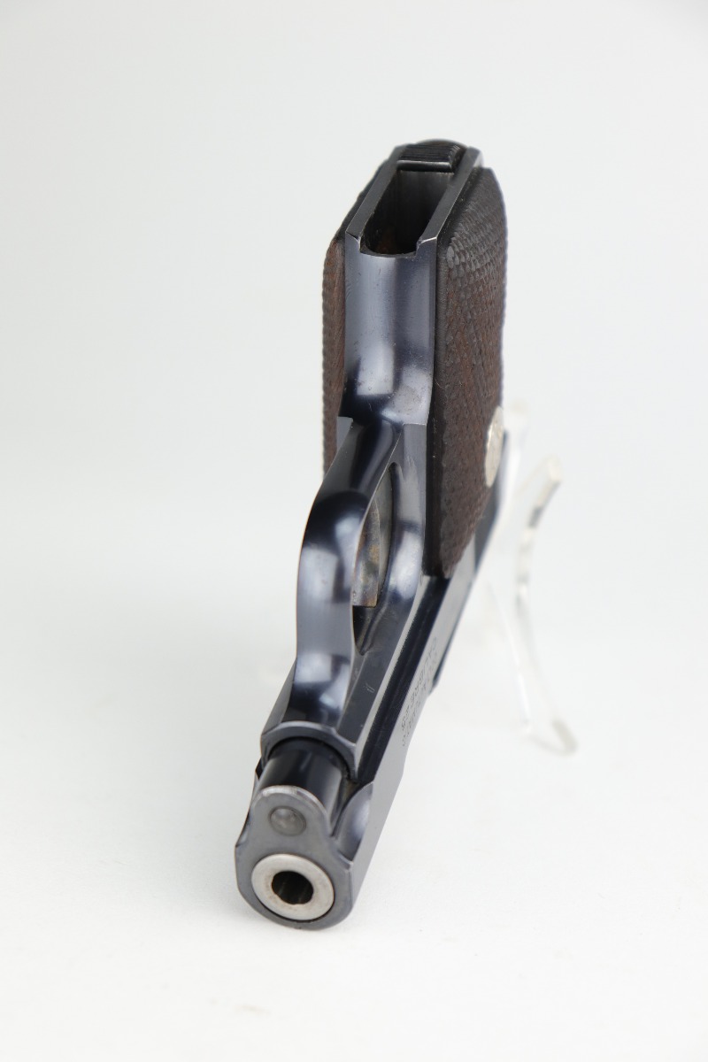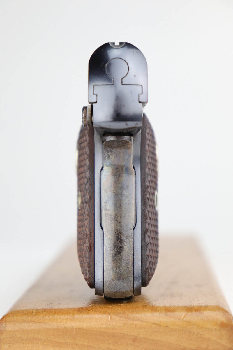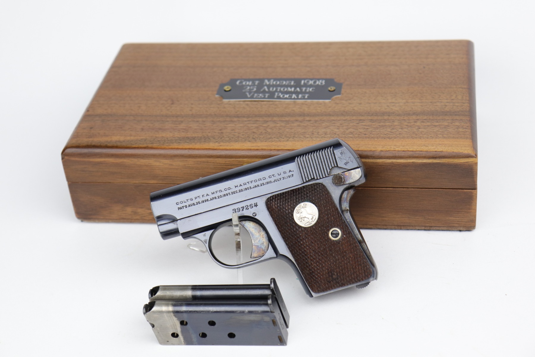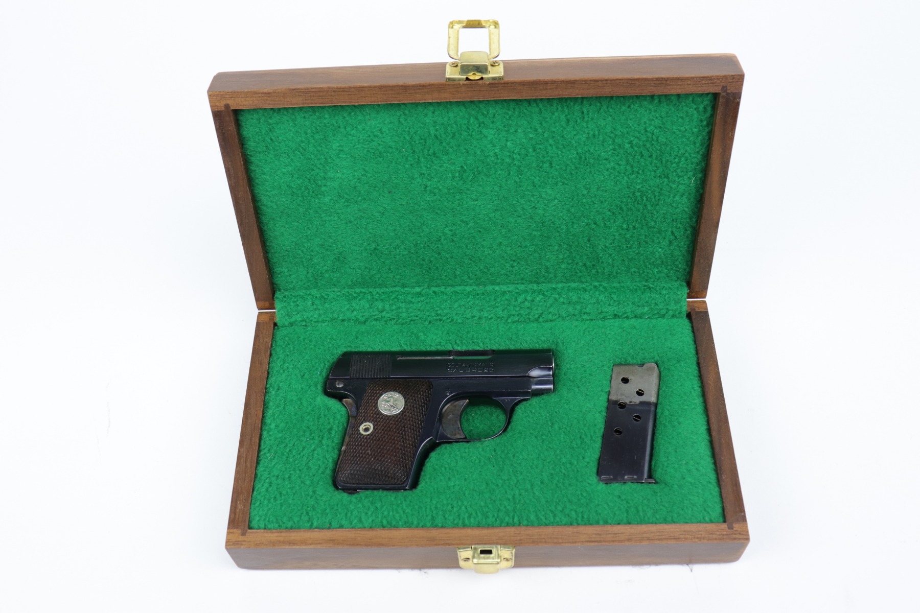 10/8/20 – This is a mint example of a Colt Model 1908 Vest Pocket Pistol, chambered in .25. From the serial number, it was manufactured in 1933. This one comes with a beautiful custom-made wood presentation box that is lined with green velvet. The small parts have retained their case-hardening. There is almost no finish loss on this gun, just some minor freckling on the straps. It is fully functional, has excellent grips, and comes with two original magazines. The bore is mint.