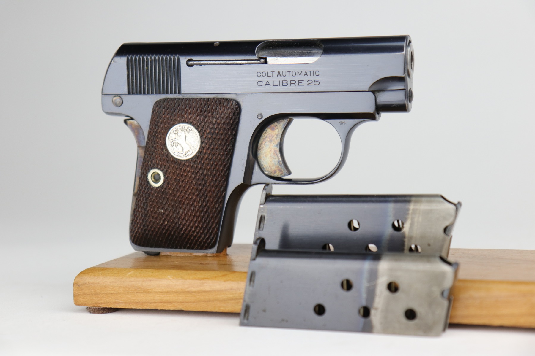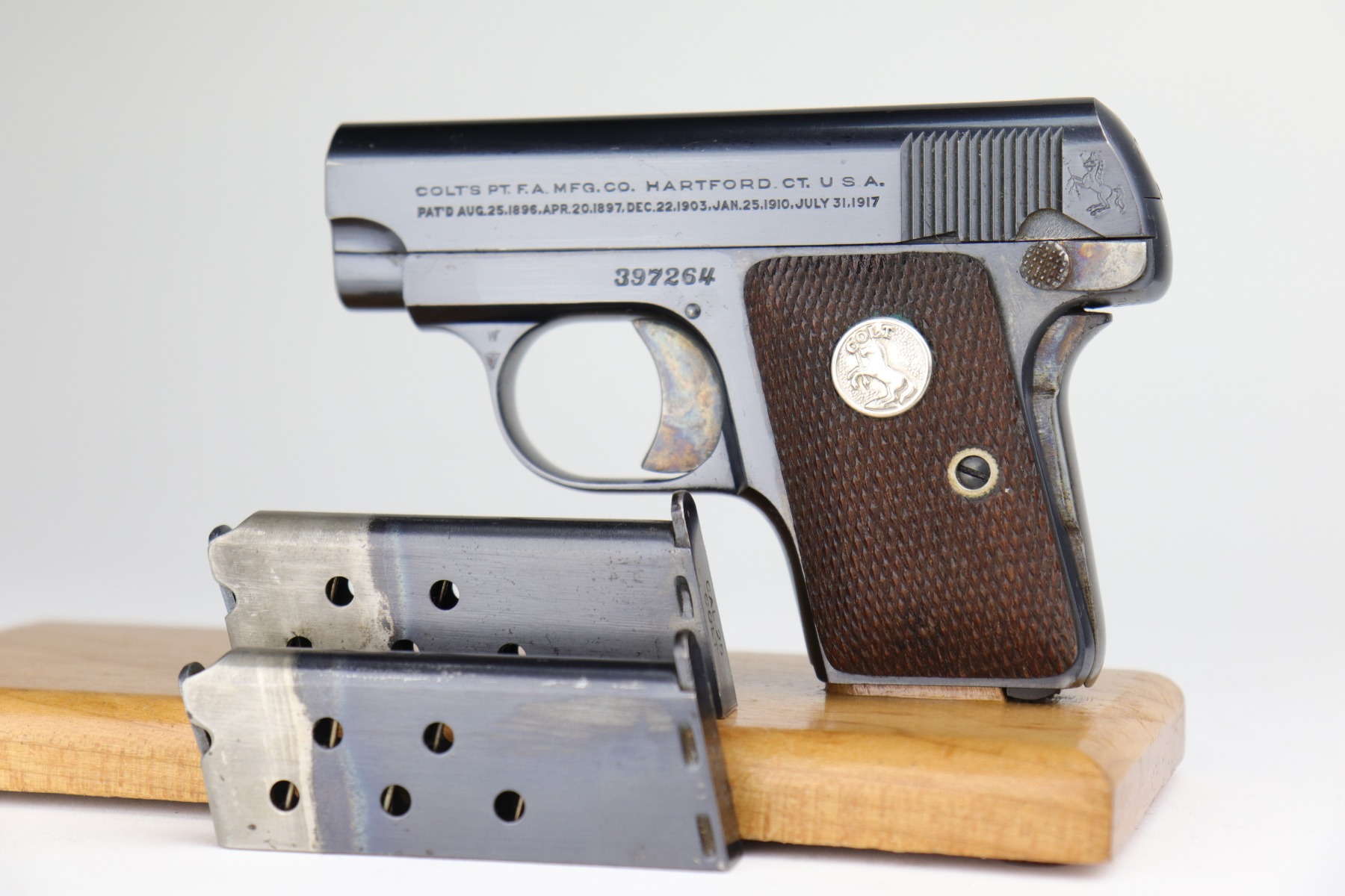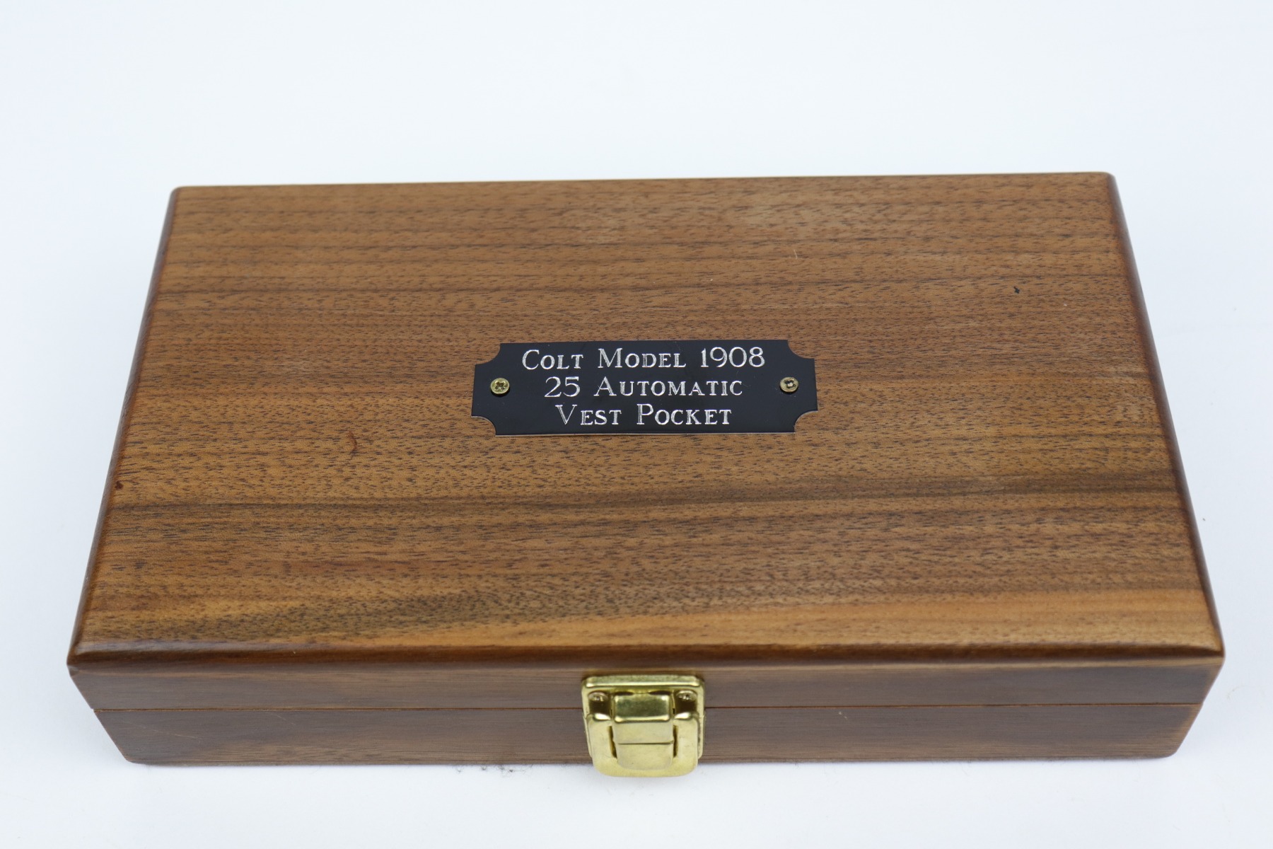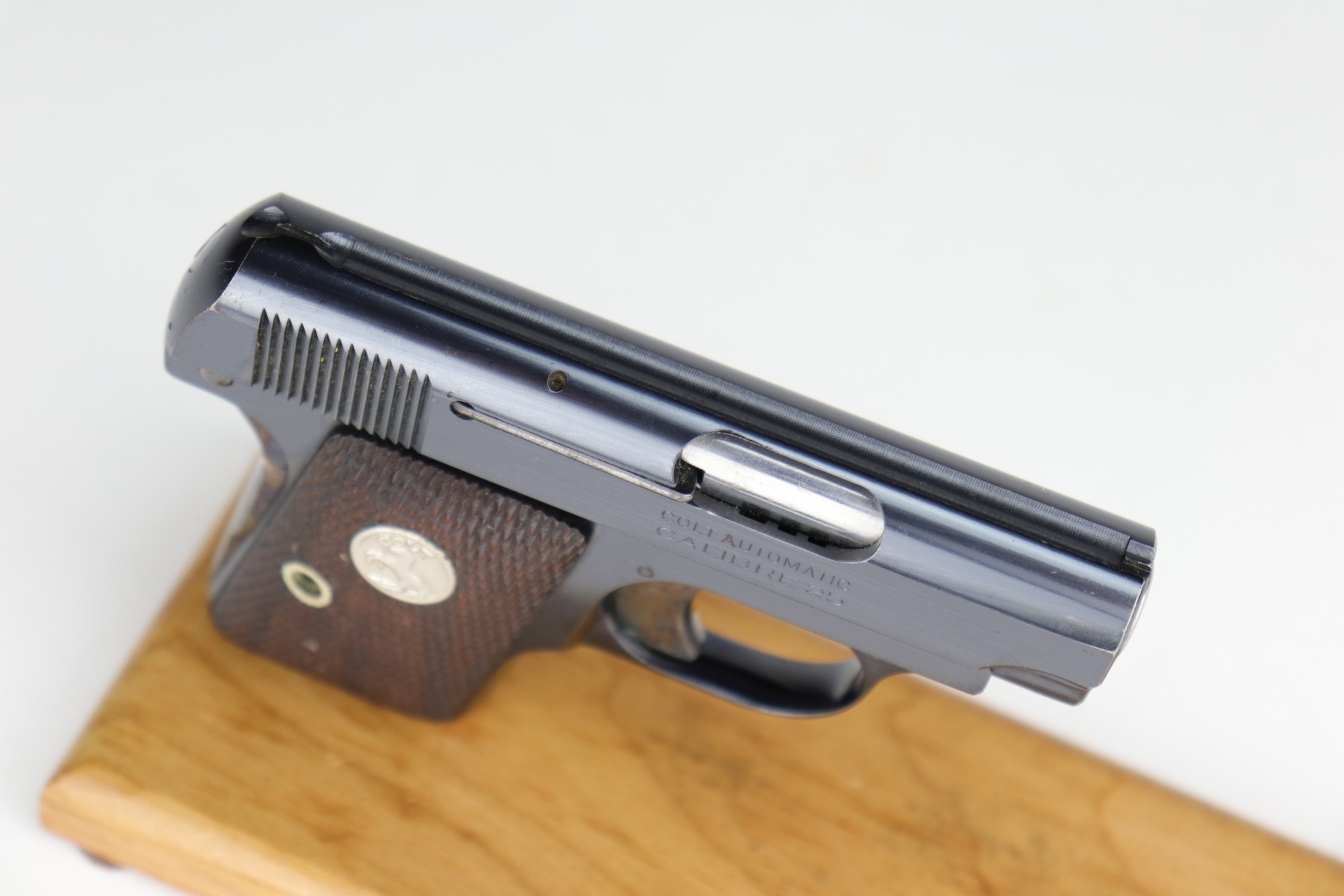 10/8/20 – This is a mint example of a Colt Model 1908 Vest Pocket Pistol, chambered in .25. From the serial number, it was manufactured in 1933. This one comes with a beautiful custom-made wood presentation box that is lined with green velvet. The small parts have retained their case-hardening. There is almost no finish loss on this gun, just some minor freckling on the straps. It is fully functional, has excellent grips, and comes with two original magazines. The bore is mint.