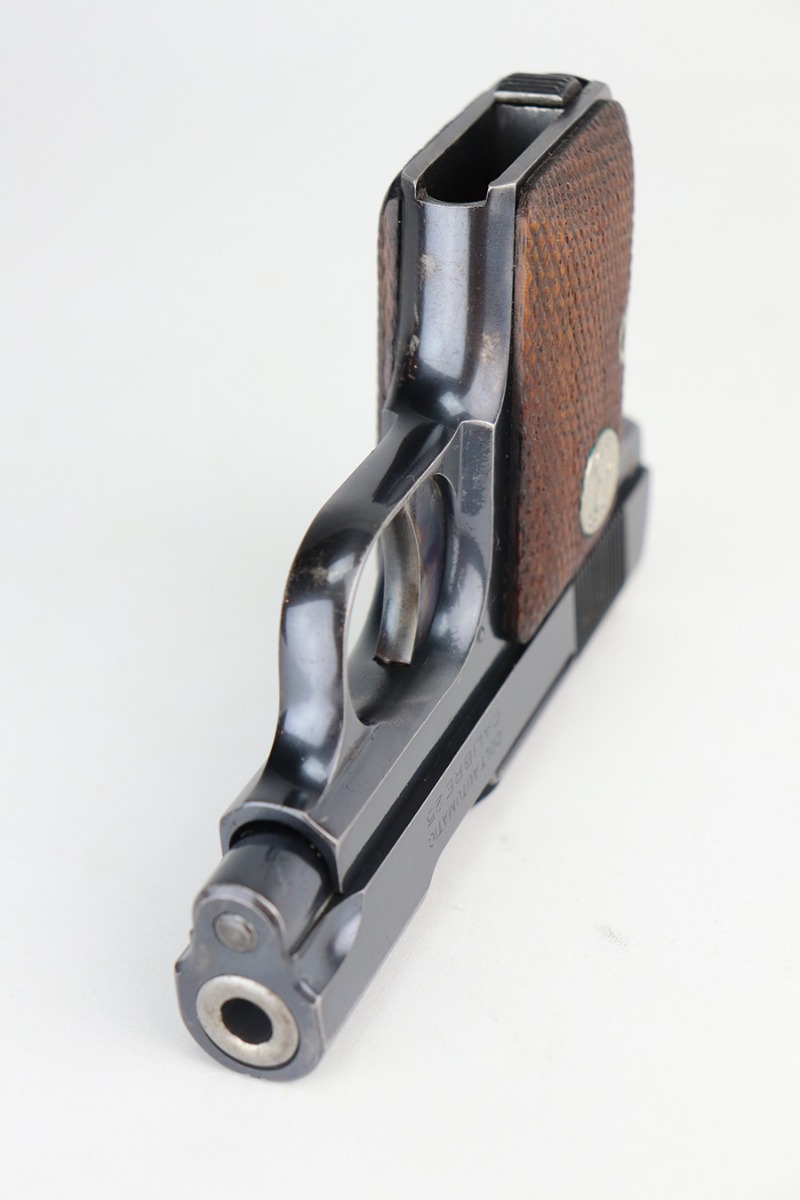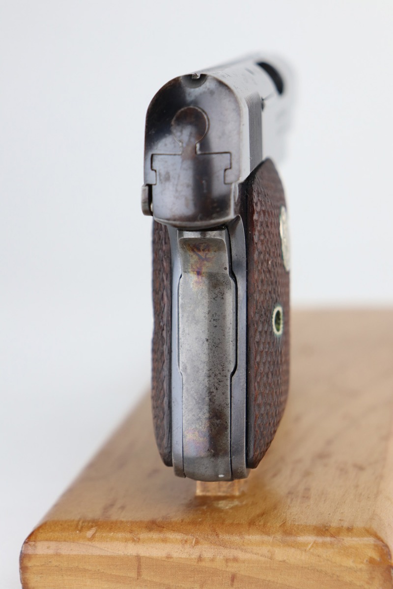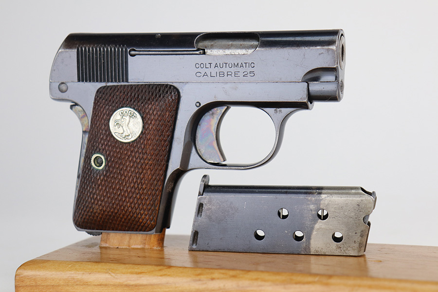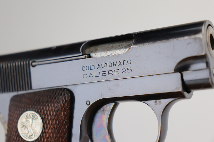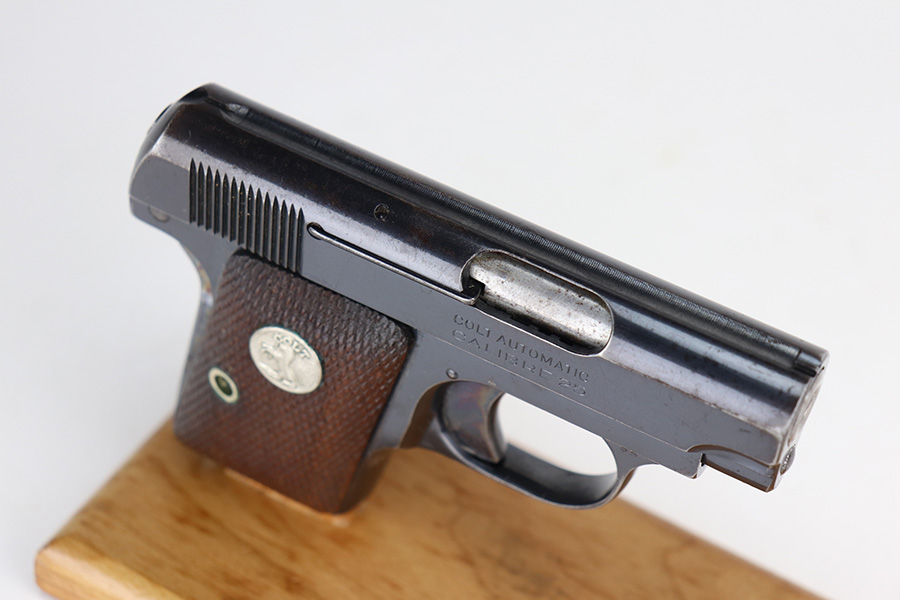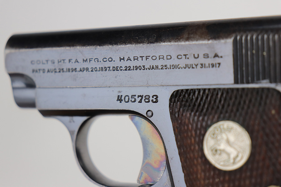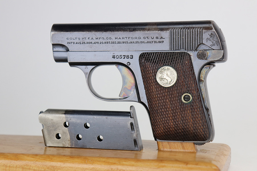 5/6/21 – This is a nice example of a Colt Model 1908 Vest Pocket manufactured in 1937. The gun is all correct and has retained roughly 85% of its original finish. The case hardening on the back strap is worn but intact on the trigger. There is thinning on the back strap and spotty wear along the high edges of the slide and on the front strap. Comes with excellent grips and a correct magazine. The bore is excellent – shiny with strong rifling.