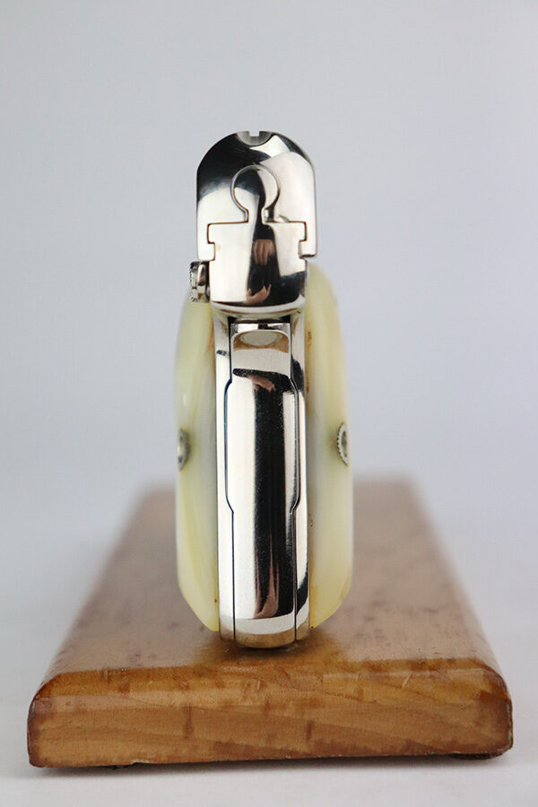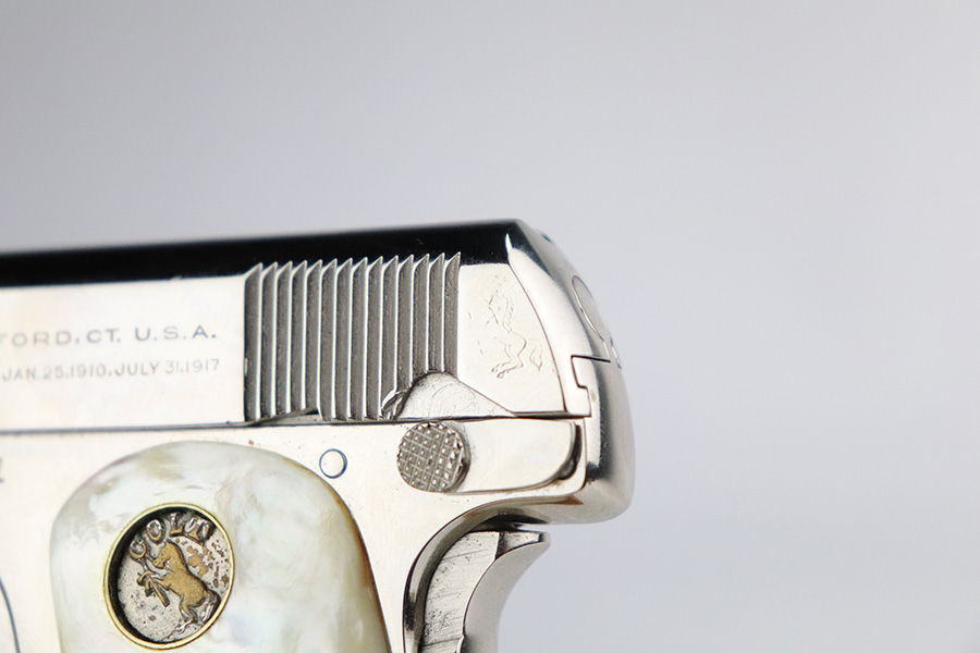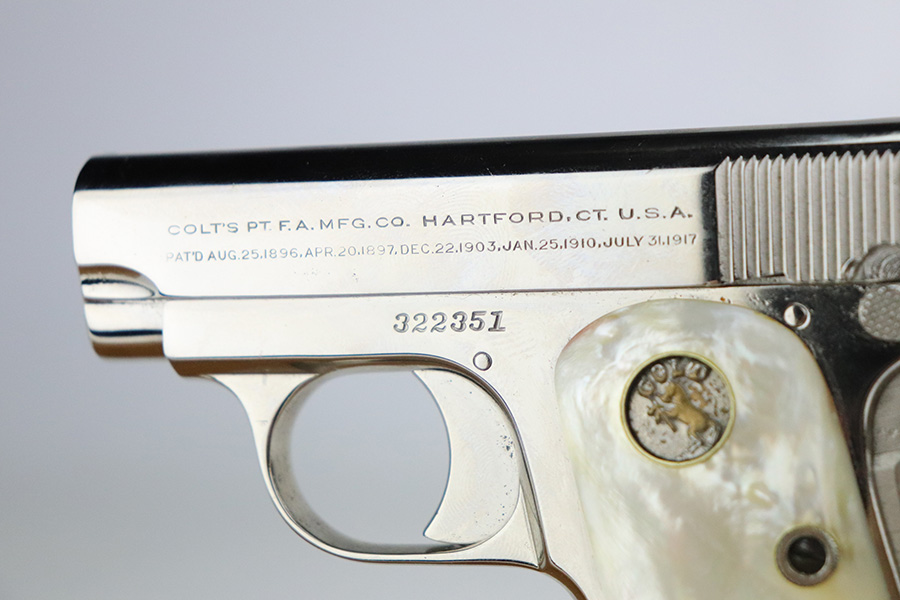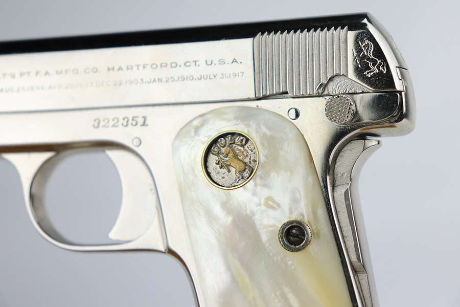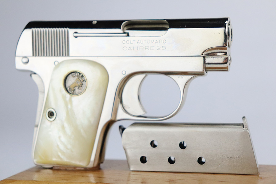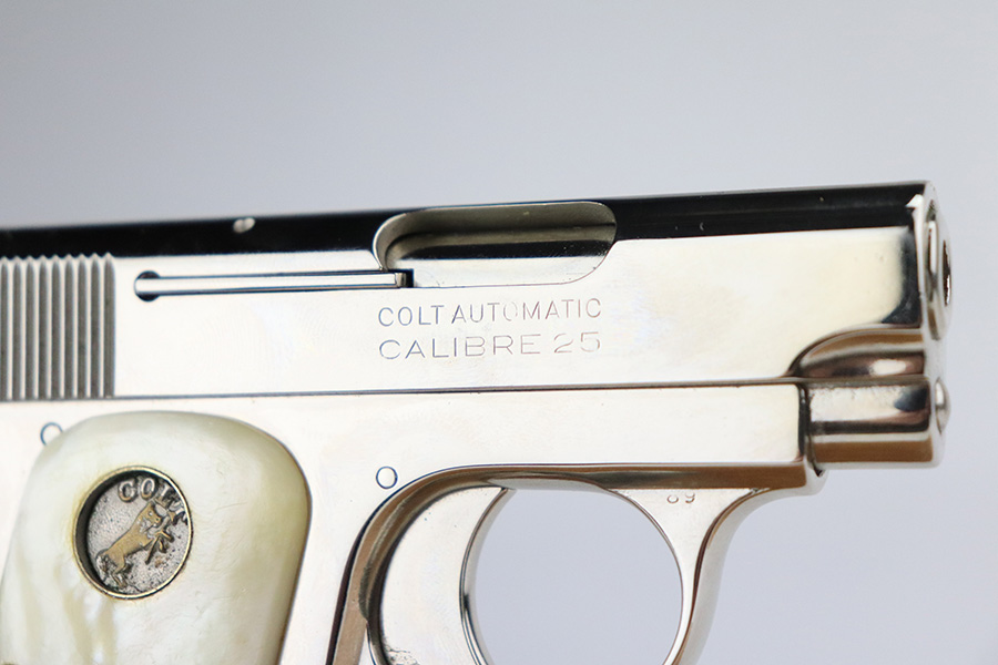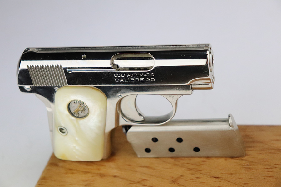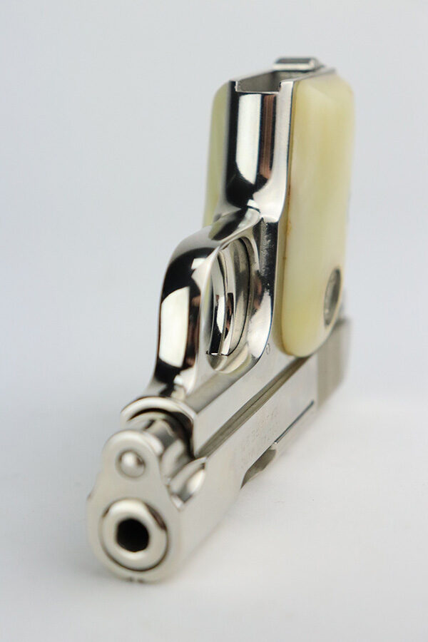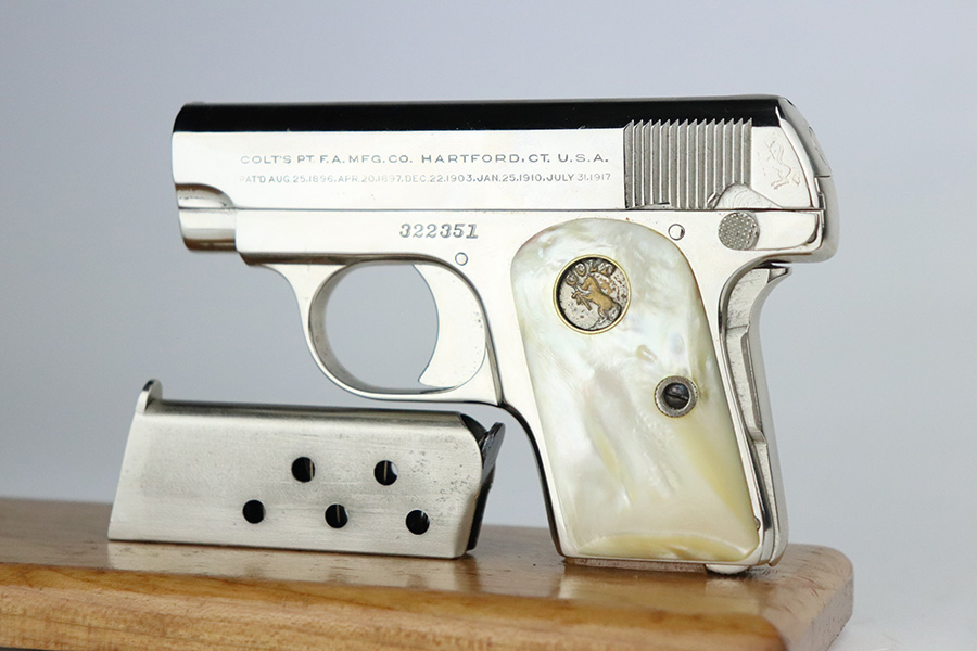 7/19/21 – This is a gorgeous example of a factory-nickeled Colt Model 1908 Vest Pocket manufactured in 1923. It comes with a nickeled magazine and beautiful pearl grips. The gun has retained virtually all of its finish with a few small areas of very tiny pin-pricking. The grips are excellent. The rifling in the bore is slight worn with areas of pin-pricking in the grooves. The box is a 70s era example, probably for a Colt Junior.