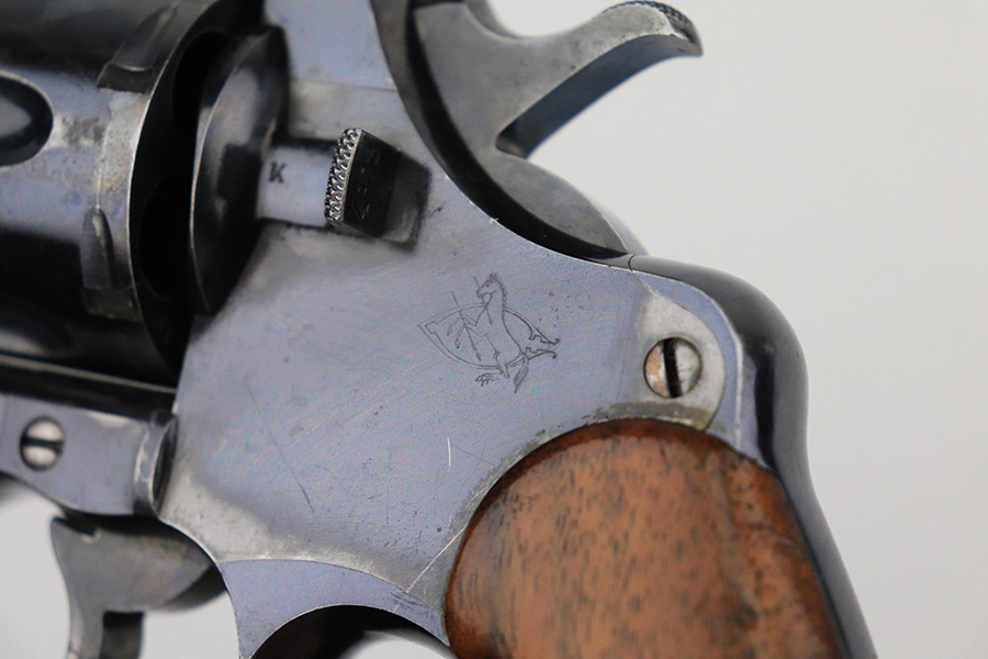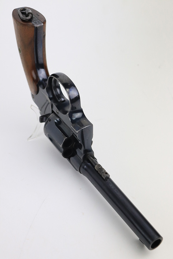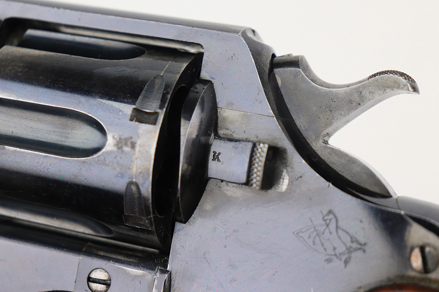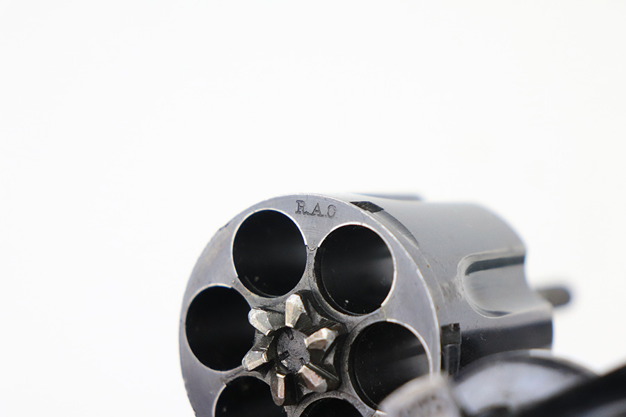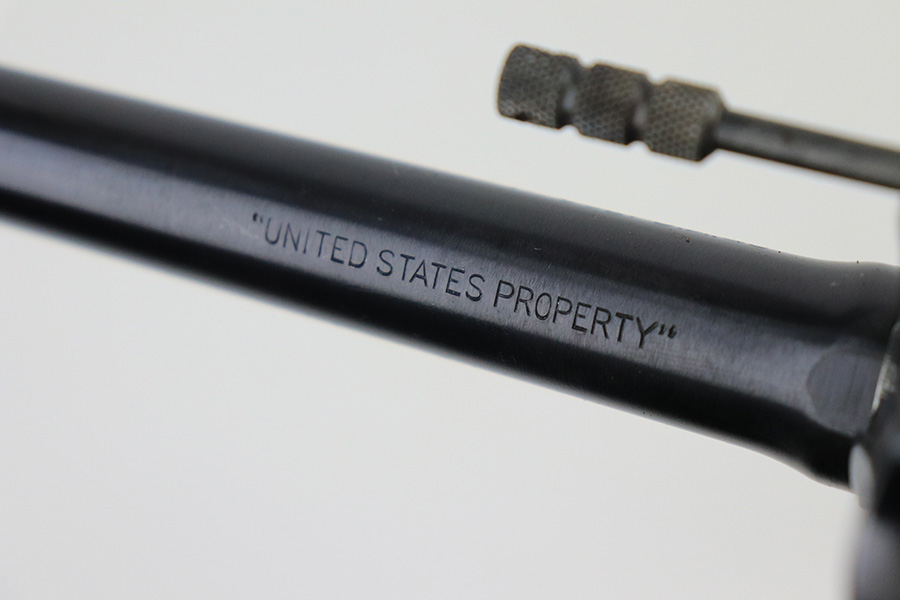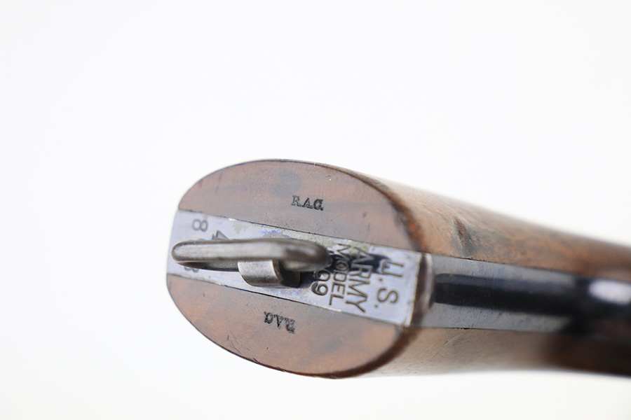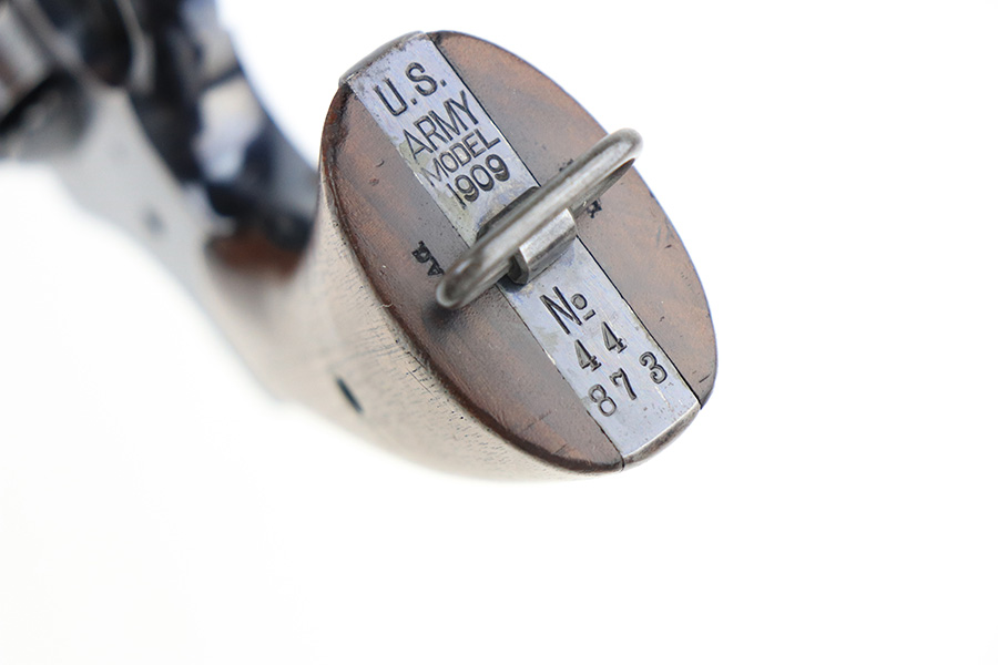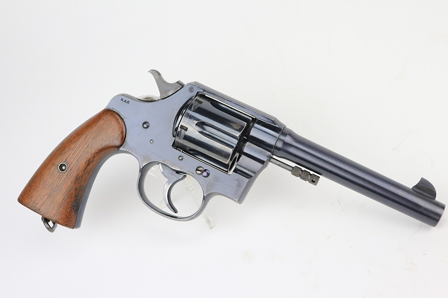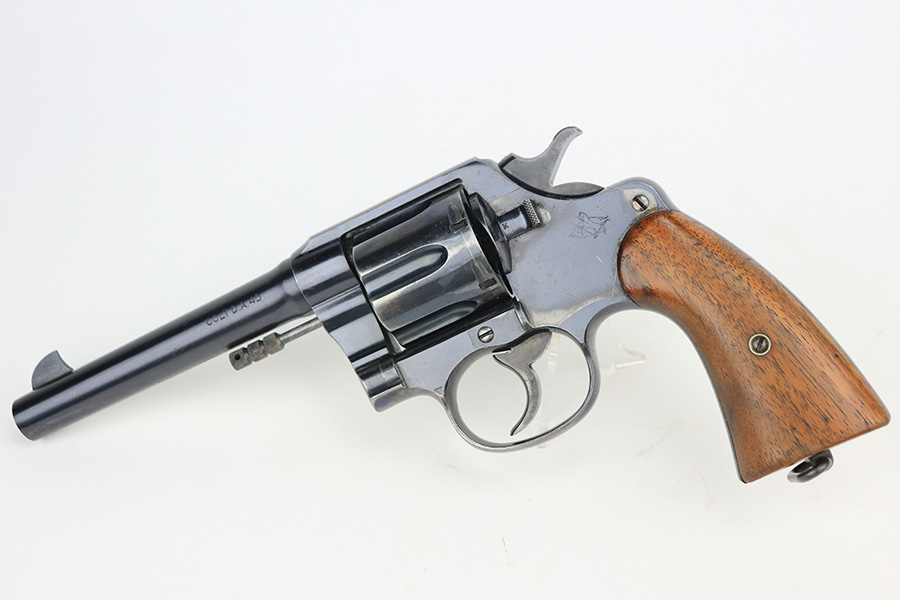2/8/22 – This is a very nice example of a Colt Model 1909 revolver issued to the US military in 1911. The gun is all matching except for the barrel. The barrel has been replaced with one from a Colt Model 1917. The underside of the barrel is “United States Property” marked. There are proper “R.A.C.” military proofs on the right side of the frame and bottom edges of the grip panels. The gun has retained somewhere between 85-90% of its high polish finish. Most of the finish loss is on both sides of the frame, where the wear is splotchy. There is also wear concentrated around the high edges of the cylinder and on the top strap. Some spotty, scratchy wear and freckling on both grip straps. A few tiny dings on the underside of the trigger guard. A few light scratches on the left side of the frame and on the front strap. The cylinder is tight, and the action is smooth. The grips are hand-numbered on the inside and matching to the gun. The bore is near-mint.