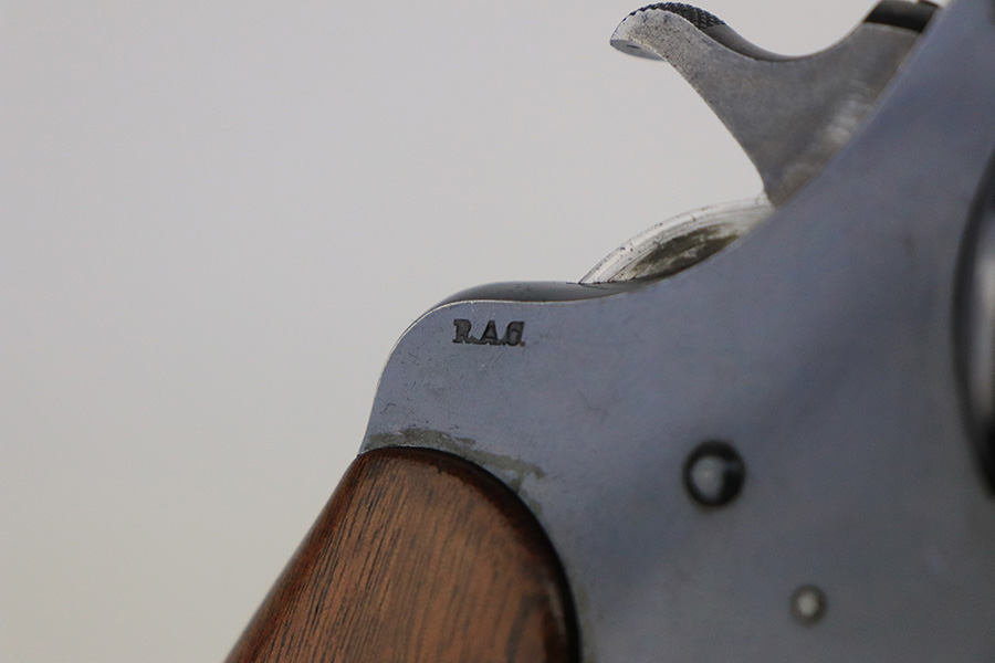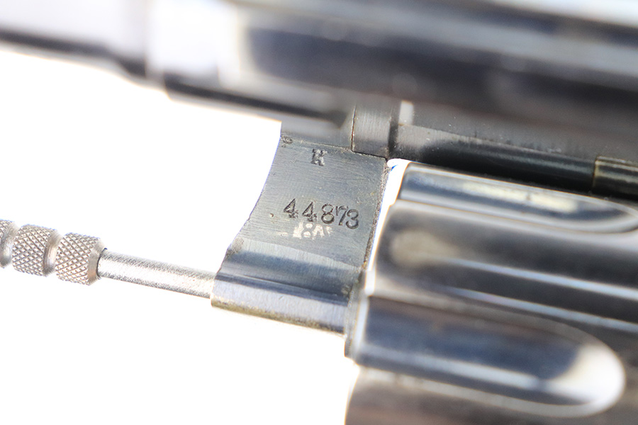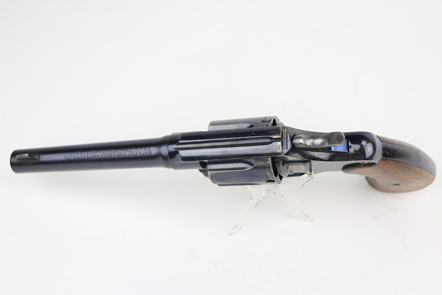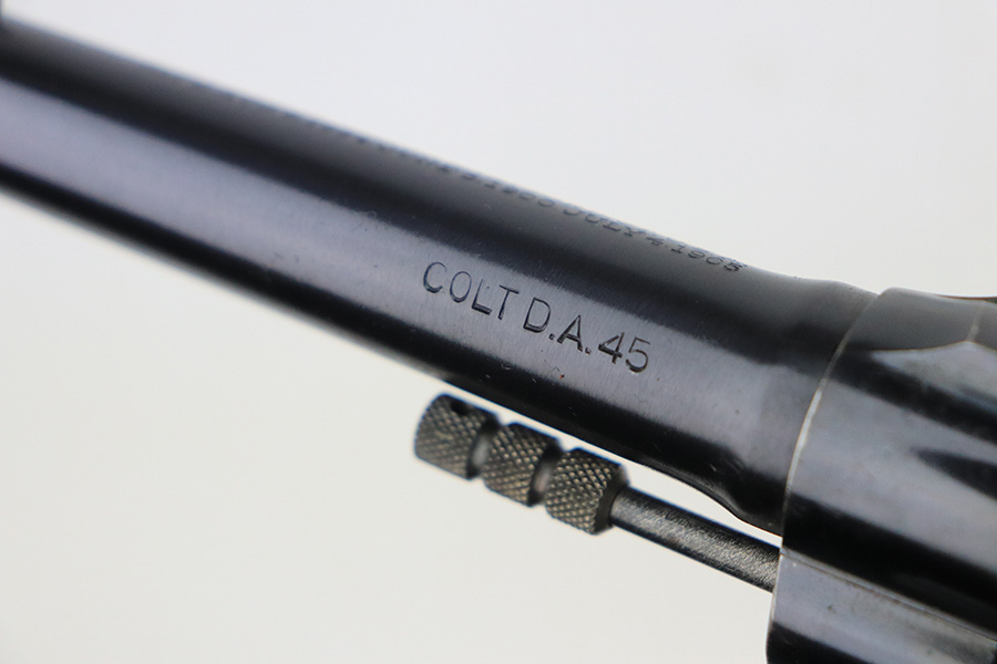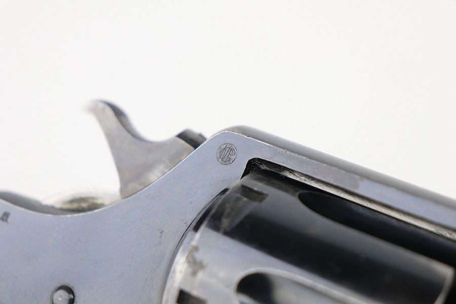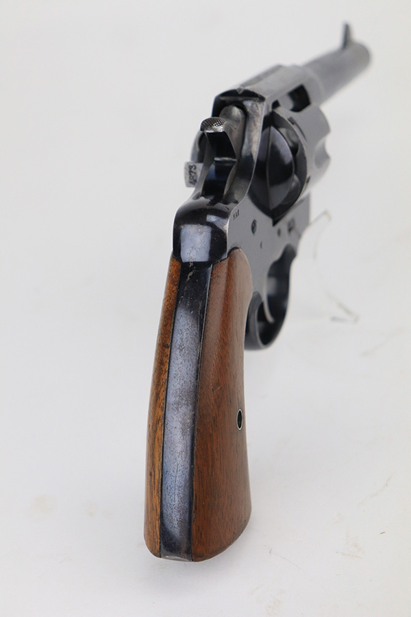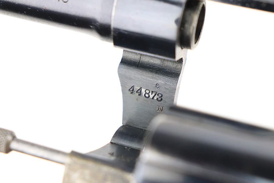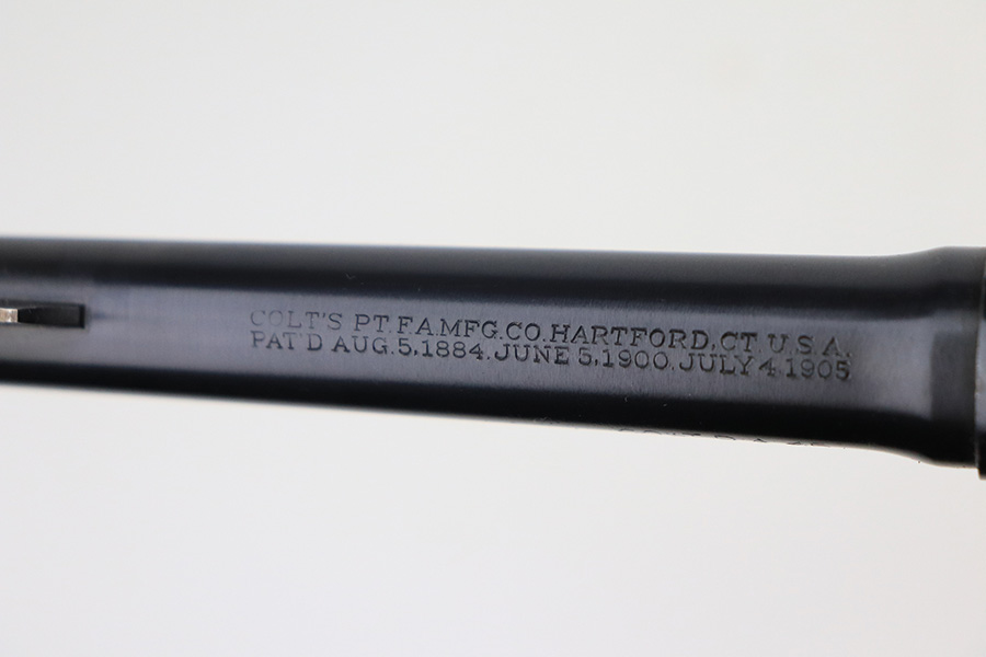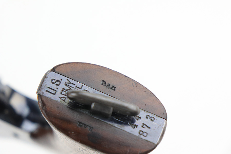 2/8/22 – This is a very nice example of a Colt Model 1909 revolver issued to the US military in 1911. The gun is all matching except for the barrel. The barrel has been replaced with one from a Colt Model 1917. The underside of the barrel is “United States Property” marked. There are proper “R.A.C.” military proofs on the right side of the frame and bottom edges of the grip panels. The gun has retained somewhere between 85-90% of its high polish finish. Most of the finish loss is on both sides of the frame, where the wear is splotchy. There is also wear concentrated around the high edges of the cylinder and on the top strap. Some spotty, scratchy wear and freckling on both grip straps. A few tiny dings on the underside of the trigger guard. A few light scratches on the left side of the frame and on the front strap. The cylinder is tight, and the action is smooth. The grips are hand-numbered on the inside and matching to the gun. The bore is near-mint.