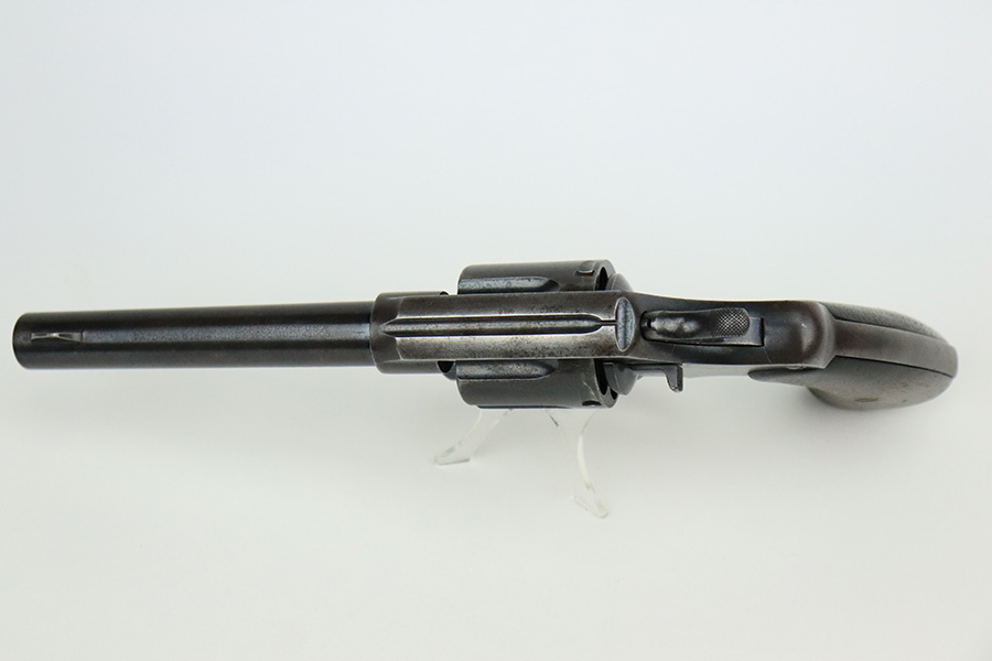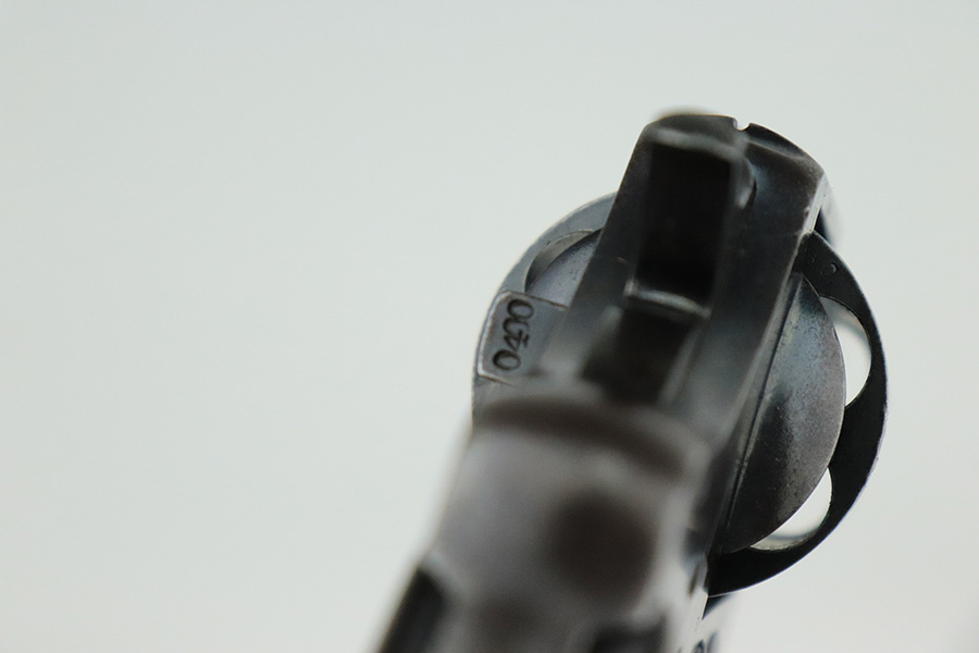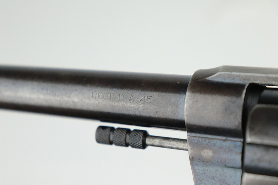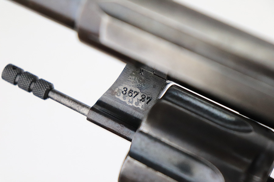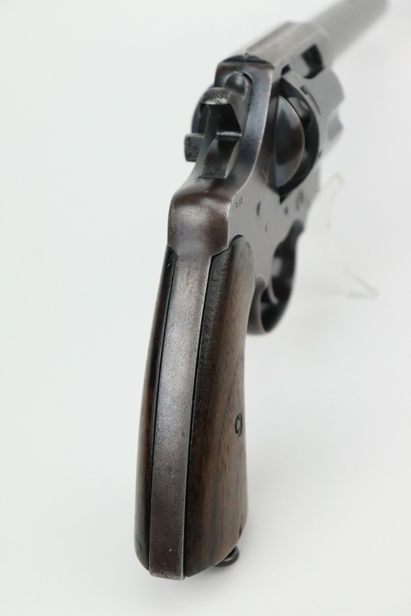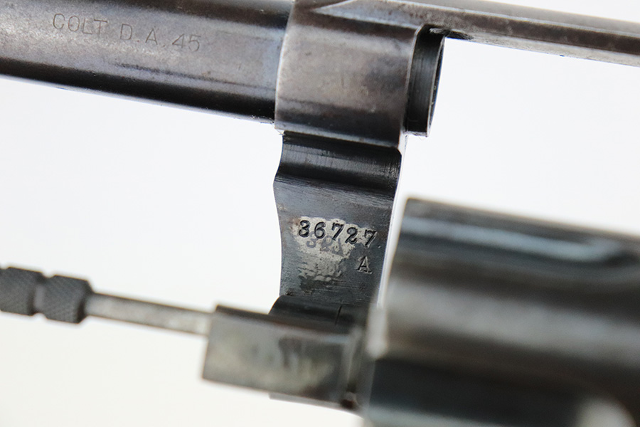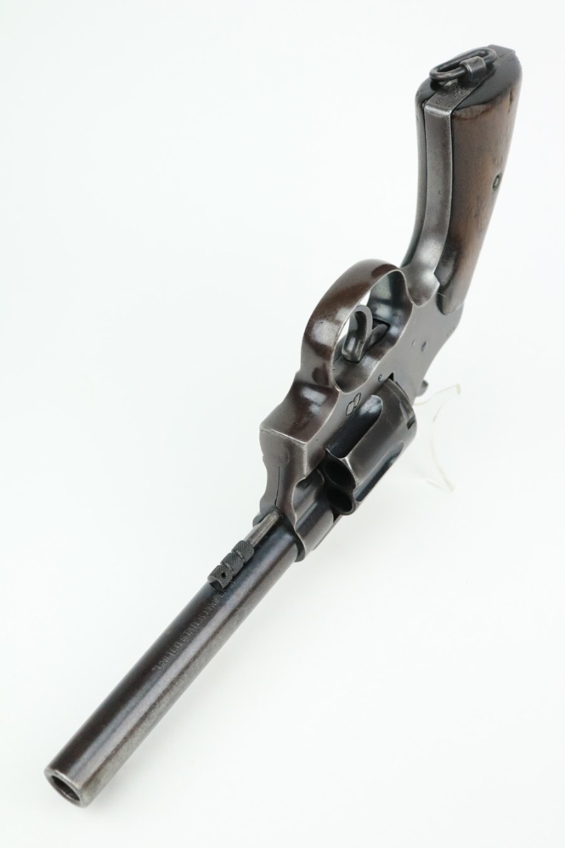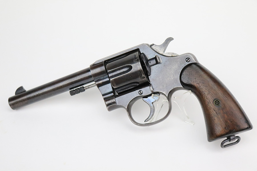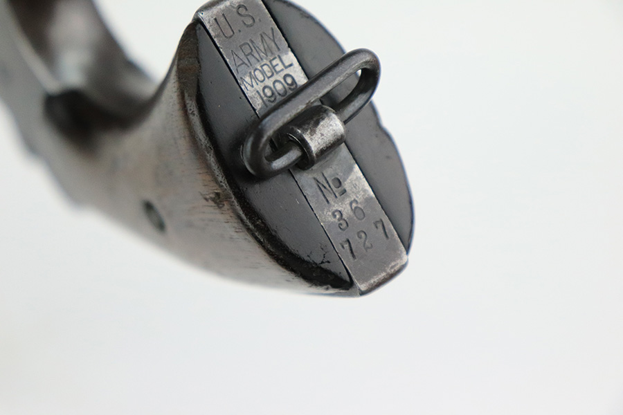8/2/22 – This is a scarce Colt Model 1909 revolver issued to the US military in 1911. It is “United States Property” marked on the barrel and has the proper “RAC” military acceptance proof on the cylinder. It is all matching except for the cylinder release. It has retained roughly 75% of its original bluing. Generally, there is thinning in the finish, spotty brown patina, and pin-pricking covering the whole gun. An obvious “X” scratched into the right side of the frame. Comes with nice wood grips – a few small bruises on both sides. Original lanyard ring is intact. The cylinder is tight and the action is smooth. The bore has great rifling with some minor freckling throughout.