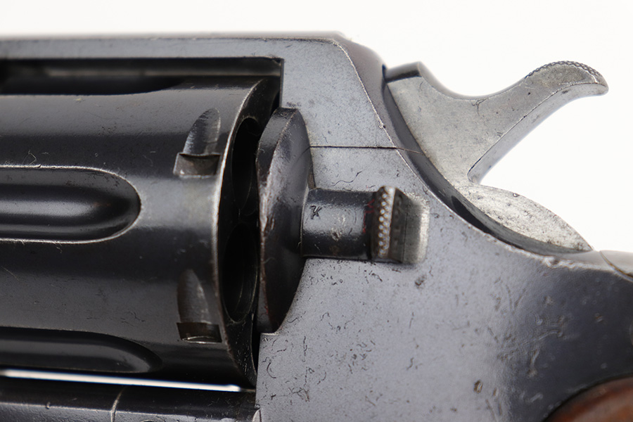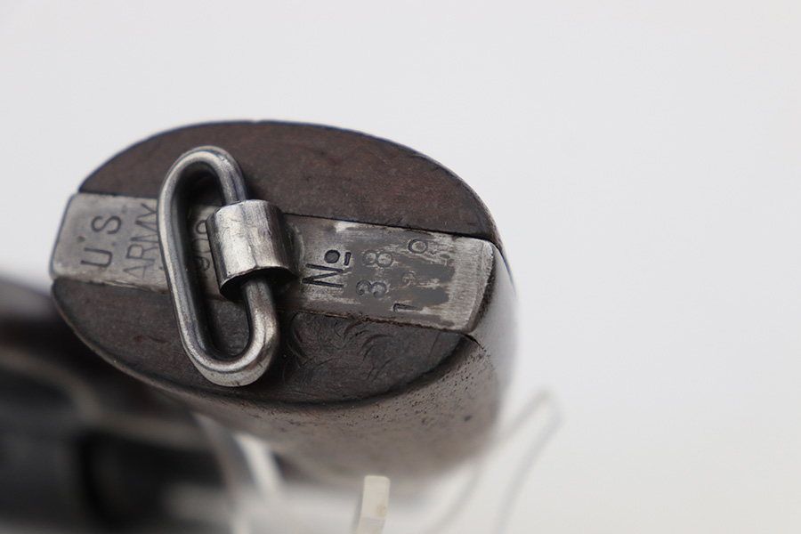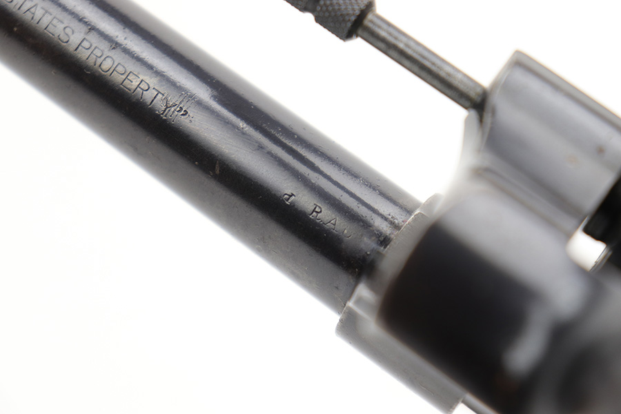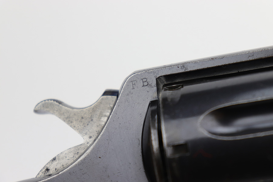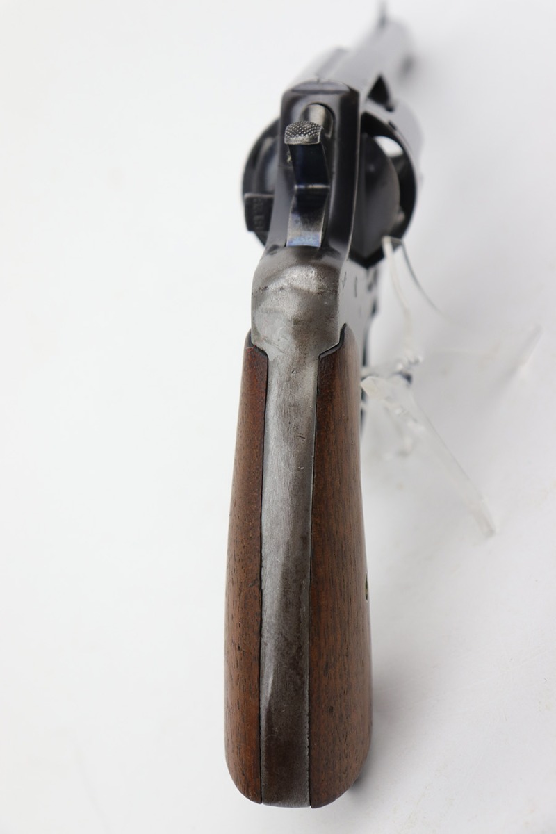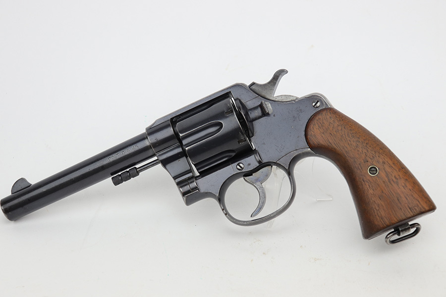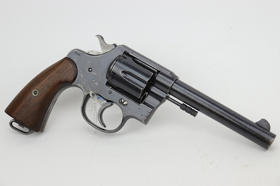 6/7/23 – This is a nice example of a Colt Model 1909 Revolver issued to the US military in 1911. It is matching, “United States Property” marked, and has the proper “RAC” and “FB” inspection initials. We believe the gun has an old re-blued finish. The majority of the wear is on the grip straps, but there is also spotty wear on the right side of the frame, minor high edge wear in general, and thinning along the barrel. Spotty oxidation along the barrel as well. There are some grinding marks on the front strap and dark discoloration on the butt of the frame. Some minor pitting on the frame under the grips. There are a couple of notches at the right front of the frame and on the left side of the trigger guard. Fitted with very nice wood grips. The bore has decent rifling, but there is freckling and pin-pricking throughout.