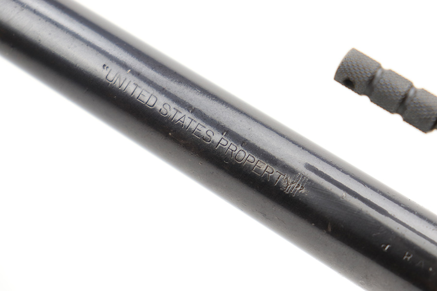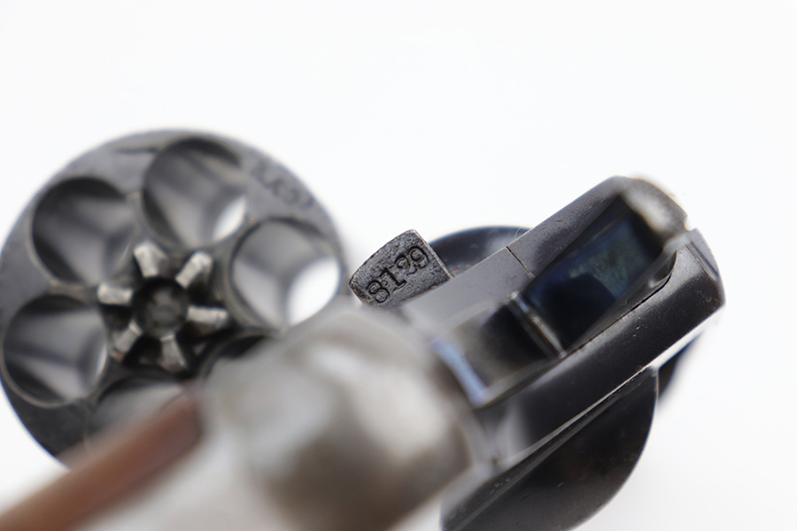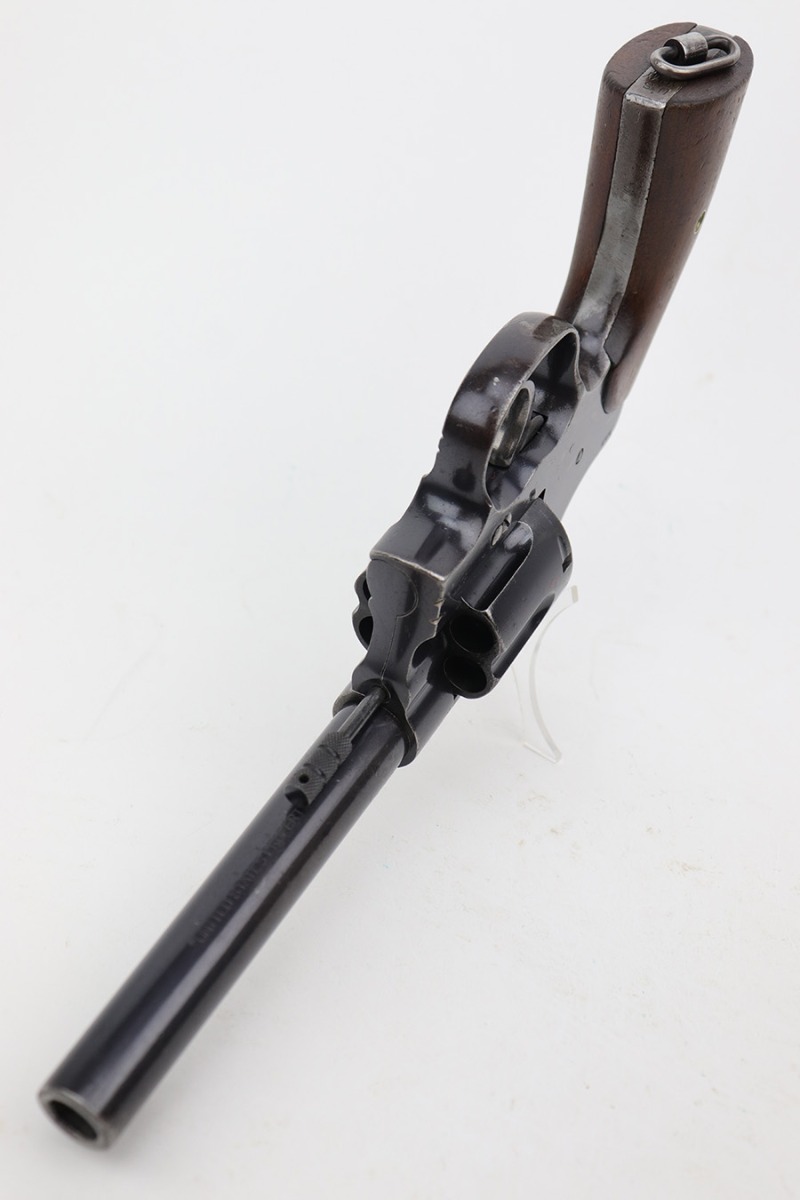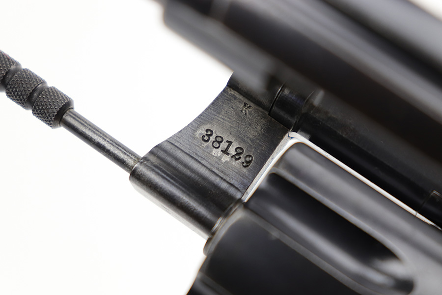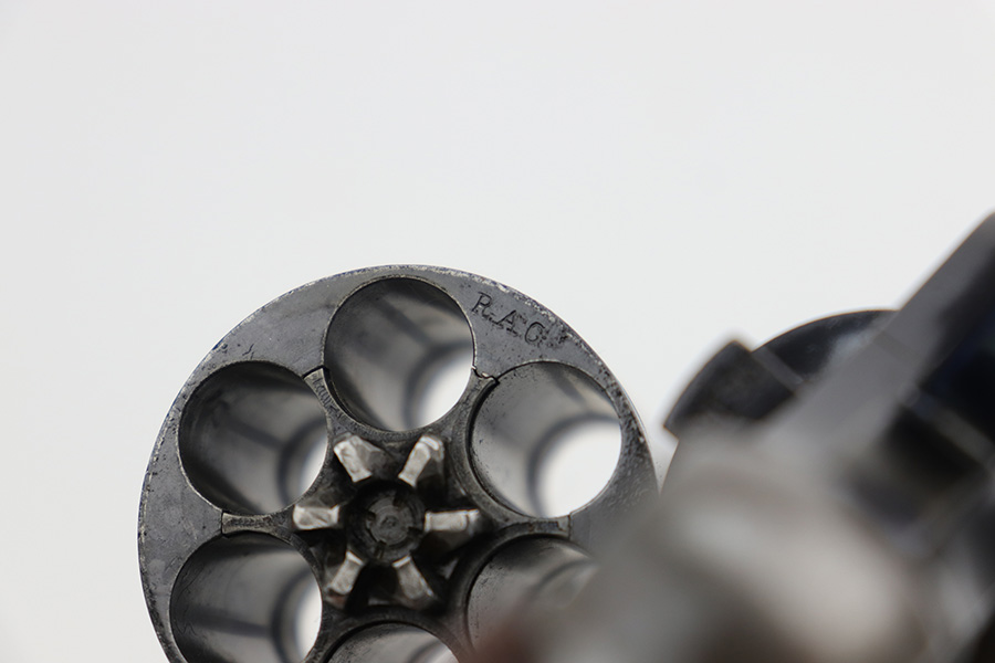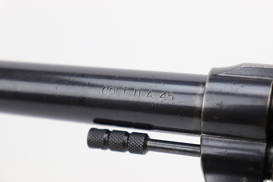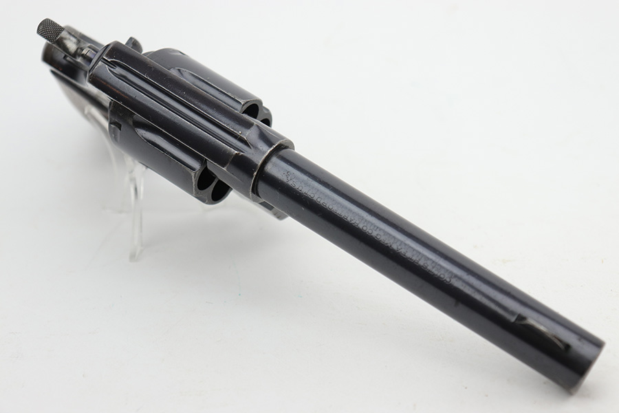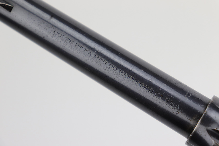 6/7/23 – This is a nice example of a Colt Model 1909 Revolver issued to the US military in 1911. It is matching, “United States Property” marked, and has the proper “RAC” and “FB” inspection initials. We believe the gun has an old re-blued finish. The majority of the wear is on the grip straps, but there is also spotty wear on the right side of the frame, minor high edge wear in general, and thinning along the barrel. Spotty oxidation along the barrel as well. There are some grinding marks on the front strap and dark discoloration on the butt of the frame. Some minor pitting on the frame under the grips. There are a couple of notches at the right front of the frame and on the left side of the trigger guard. Fitted with very nice wood grips. The bore has decent rifling, but there is freckling and pin-pricking throughout.