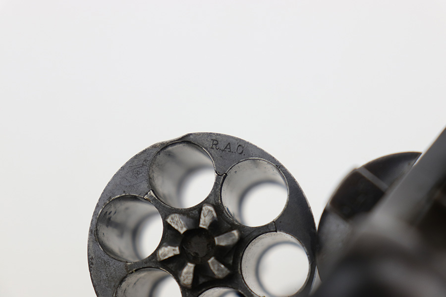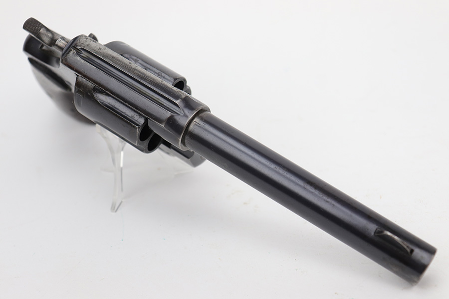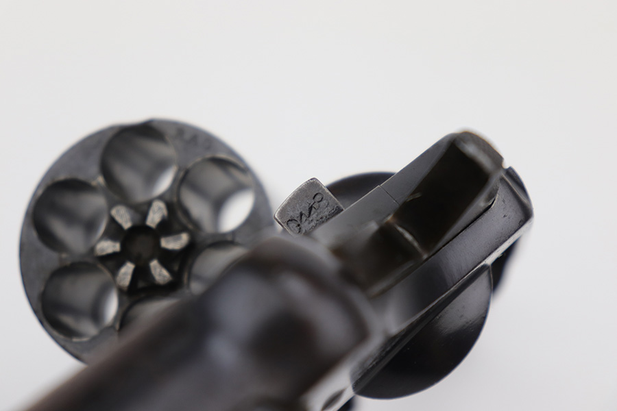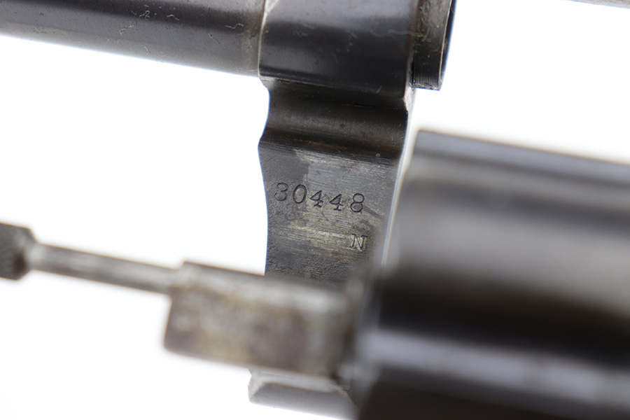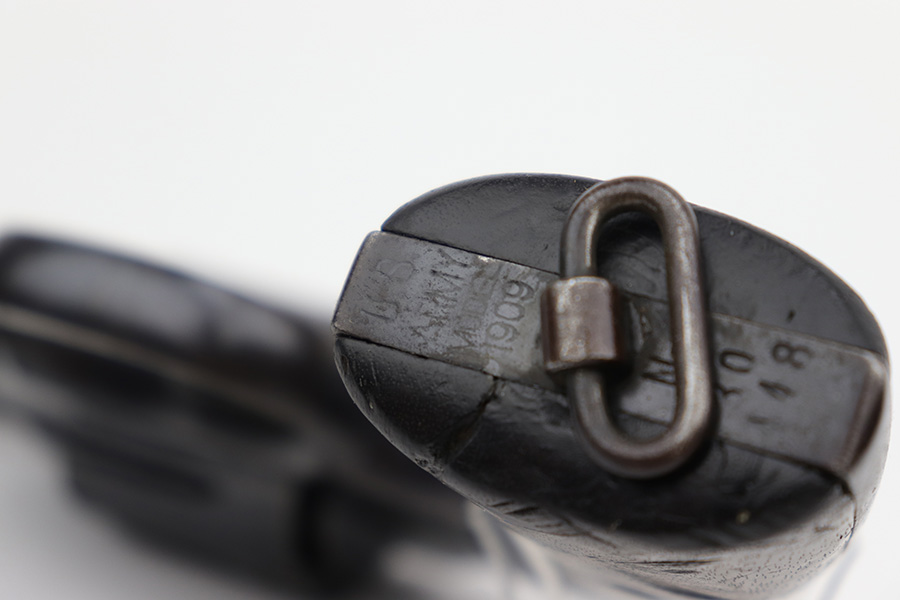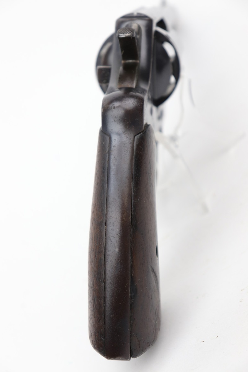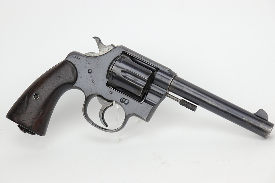6/13/23 – This is a nice example of a Colt Model 1909 Revolver issued to the US military in 1911. It is matching, “United States Property” marked, and has the proper “RAC” and “FB” inspection initials. We believe the gun has an old re-blued finish. The majority of the wear is around the muzzle and on the top strap. Areas of spotty oxidation and pin-pricking here and there, most noticeable on the right side of the frame and on the grip straps. Fitted with period-correct wood grips – noticeable scratching and a couple of gouges on the right side. The bore is mostly shiny with strong rifling, but there are some small dots of surface oxidation here and there.