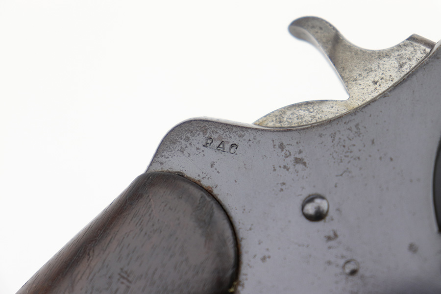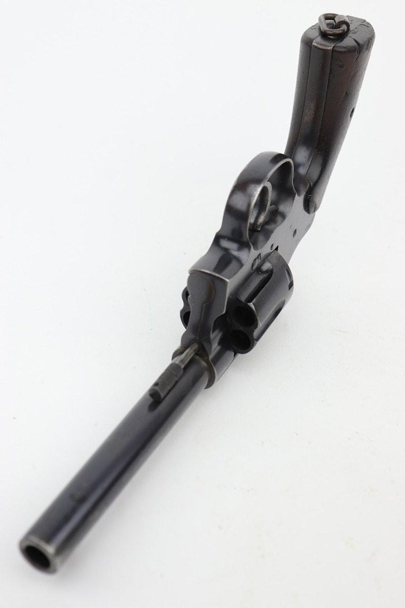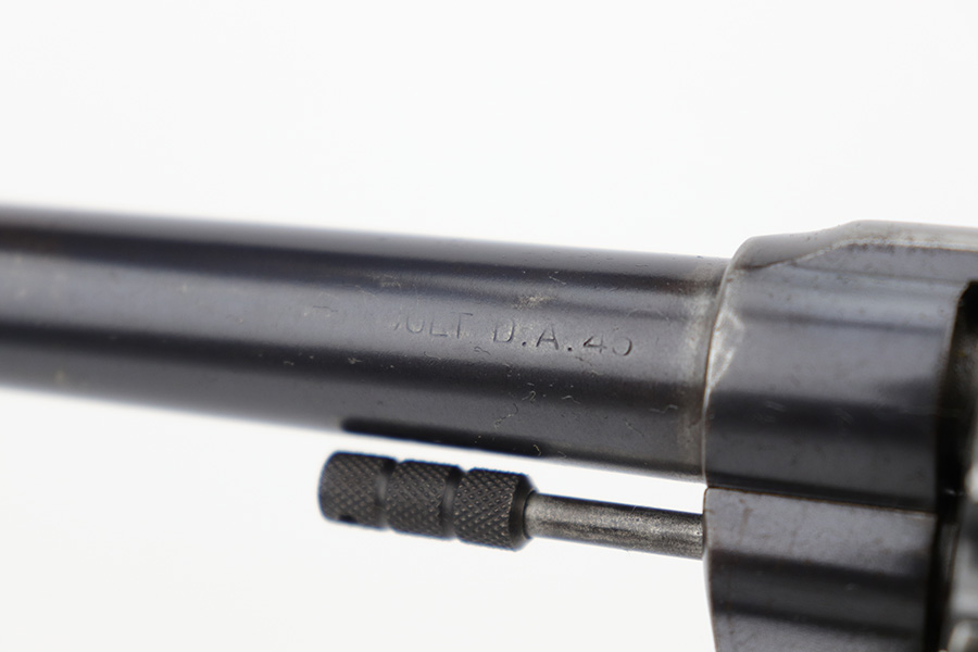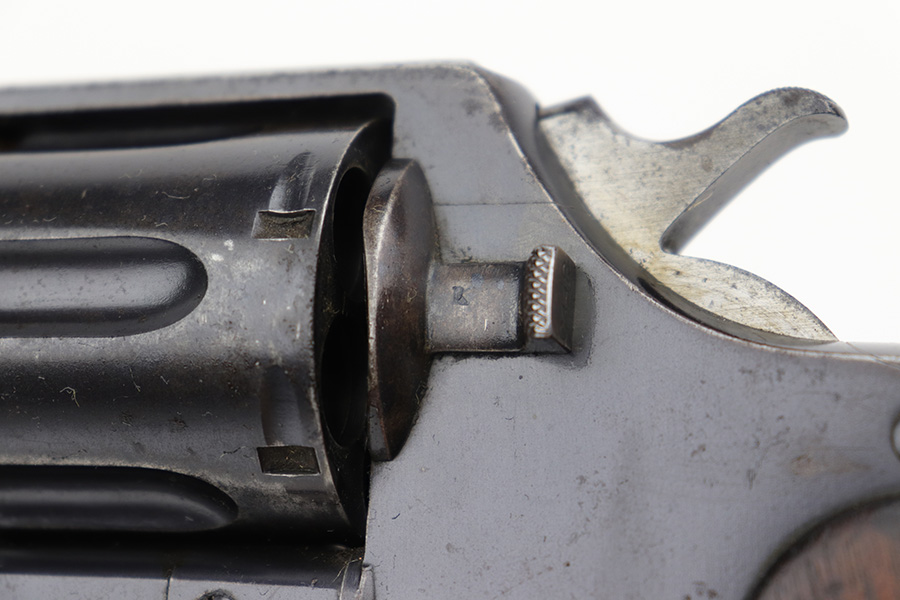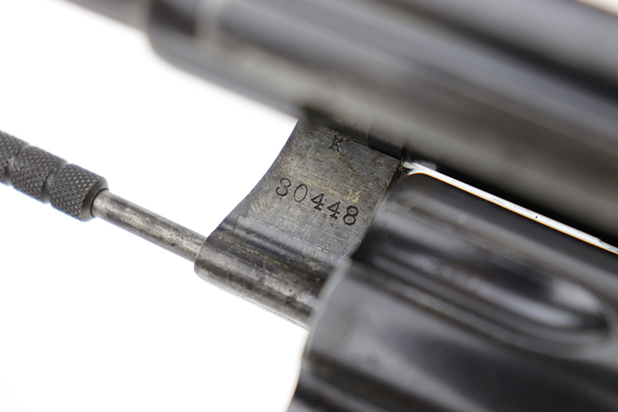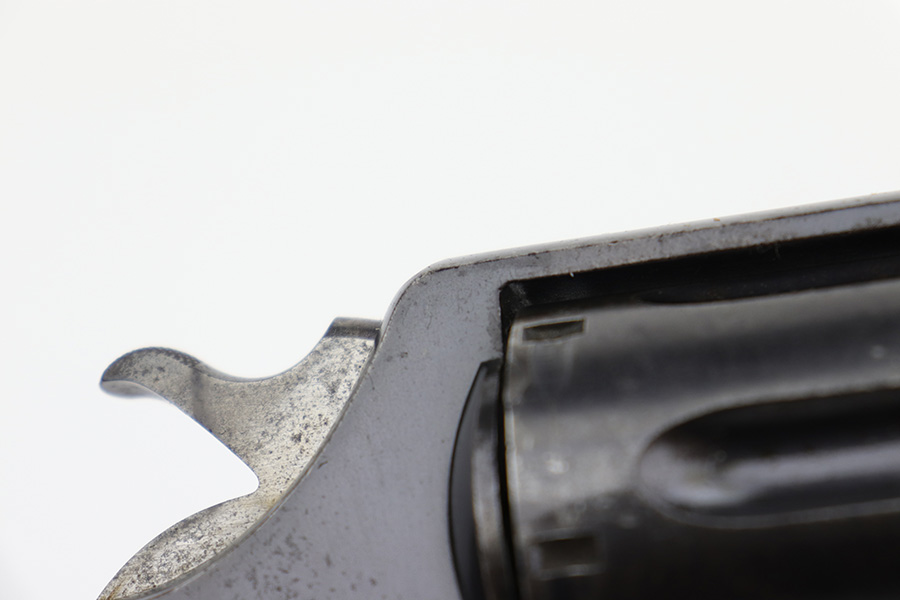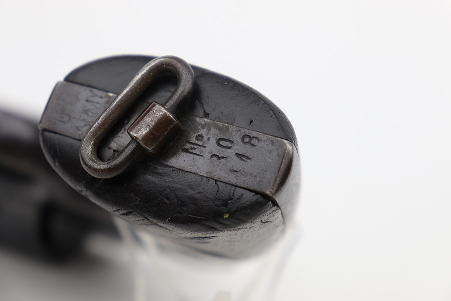 6/13/23 – This is a nice example of a Colt Model 1909 Revolver issued to the US military in 1911. It is matching, “United States Property” marked, and has the proper “RAC” and “FB” inspection initials. We believe the gun has an old re-blued finish. The majority of the wear is around the muzzle and on the top strap. Areas of spotty oxidation and pin-pricking here and there, most noticeable on the right side of the frame and on the grip straps. Fitted with period-correct wood grips – noticeable scratching and a couple of gouges on the right side. The bore is mostly shiny with strong rifling, but there are some small dots of surface oxidation here and there.