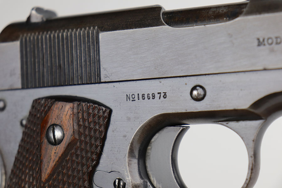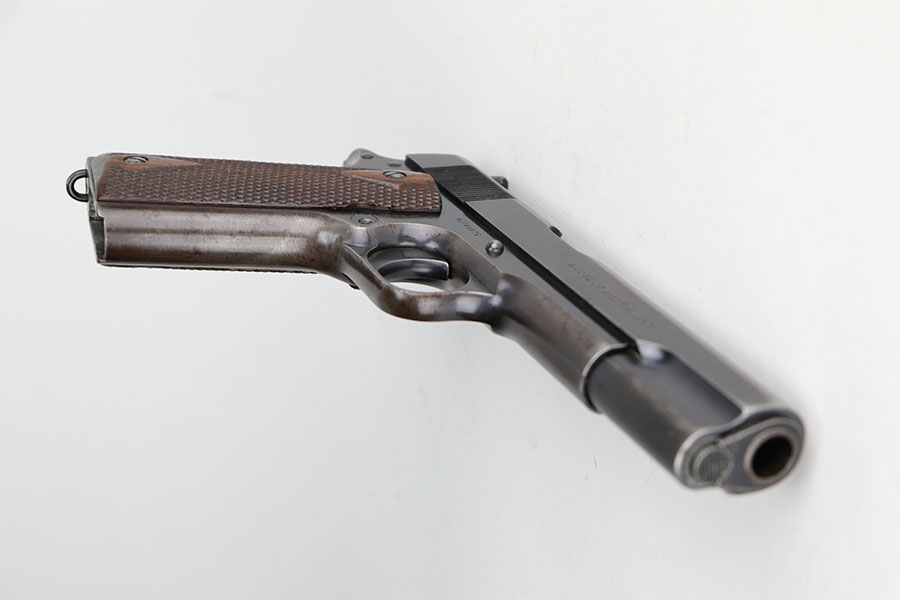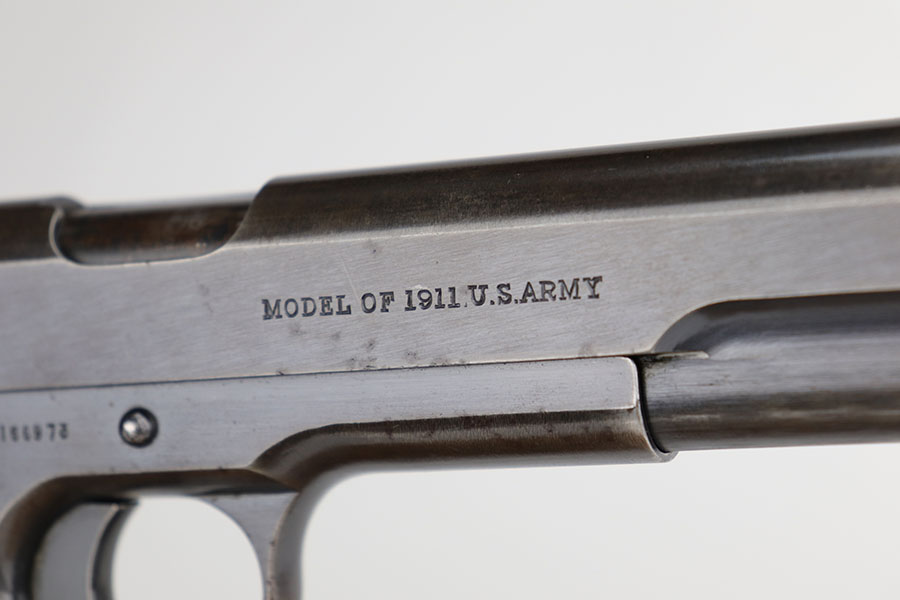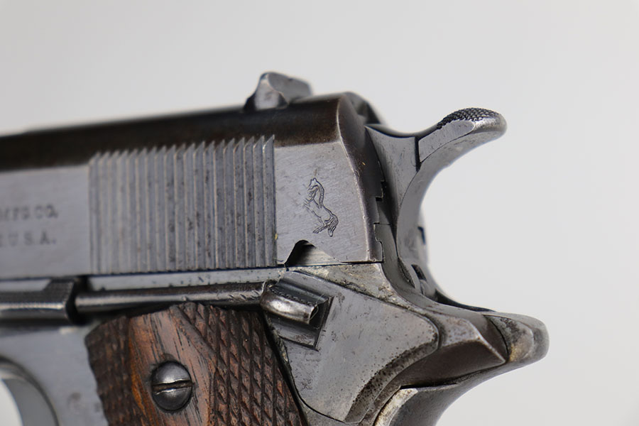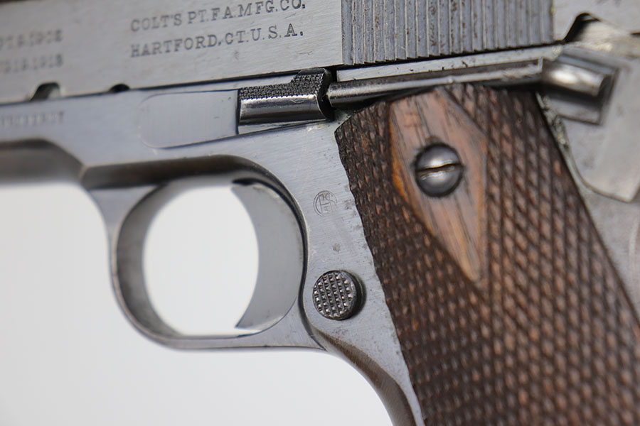 11/18/20 – This is an original Army Colt Model 1911 from 1917. The pistol has a very nice profile view with the vast majority of bluing loss on the straps, but obviously some patina throughout. There’s also some pitting on the grip safety and frame safety. Original Colt barrel with mint bore and disconnected ‘P H’ proofs. Proper two-tone magazine.