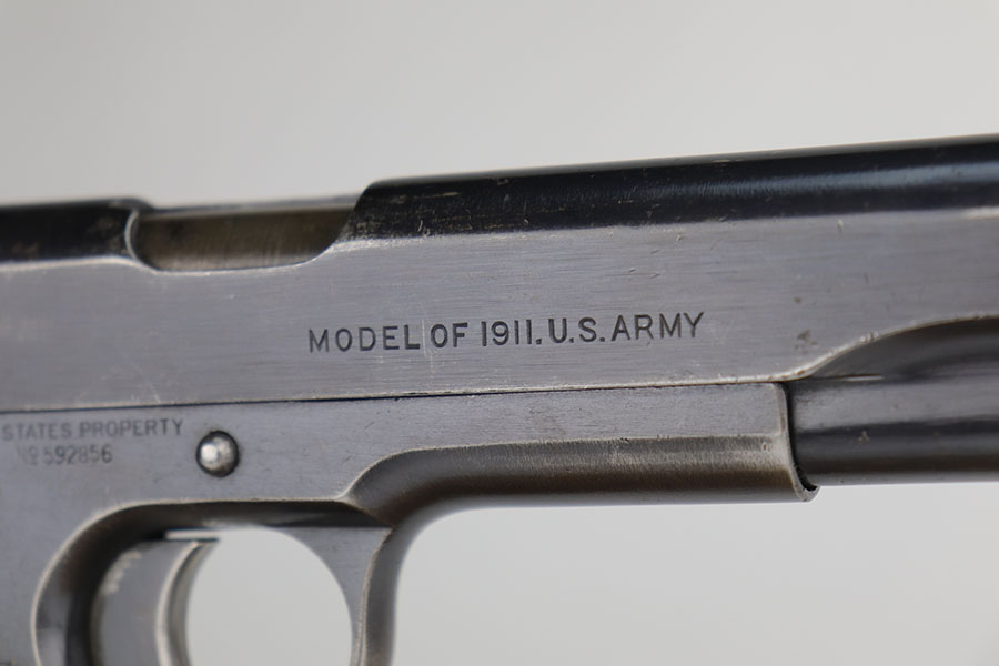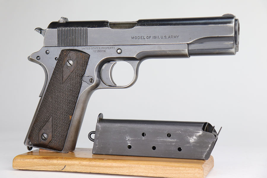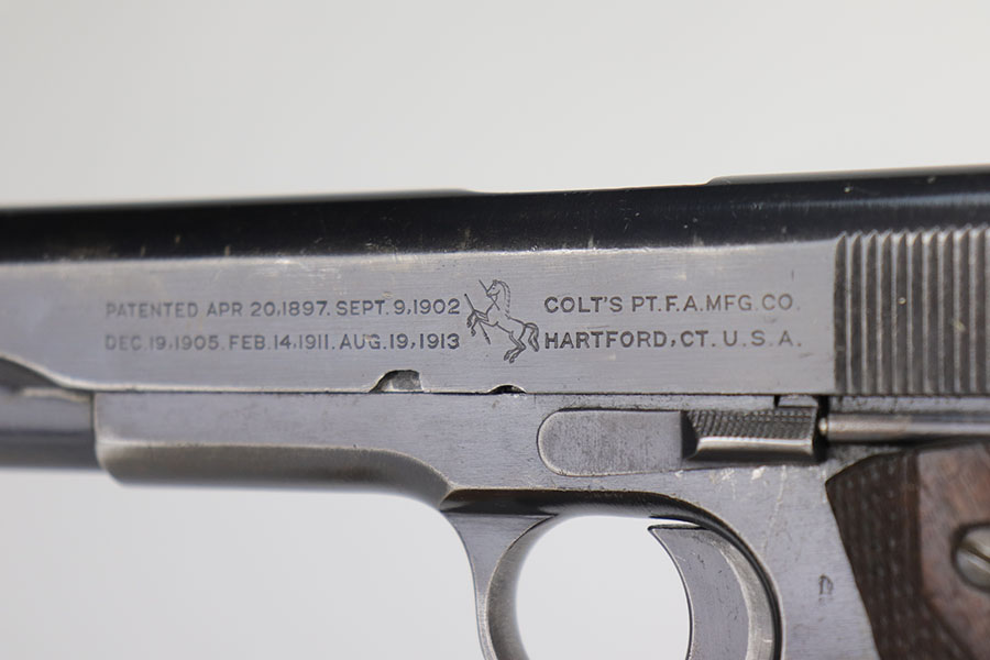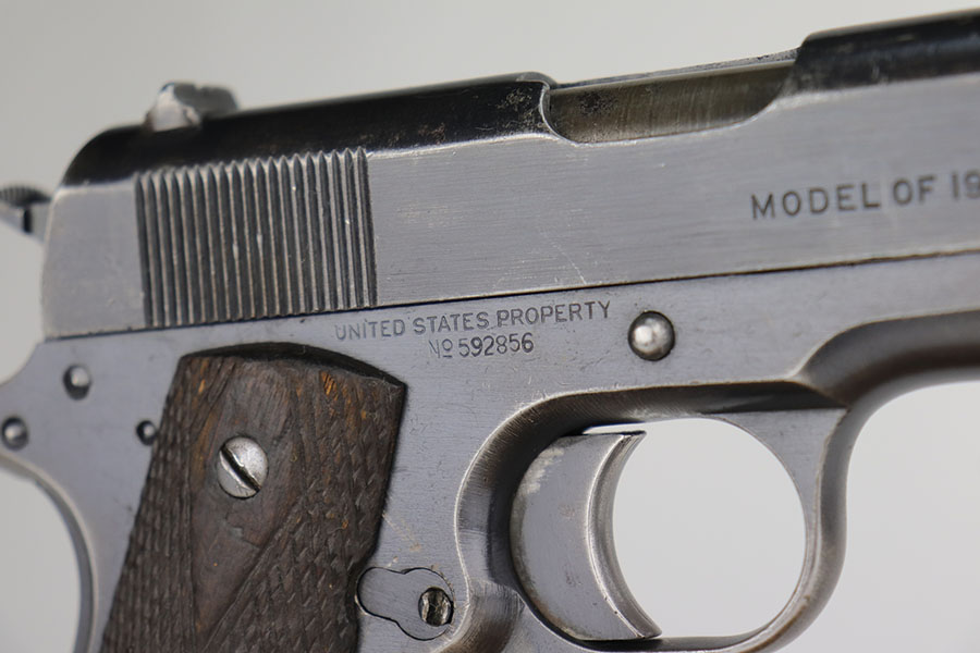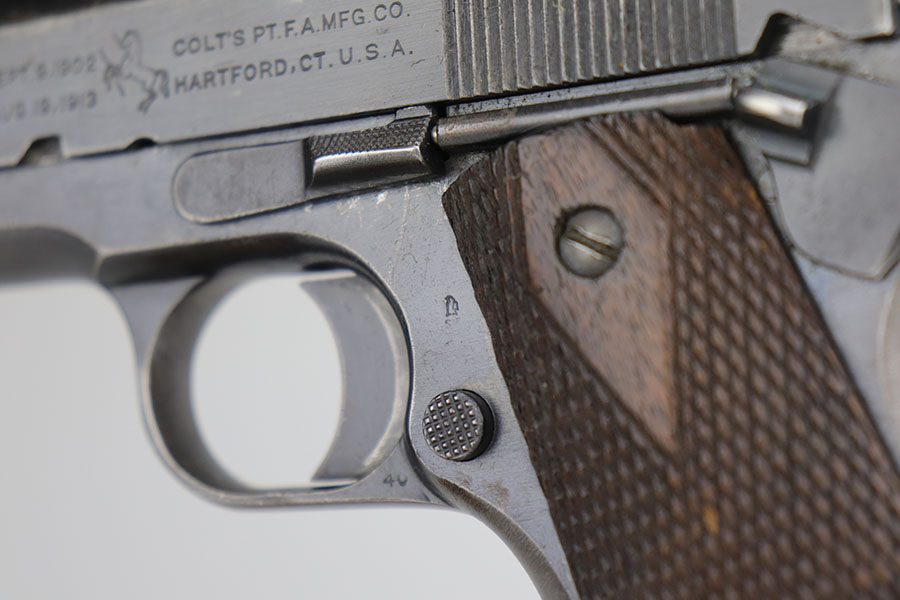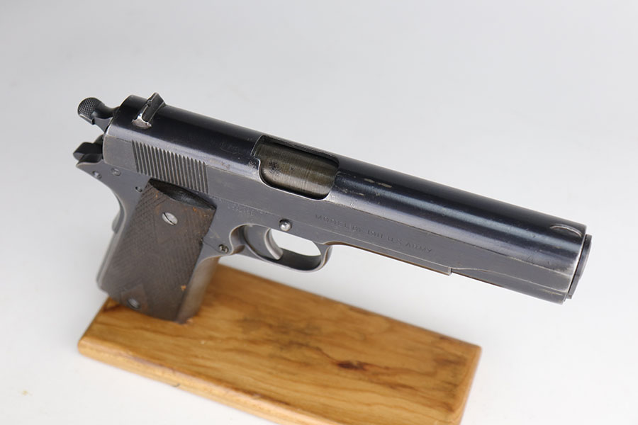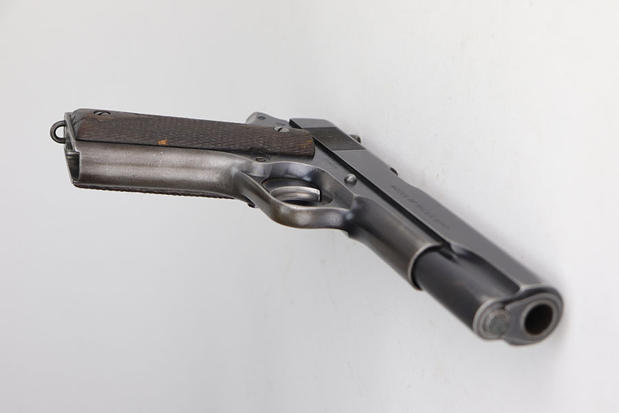 11/10/20 – This is an original Colt M1911 from 1918 that was issued to the US Army. It has a very nice profile with standard high edge wear on the slide, but vast majority of the finish loss is on the grip frame. Barrel is a correct intertwined H P proof, visible in the ejection port. Proper inspector marks on frame – Springfield eagle. Excellent grips with no major issues, mostly just handling wear on the right side panel. The magazine is a later example with blued body and lanyard ring. Bore is very good considering the age and it has pronounced rifling and no pitting.