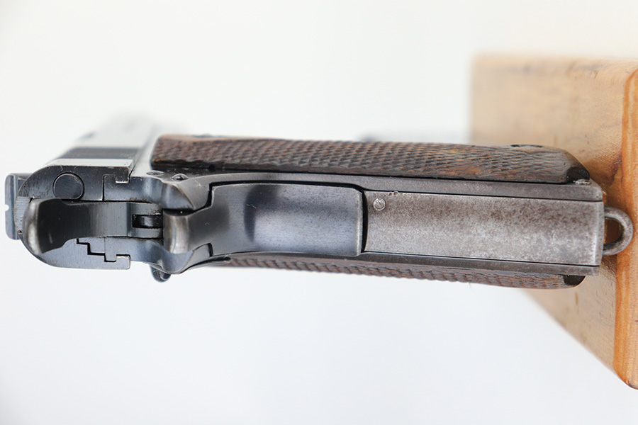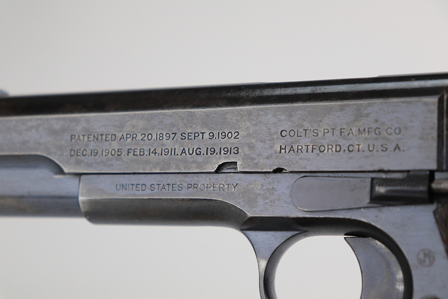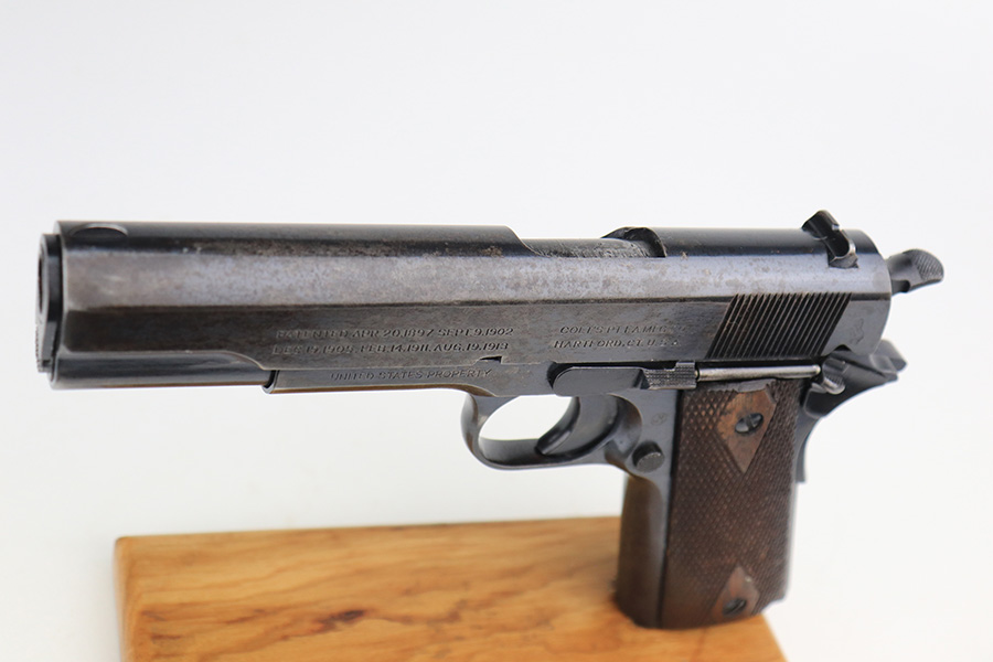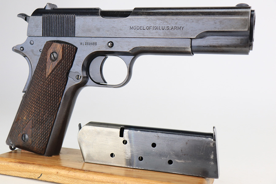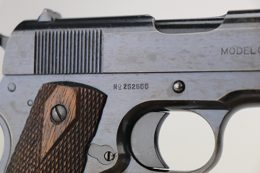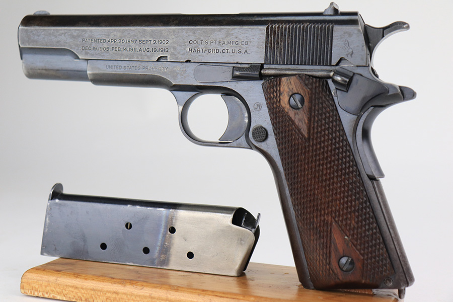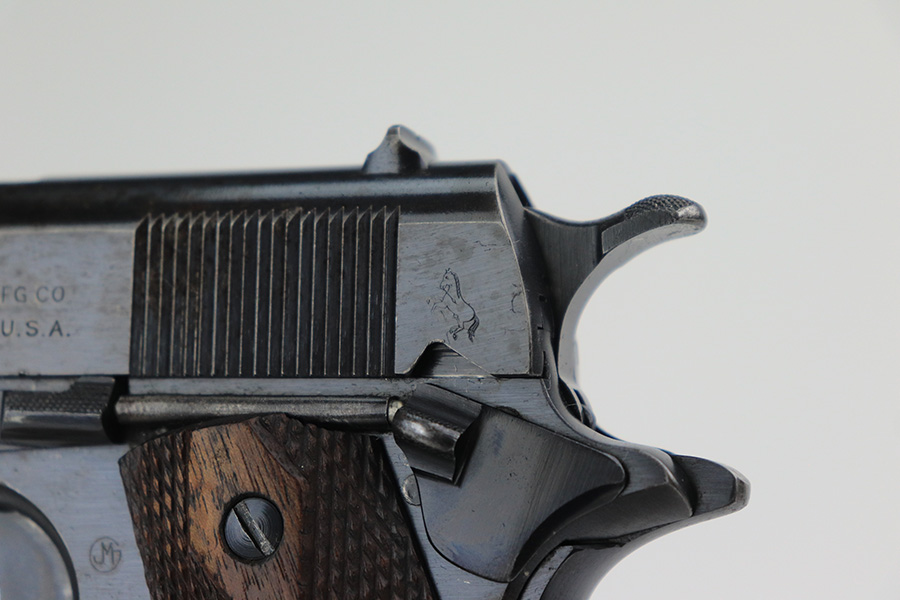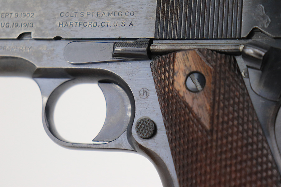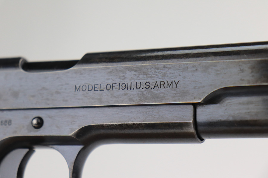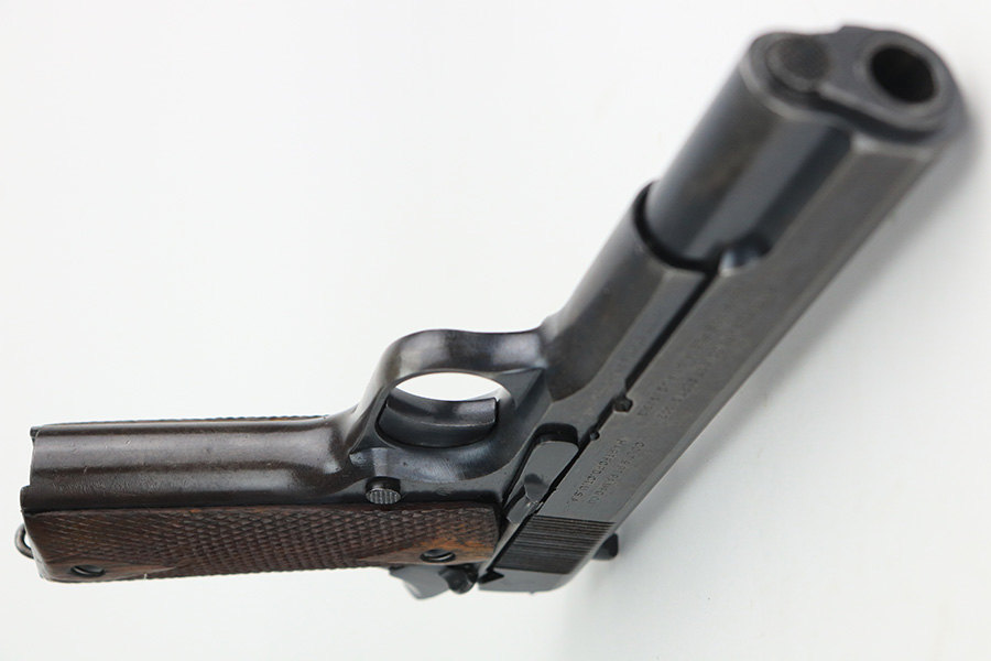 12/10/21 – This is a nice, original Army Colt Model 1911 from 1918. The pistol is all original, including the proper Colt barrel with disconnected ‘H P’ marking. The finish on this one was very difficult to provide a rating for though, as the finish of the slide appears somewhat “splotchy” due to freckling. There is also bluing loss on the front strap and mainspring housing. Very nice grips with minor smoothing but no cracks. Minty bore. Original two-tone magazine.