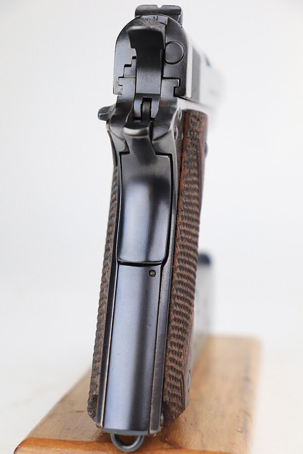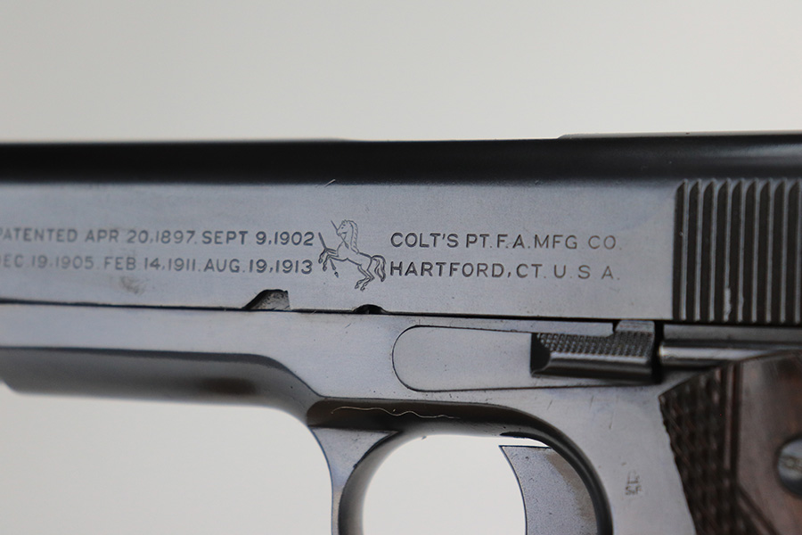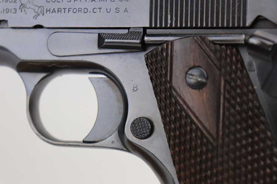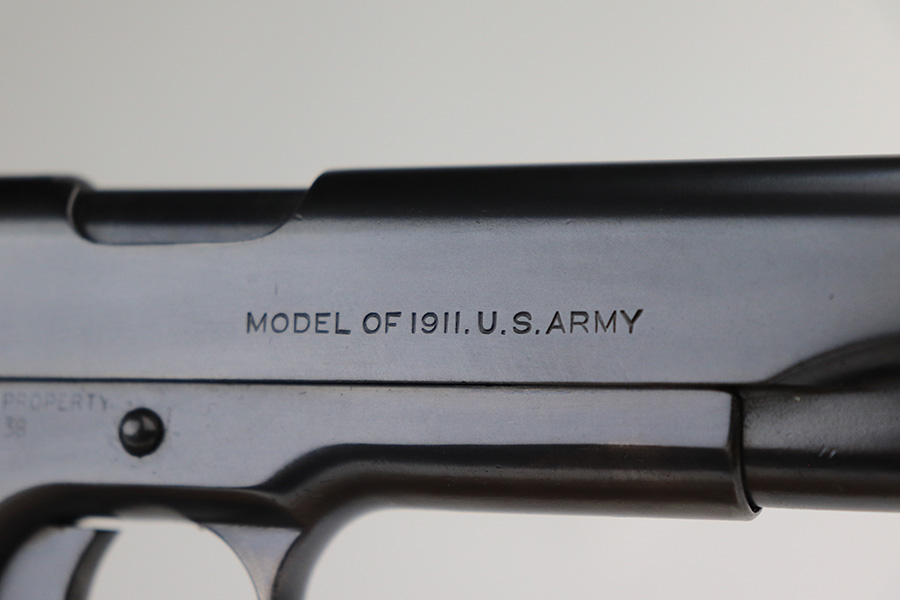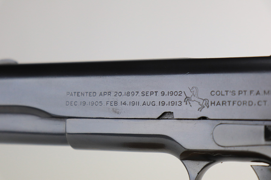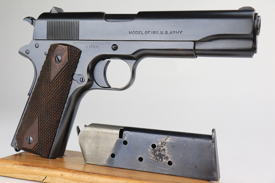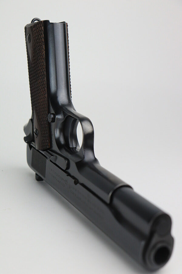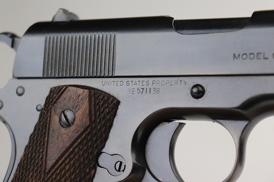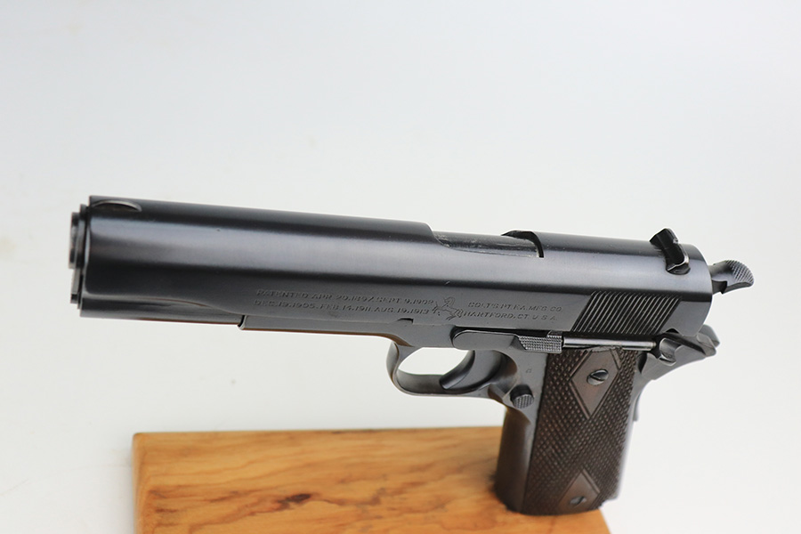 12/13/21 – This is an excellent example of a Colt Model 1911 issued to the US military in 1918. It is “United States Property”-marked and has the proper “Eagle Head S16” military acceptance proof on the left side of the frame. High Standard barrel. The whole gun has been professionally restored, so the finish is beautiful. It has retained virtually all of its new bluing. It comes with minty replacement wood grips and a proper two-tone magazine. The bore has good rifling with very minor pin-pricking throughout.