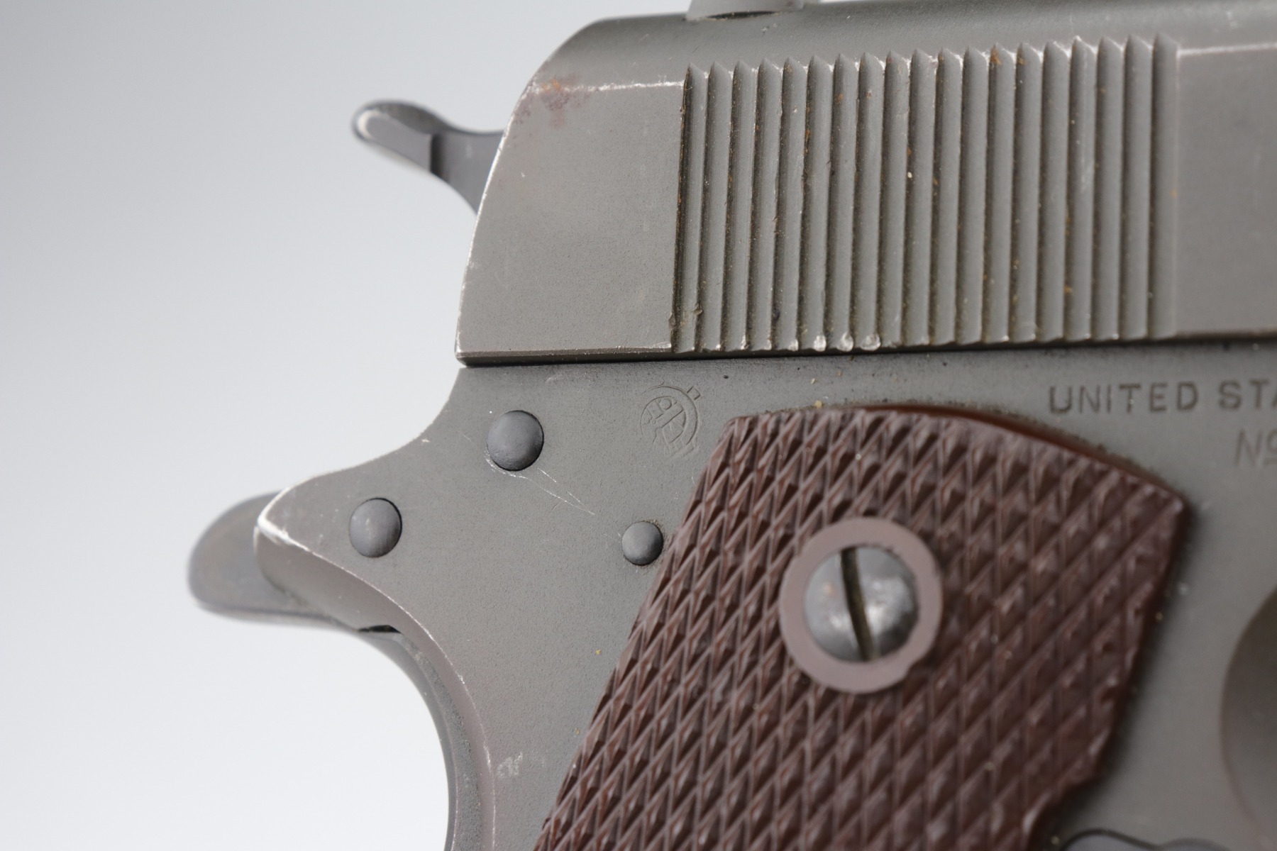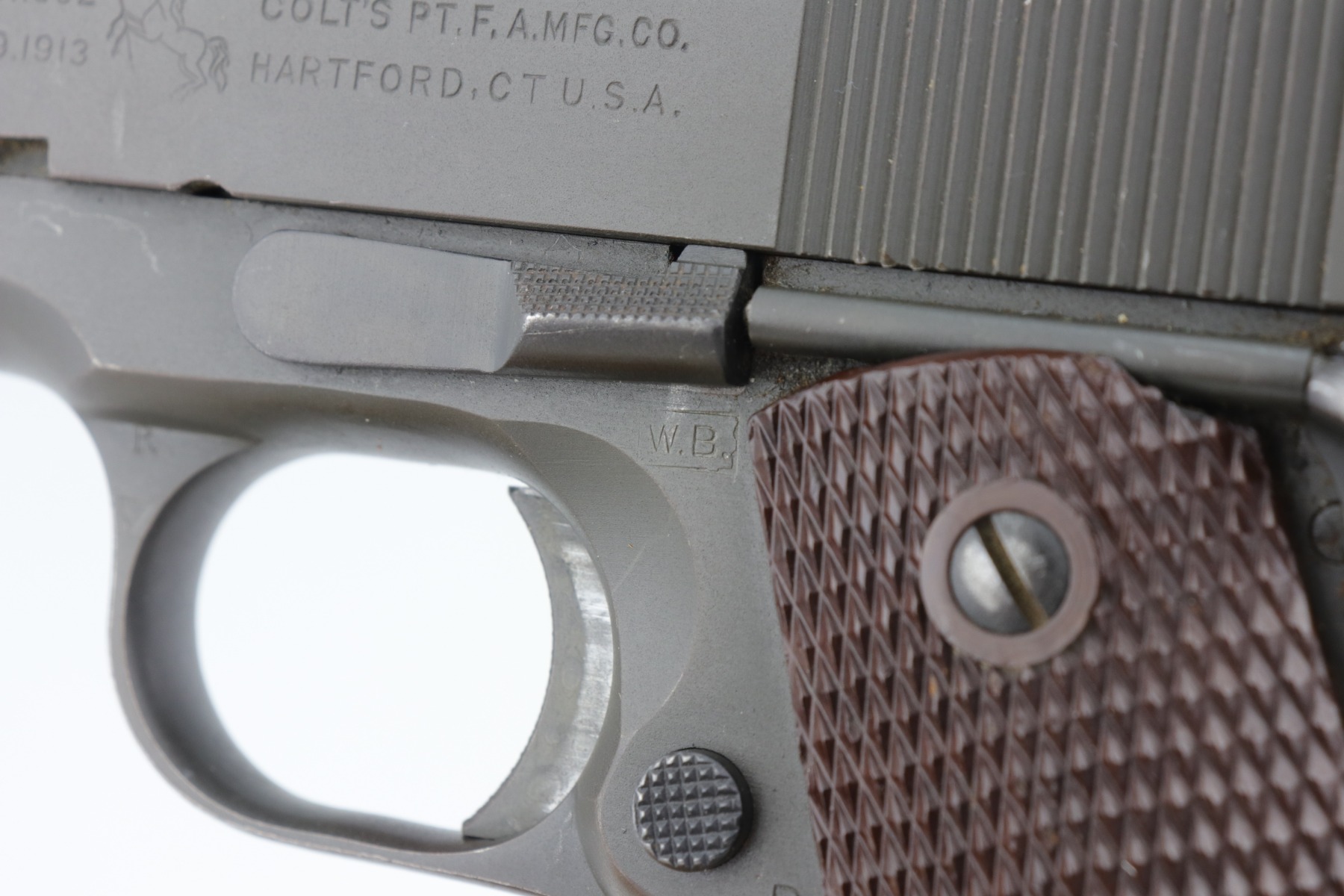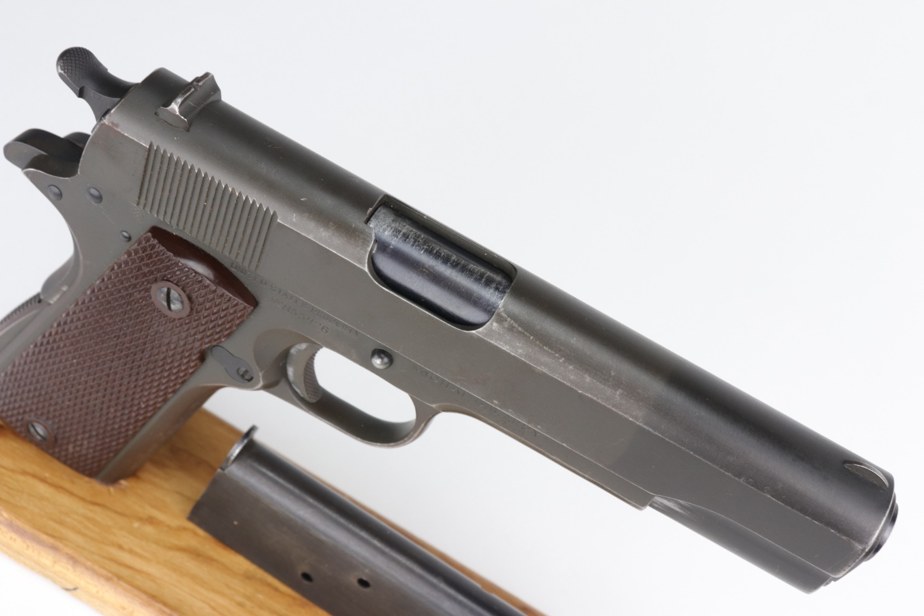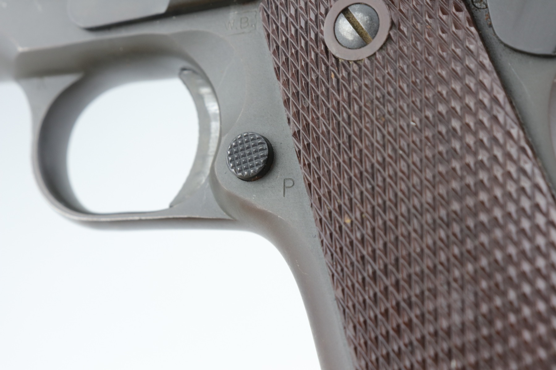 12/30/22 – This is a very nice example of a Colt 1911A1 issued to the US military in 1942. It is all correct and has a “United States Property” marking and a military cross canon cartouche. It has a Colt .45 barrel with a large “G” under the lug. The slide is numbered and matches the frame. It has retained about 90% of its parkerized finish. There is minor wear around the muzzle, high edges, underside of the frame, and front strap. There is some spotty wear on the top of the slide. There is patina on the front strap. It comes with excellent grips and a proper magazine. The bore is excellent -shiny with strong rifling.