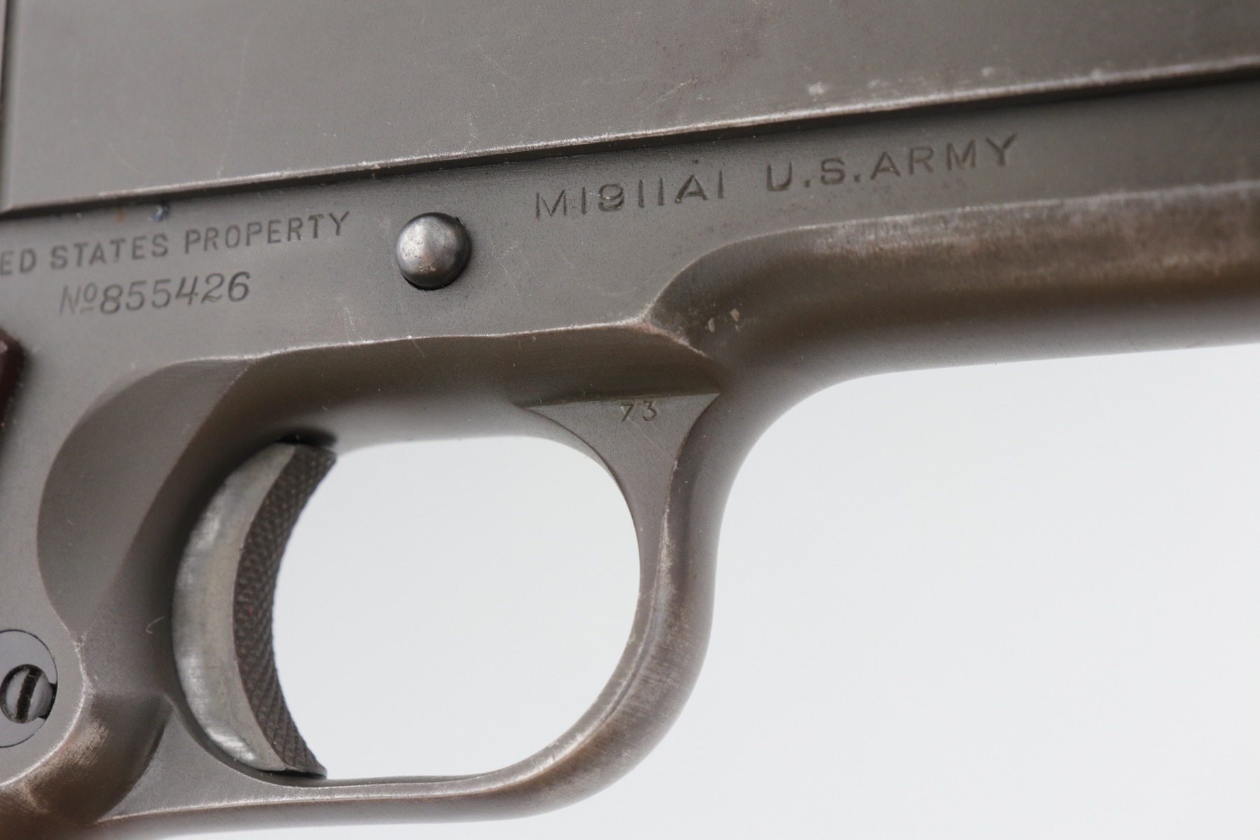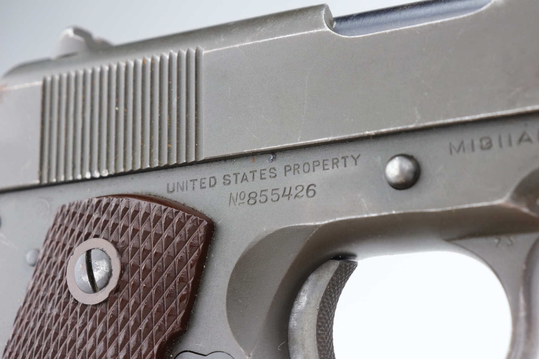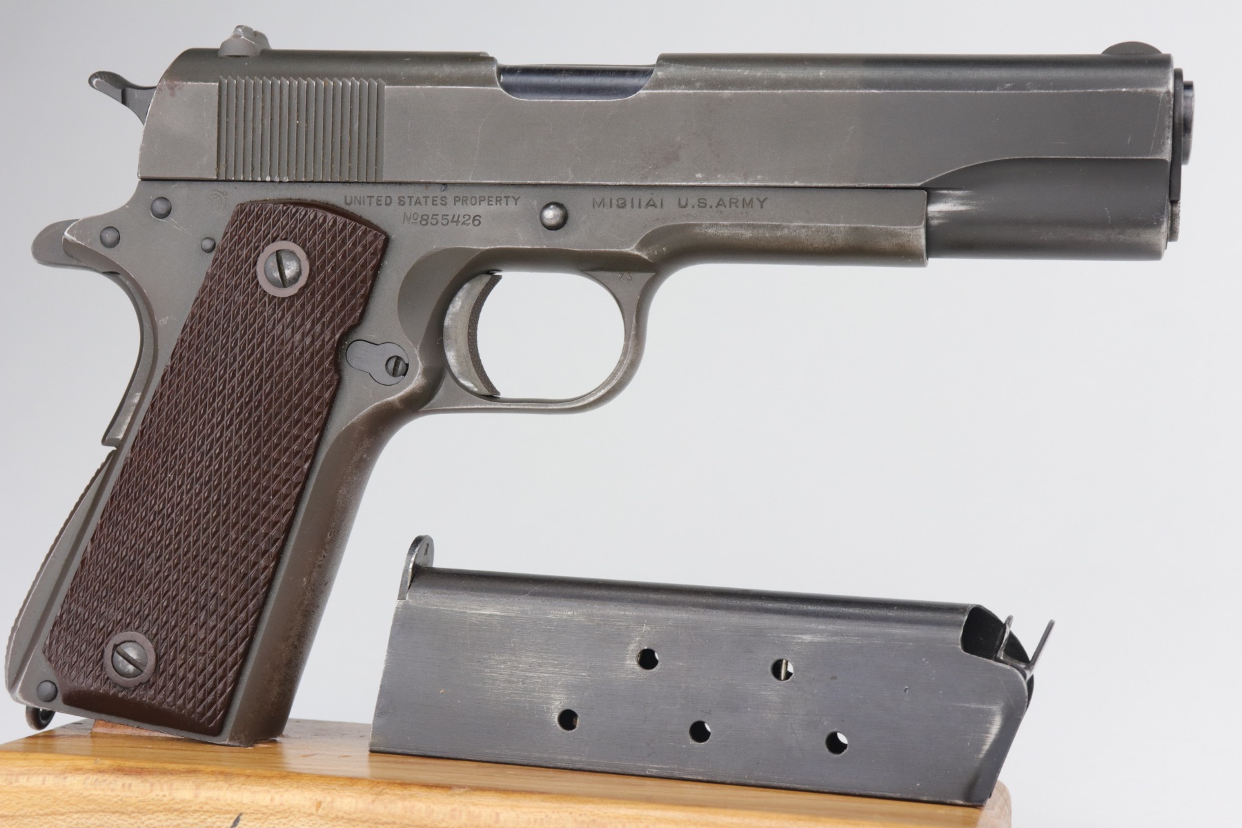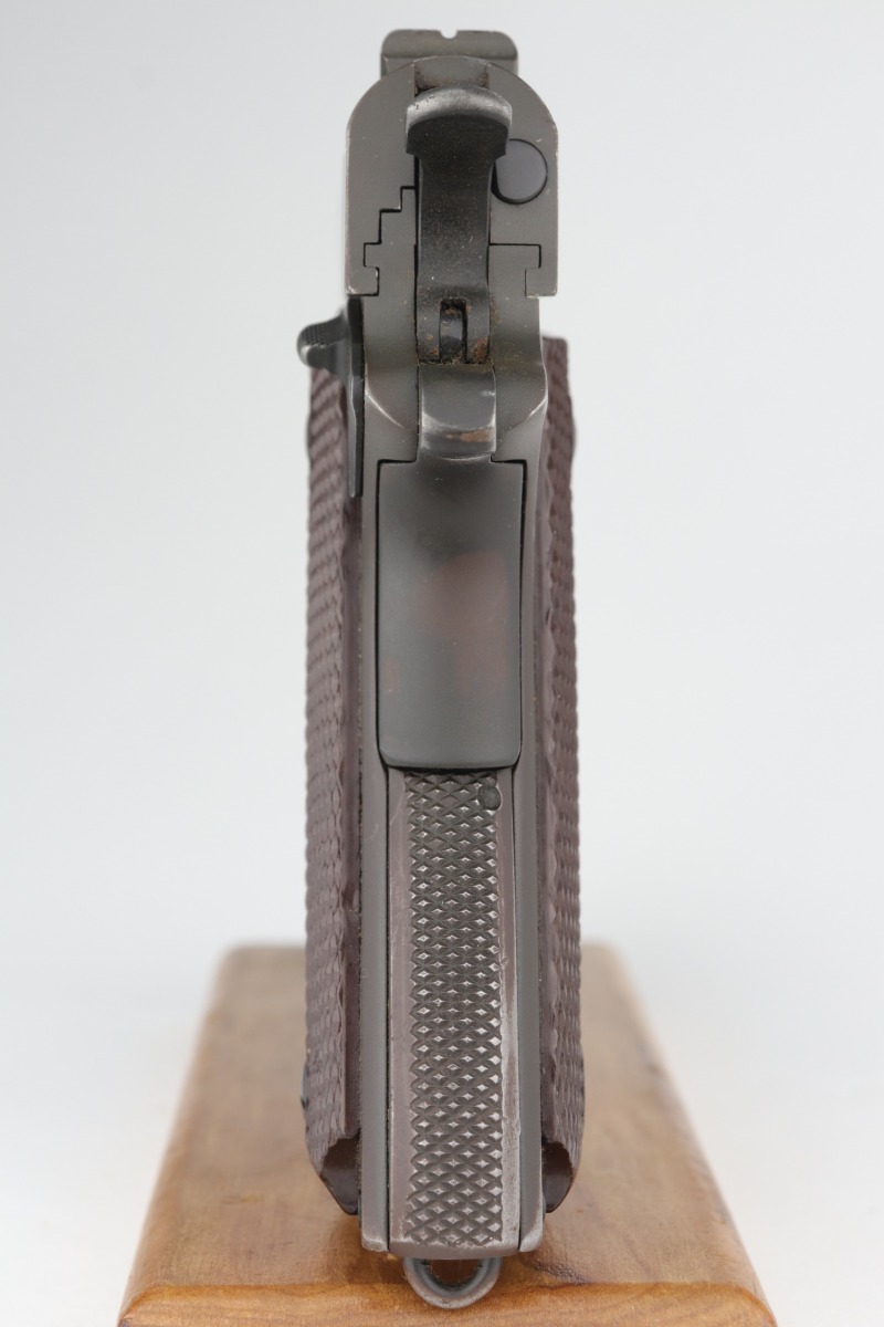12/30/22 – This is a very nice example of a Colt 1911A1 issued to the US military in 1942. It is all correct and has a “United States Property” marking and a military cross canon cartouche. It has a Colt .45 barrel with a large “G” under the lug. The slide is numbered and matches the frame. It has retained about 90% of its parkerized finish. There is minor wear around the muzzle, high edges, underside of the frame, and front strap. There is some spotty wear on the top of the slide. There is patina on the front strap. It comes with excellent grips and a proper magazine. The bore is excellent -shiny with strong rifling.